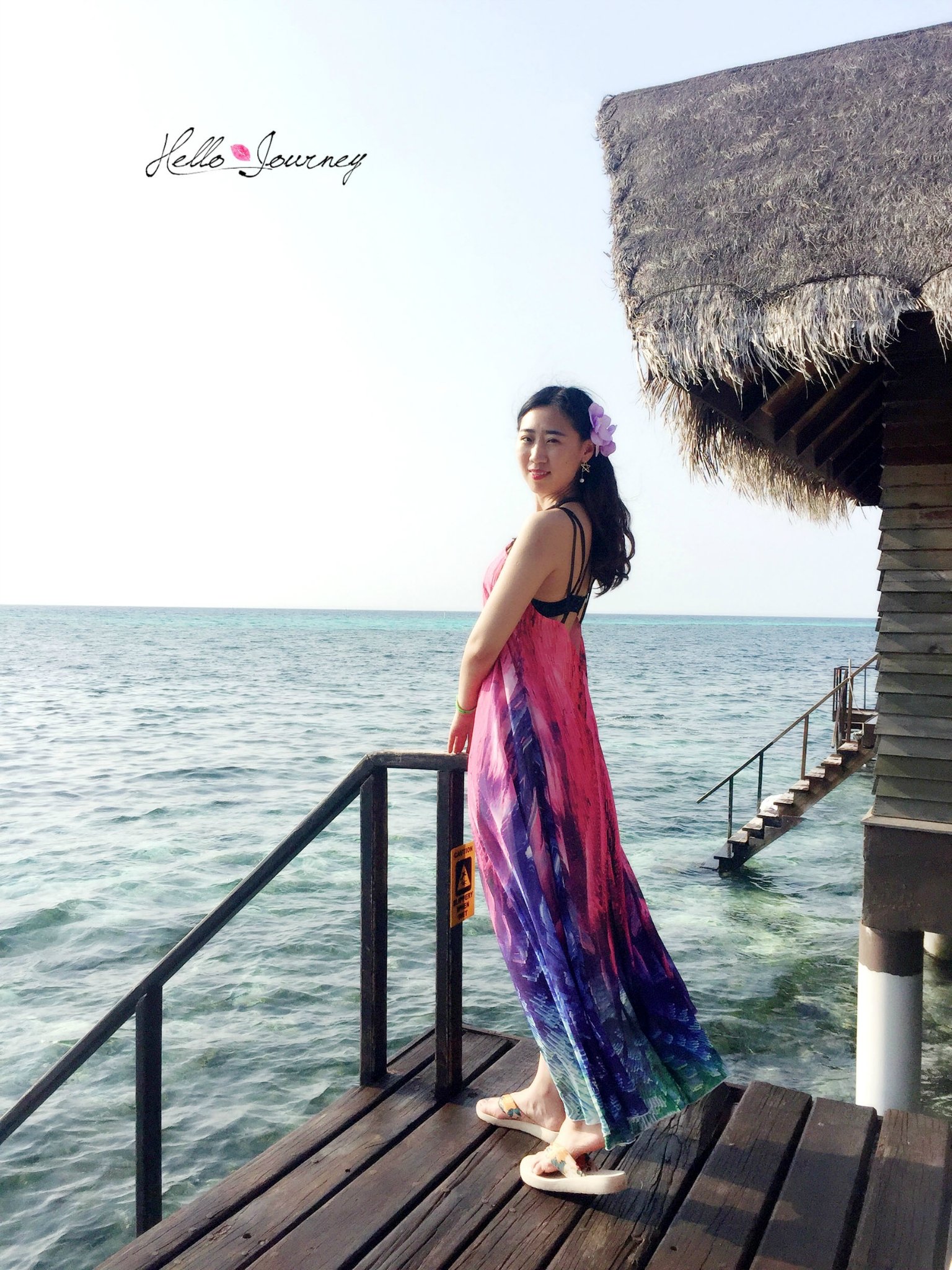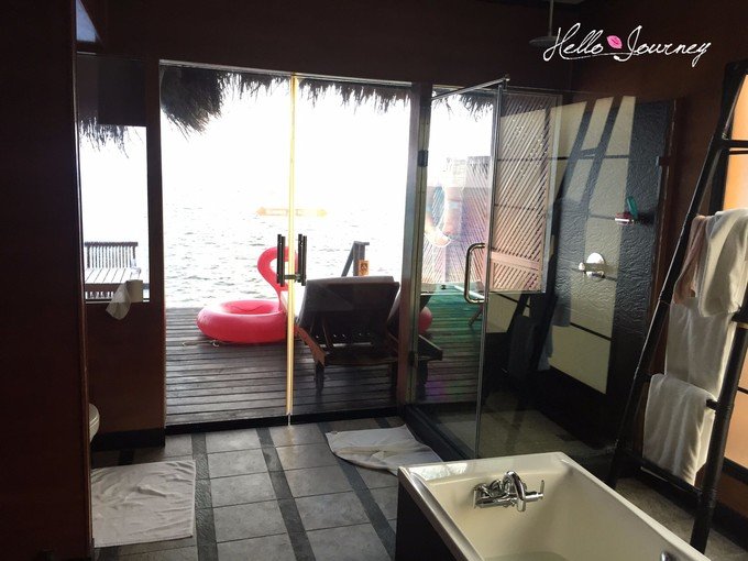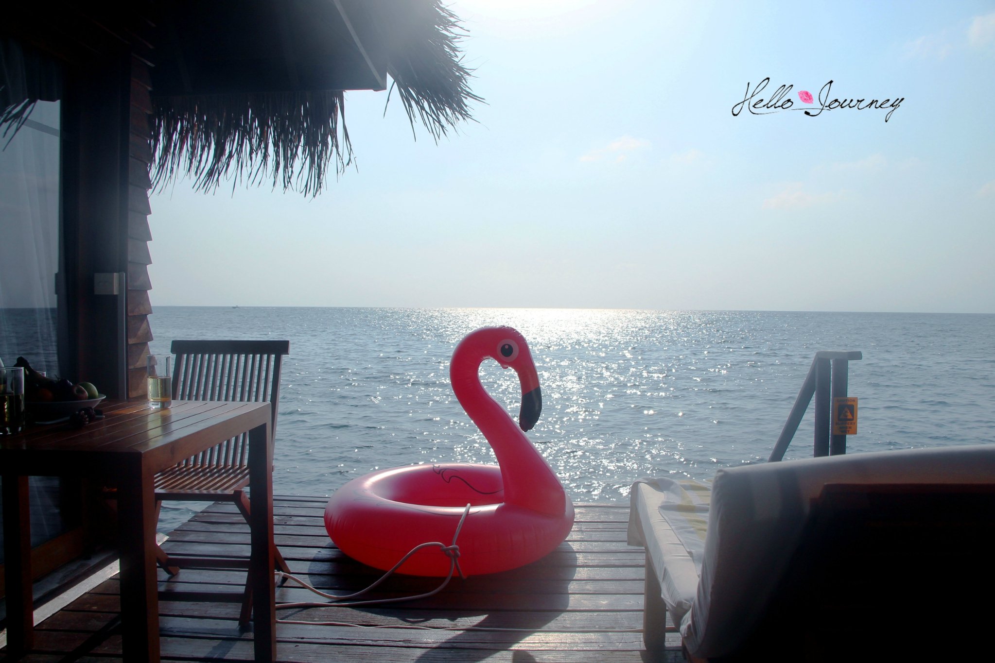 海洋别墅独立于小岛之外,有一条木栈道相连,距离岛还挺远的,立在浅滩上,私密性也比较好