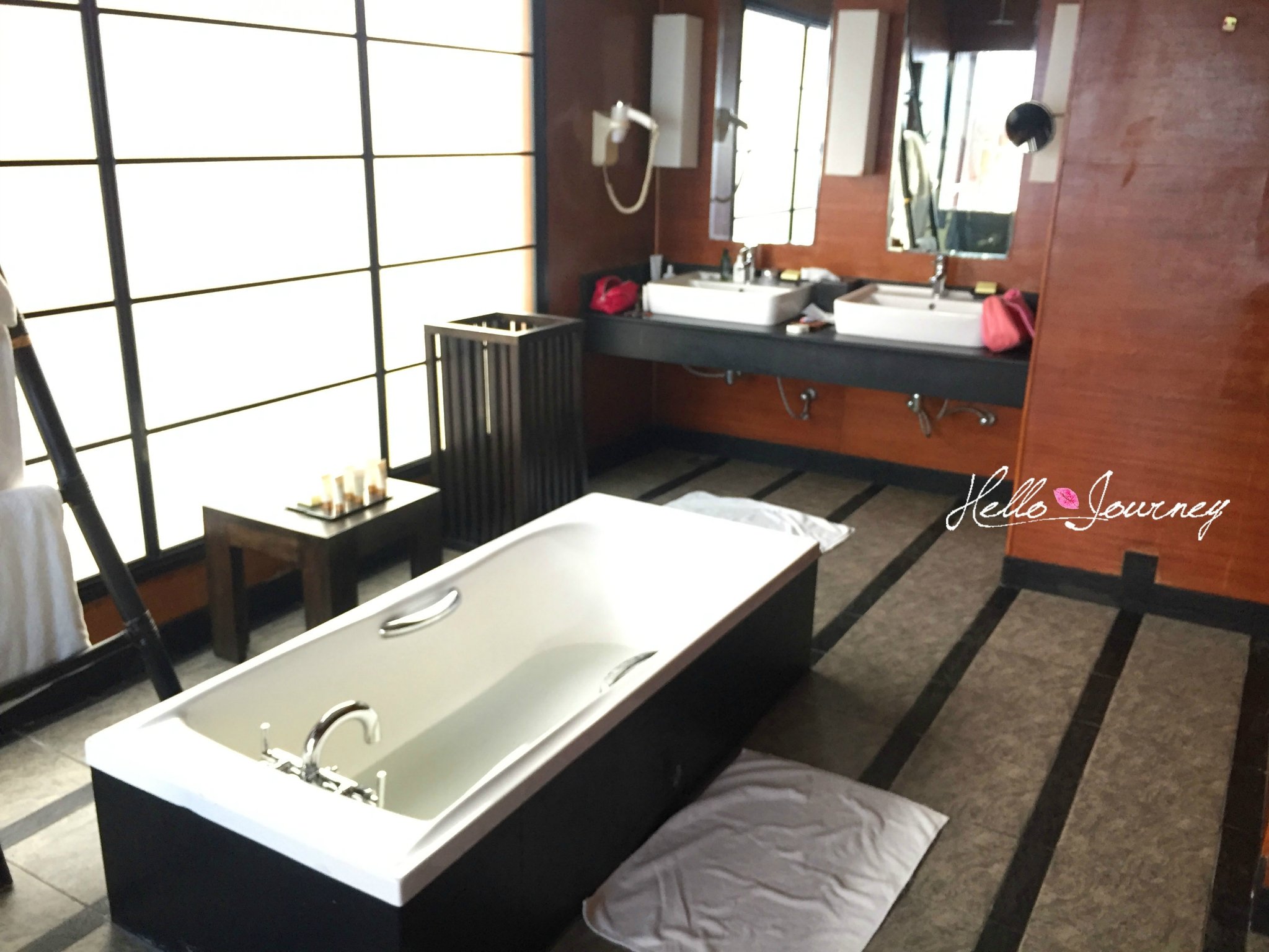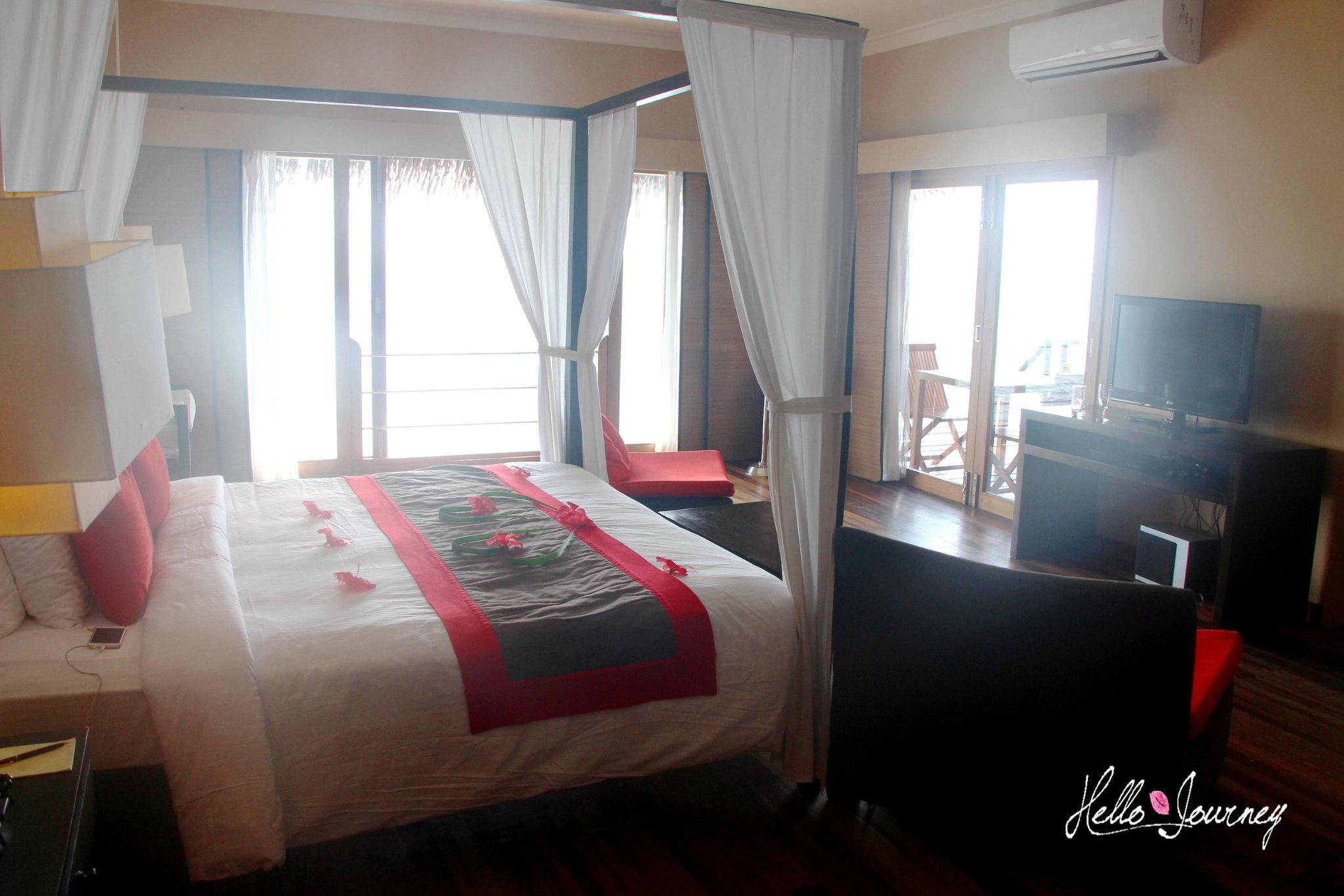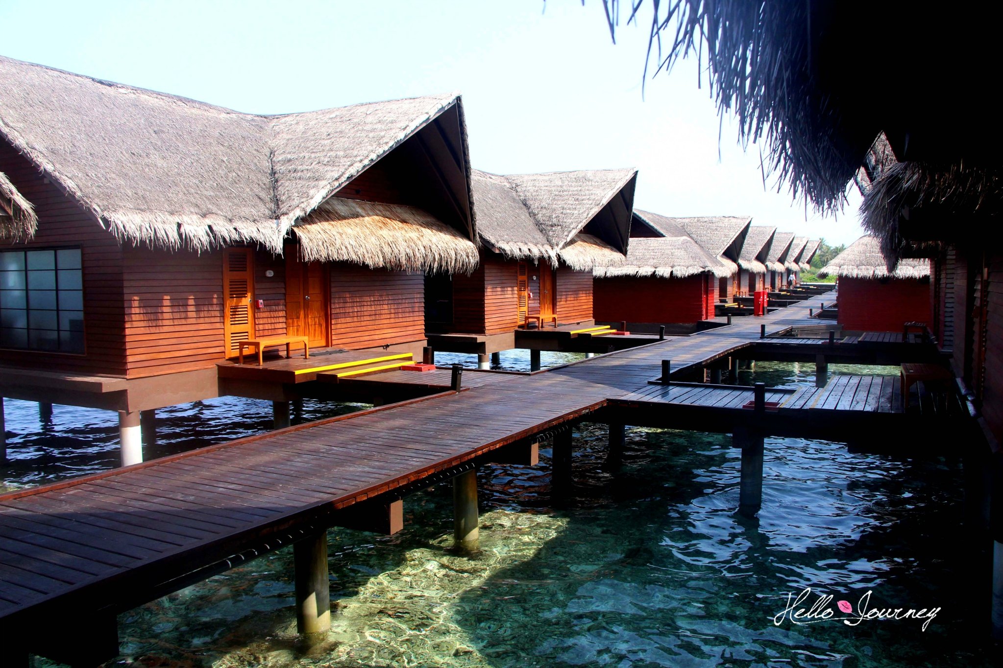 海洋别墅独立于小岛之外,有一条木栈道相连,距离岛还挺远的,立在浅滩上,私密性也比较好