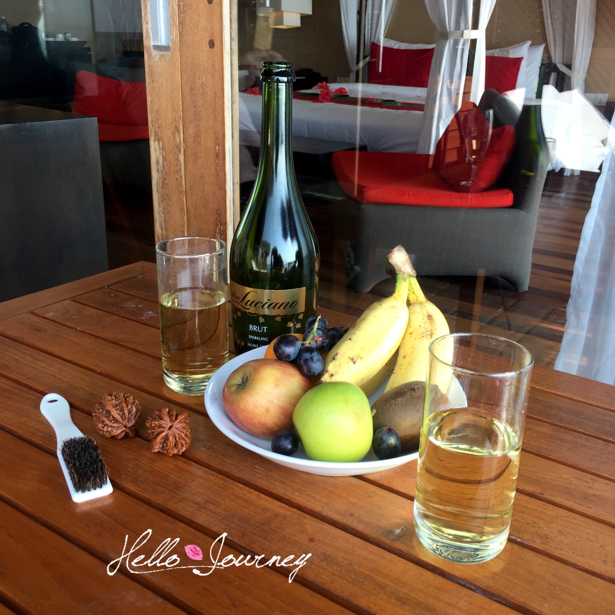 竟然还送了蜜月酒和果篮,PS:不包括旁边的核桃 那是丁先森走到哪带到哪的文玩核桃~~