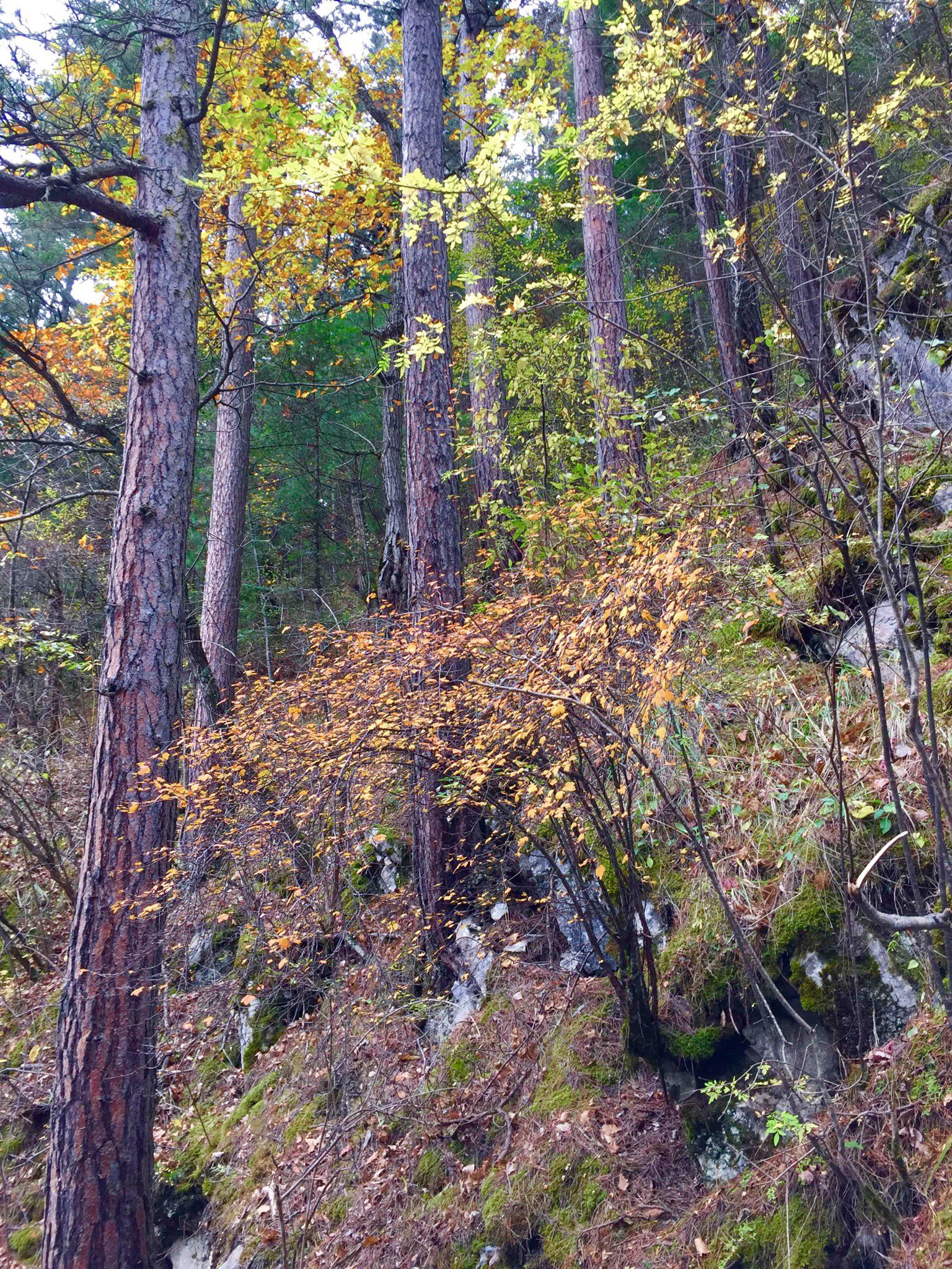 位于树正瀑布之上,它近旁的树正瀑布水声如雷,宛若虎啸;每逢深秋到来,湖岸山上层林尽染
