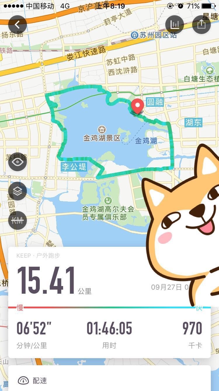 6:30:尬湖之早起环金鸡湖跑,全程15公里。