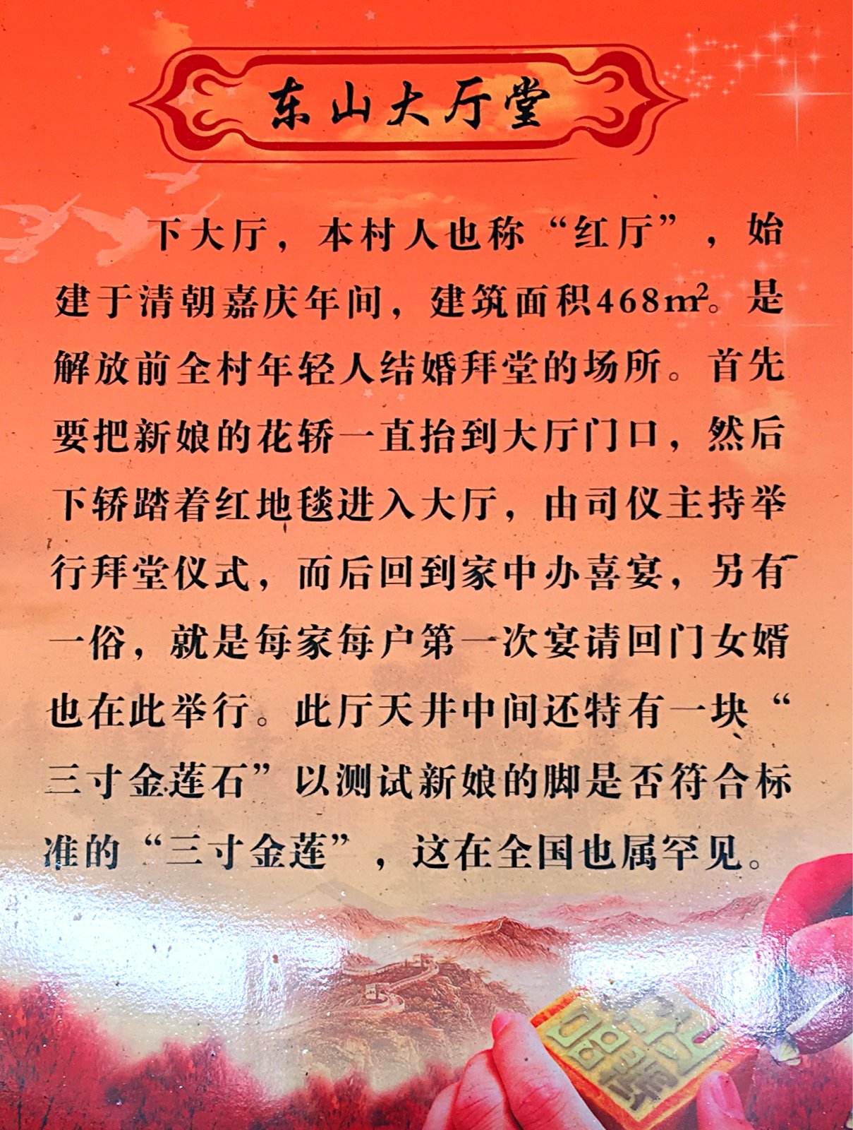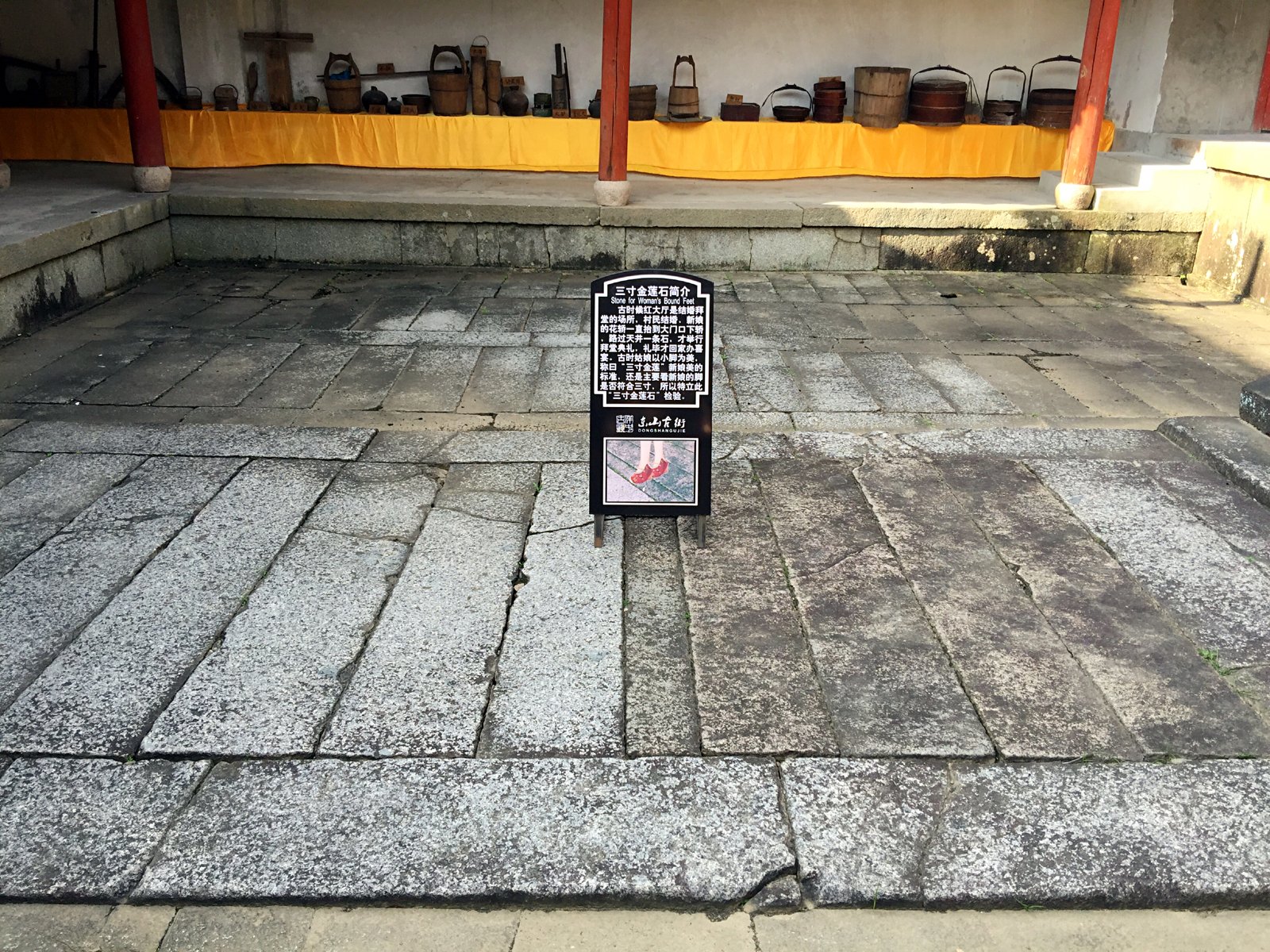 石阶梯中有三寸金莲石,用来看新娘的脚是否符合三寸金莲的标准。