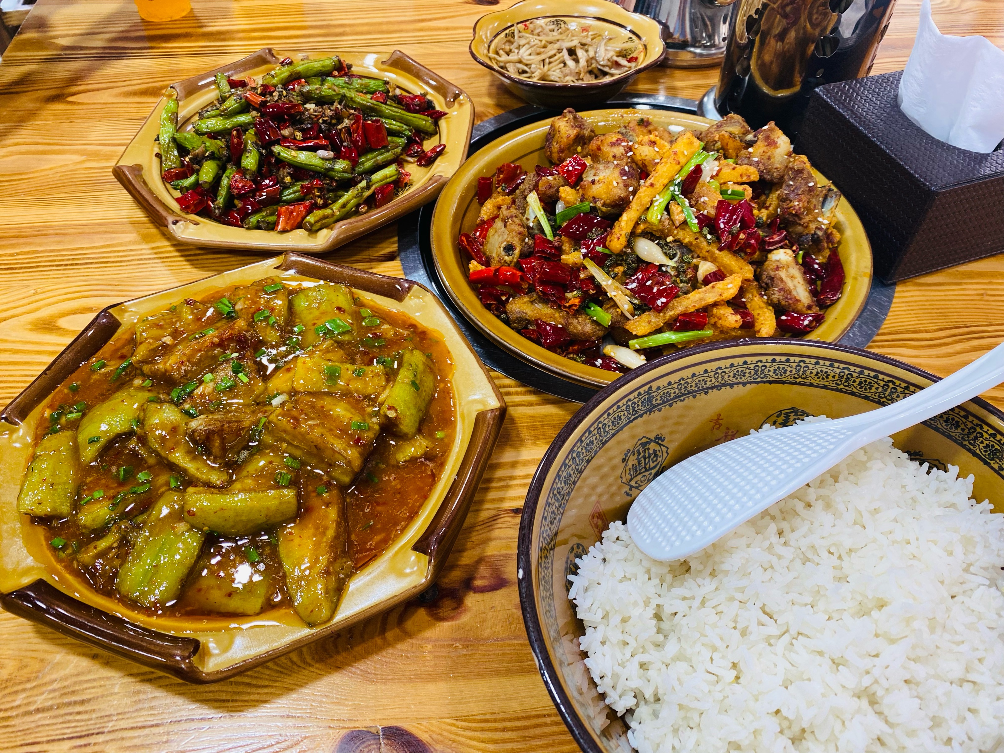 【红烧茄子、香辣排骨、干煸豆角】一共97,米饭给了一盆,离景点很近,在一个加油站旁边,有停车场,推荐