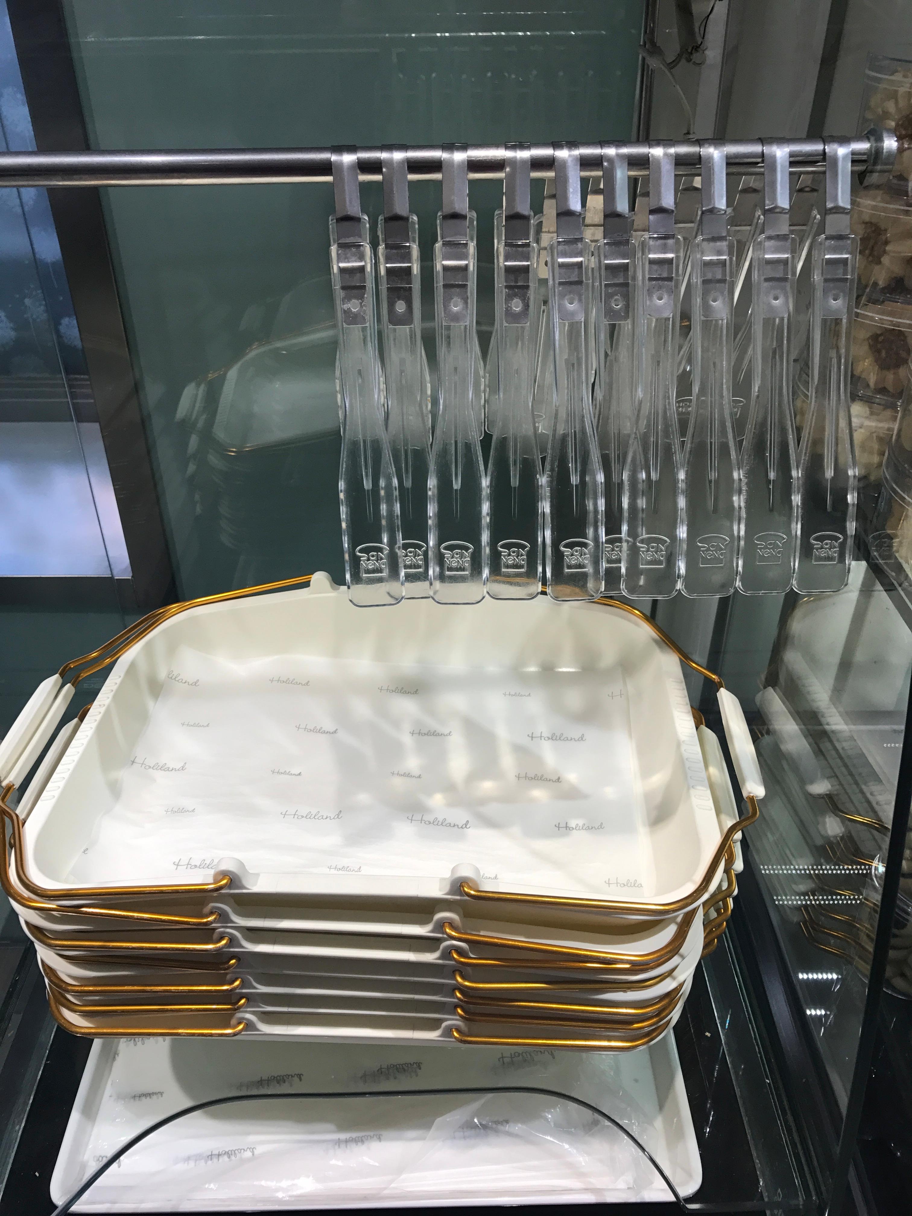 【店内装修】整个店铺的感觉都是整洁明亮,让人一进入就有一种很好的心情。蛋糕和面包分类摆放的很整齐,还有一整个柜台的试吃,各种口味的半熟芝士和青森芝士条都是超级棒的选择。角落处放着托盘和夹子,看起来很精致的白色托盘,金色的提手装饰,感觉很小资。