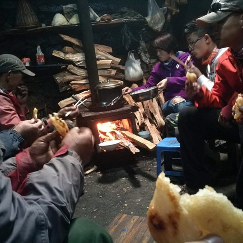 哈巴雪山的住宿条件在雪山大本营中号称是五星级的,有水、电,高低铺,每间能住10人,人少的时候也就两三人住一间了。晚上盖着被子也不怎么冷。充电在厨房火塘旁,水也很充足,厨房锅炉旁有水管可以接水刷牙。牛栏往前走一点有很多石头的地方移动信号还不错,可以发微信。