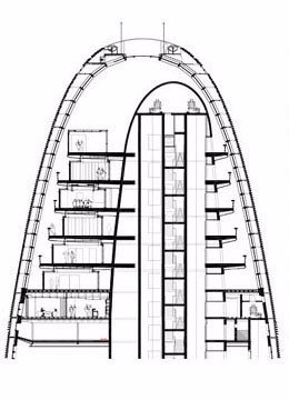 阿格拔塔高达142m,地面有135层,地下4层,顶层是玻璃圆顶。整座大楼建筑面积达39,000 m²,其中办公用面积占30,000 m²。这项工程非常壮观:大厦拔地而出,直入云霄,宛如一颗参天大树。每层楼的平面各异,窗户布置不拘一格。这说明该塔在施工过程中需要多次进行结构上的计算。建筑由2个不同心的椭圆柱体组成。楼梯、服务电梯和建筑服务设施都位于这座摩天大楼的核心部位。开敞式平面布置的办公室在内外柱之间。混凝土外墙盖上抛光的铝板,并涂成40种不同的颜色。外墙整体包裹将近60,000个透明和半透明玻璃百叶窗。近看时,熠熠发光,如同爬行动物的外壳;远看则如晶莹的流体,颜色随光线而变幻无穷。入夜时分,满天灯火,整个大厦五彩斑斓,光彩夺目。 它既不是塔,也不是摩天大楼,在一个平静的城市中,它是一个独一无二的形体,象是破土而出的一股间歇喷泉。建筑的表面被透明、浅色、发亮的材质覆盖着,仿佛被水冲刷过一般光滑、连续、富有活力。它从土中长出,却没有石头的沉重感。