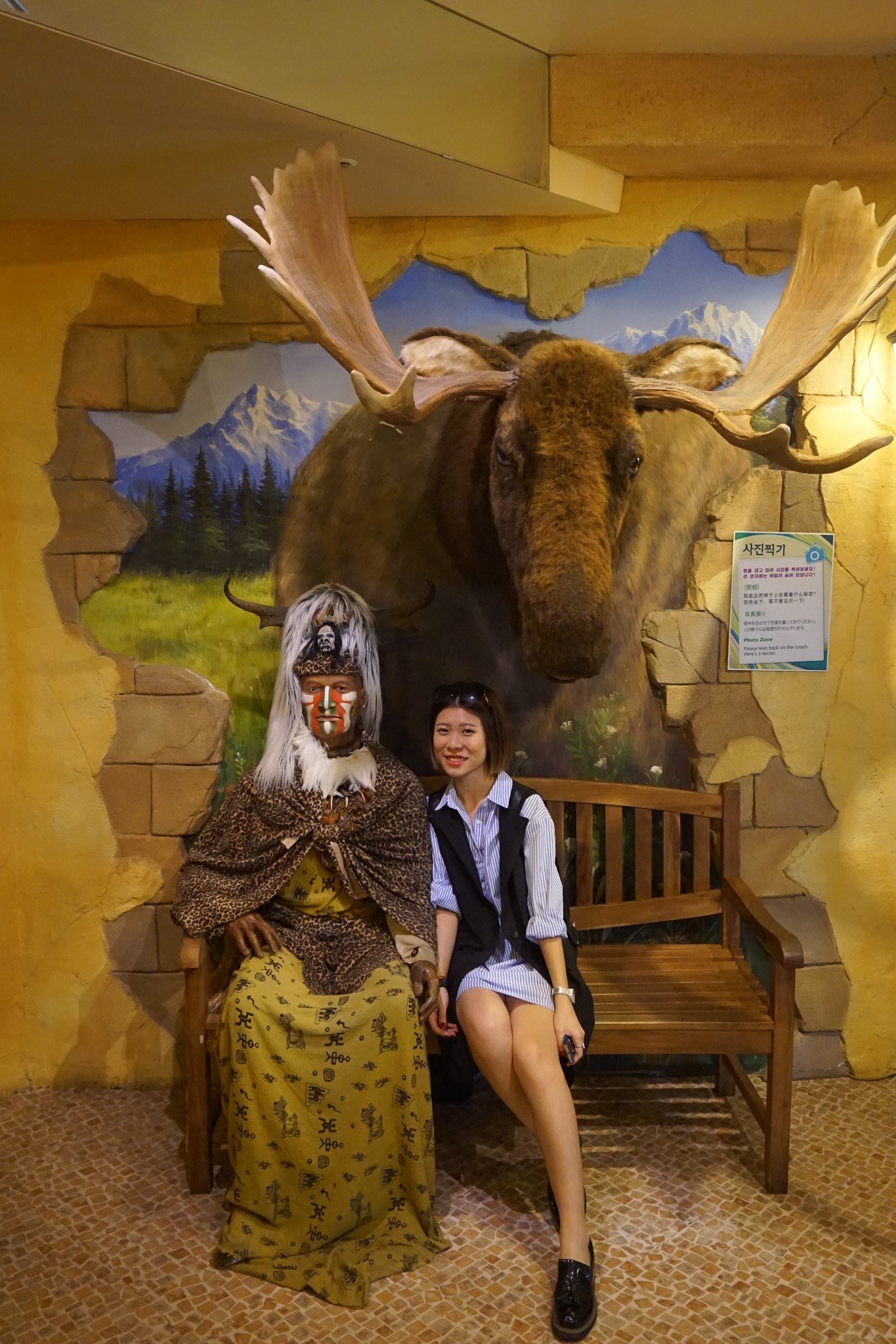 看到墙上写着:坐下来试试。但是看到前面的人坐下去都没有什么反应,轮到我的时候,其实一开始我只是为了拍照所以想把头靠在那个人的肩膀上,结果我头碰到他的时候他的头居然转向了我,上面的动物居然也在动,我被吓到了。