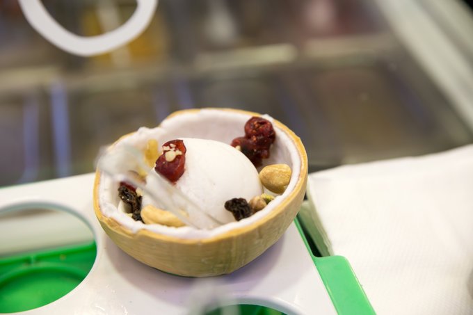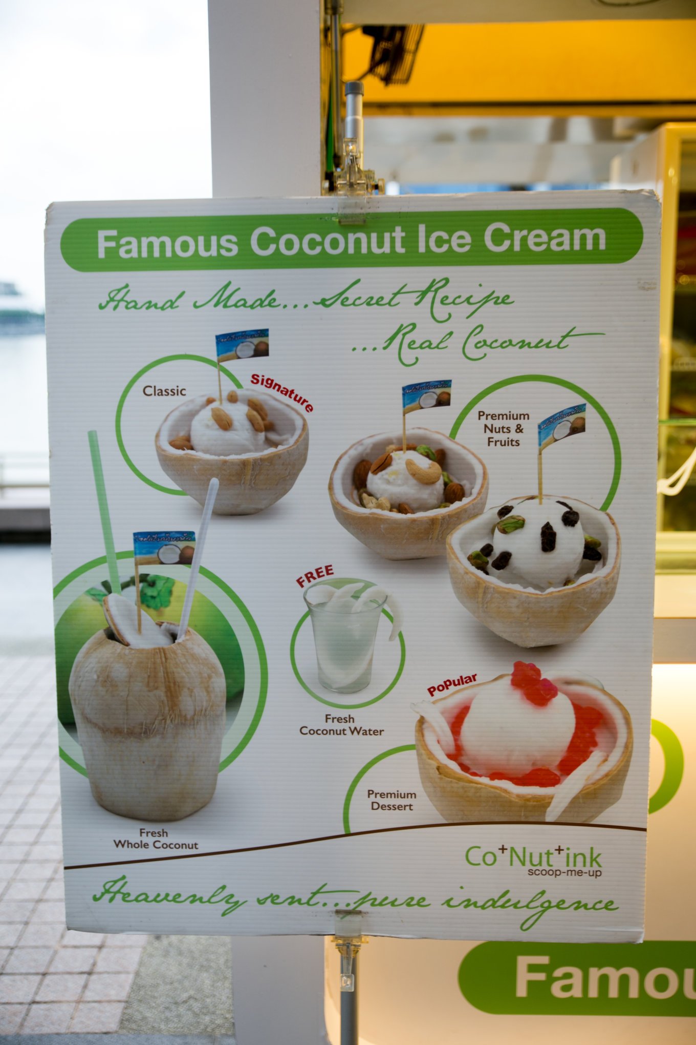 甜品铺就在滨海湾,看完鱼尾狮后,走过一座桥右拐就到。去年我无意中吃到满是惊喜,今年带领着两个小伙伴再去光顾。椰子壳内躺着椰子味的冰淇淋,上面淋上不同的辅料,附送椰子肉和椰子水。