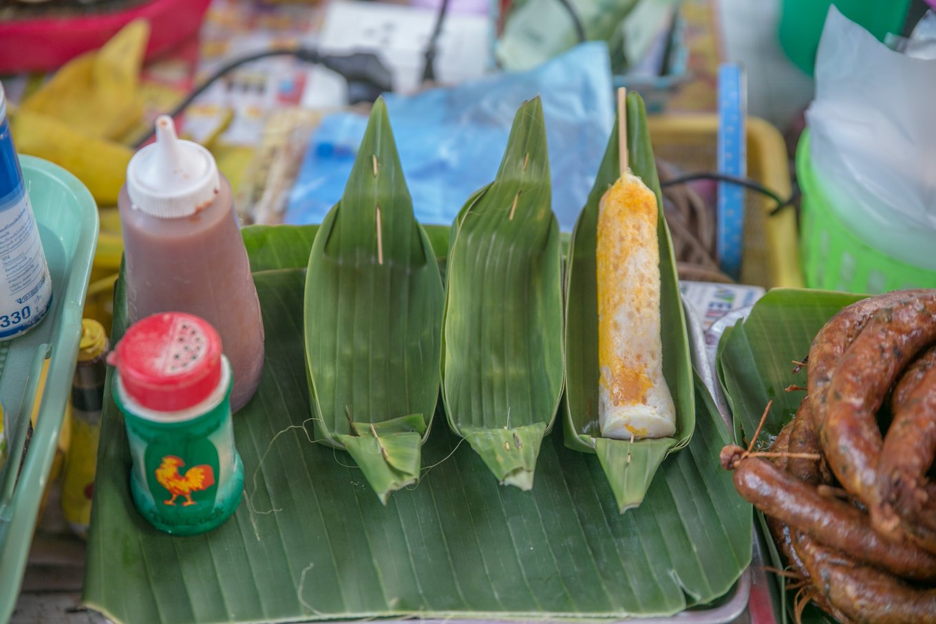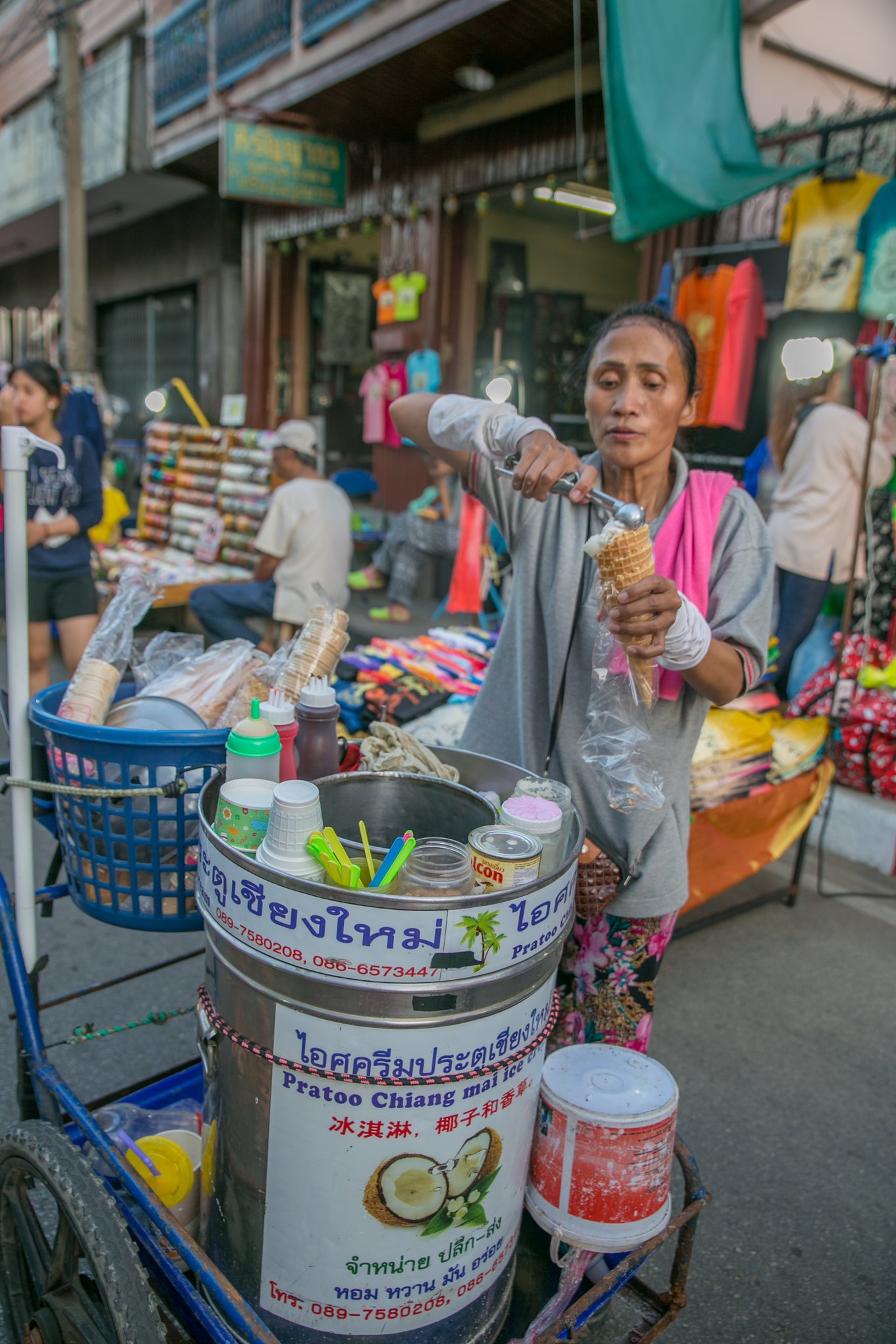 非常非常非常好吃的椰子冰淇淋!看到千万不要犹豫,去买了吃啊!外面是椰子壳,里面是冰淇淋配椰子果肉这样的组合,我不是第一次吃,上次在新加坡就爱上了,但是!新加坡小椰壳配一个球要5新币 (25人民币)!这里三个球放在大椰子里面,还免费选配三种辅料,才30泰铢 (5.5人民币)!这是我在周六夜市上最美好的回忆了,周日夜市没有找到我还一阵失落。
