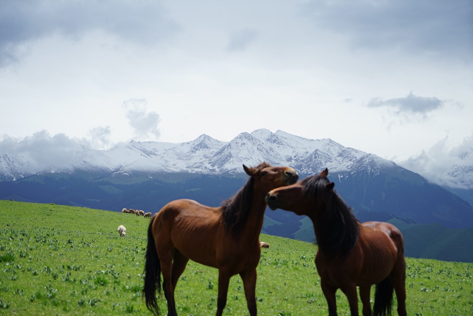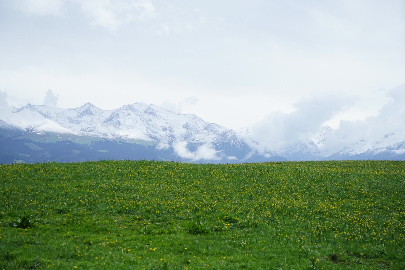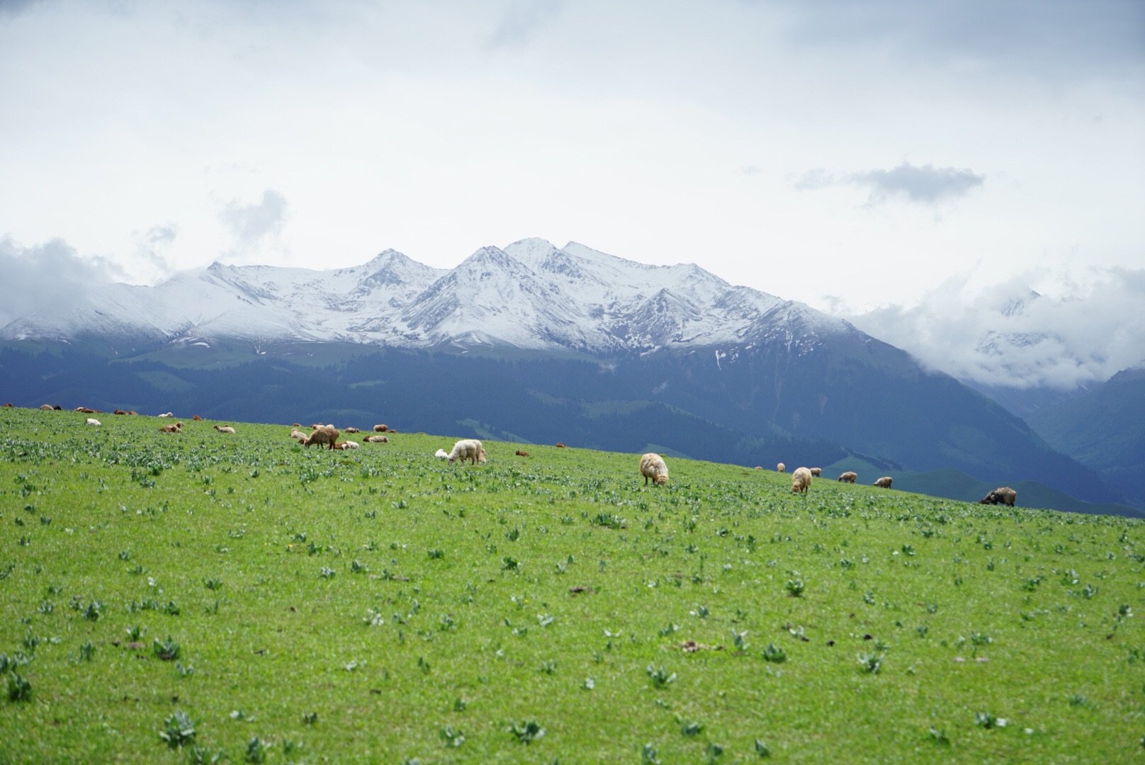 四周终年不化的雪山,环绕着一片海拔2000多米的空中草甸,绿草如茵,牛羊遍地。哈萨克牧民策马奔腾在缀满鲜花的辽阔原野,雪山近在眼前,云儿触手可及,一幅田园牧歌的自然画卷扑面而来。