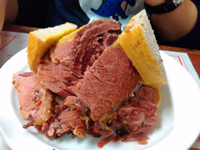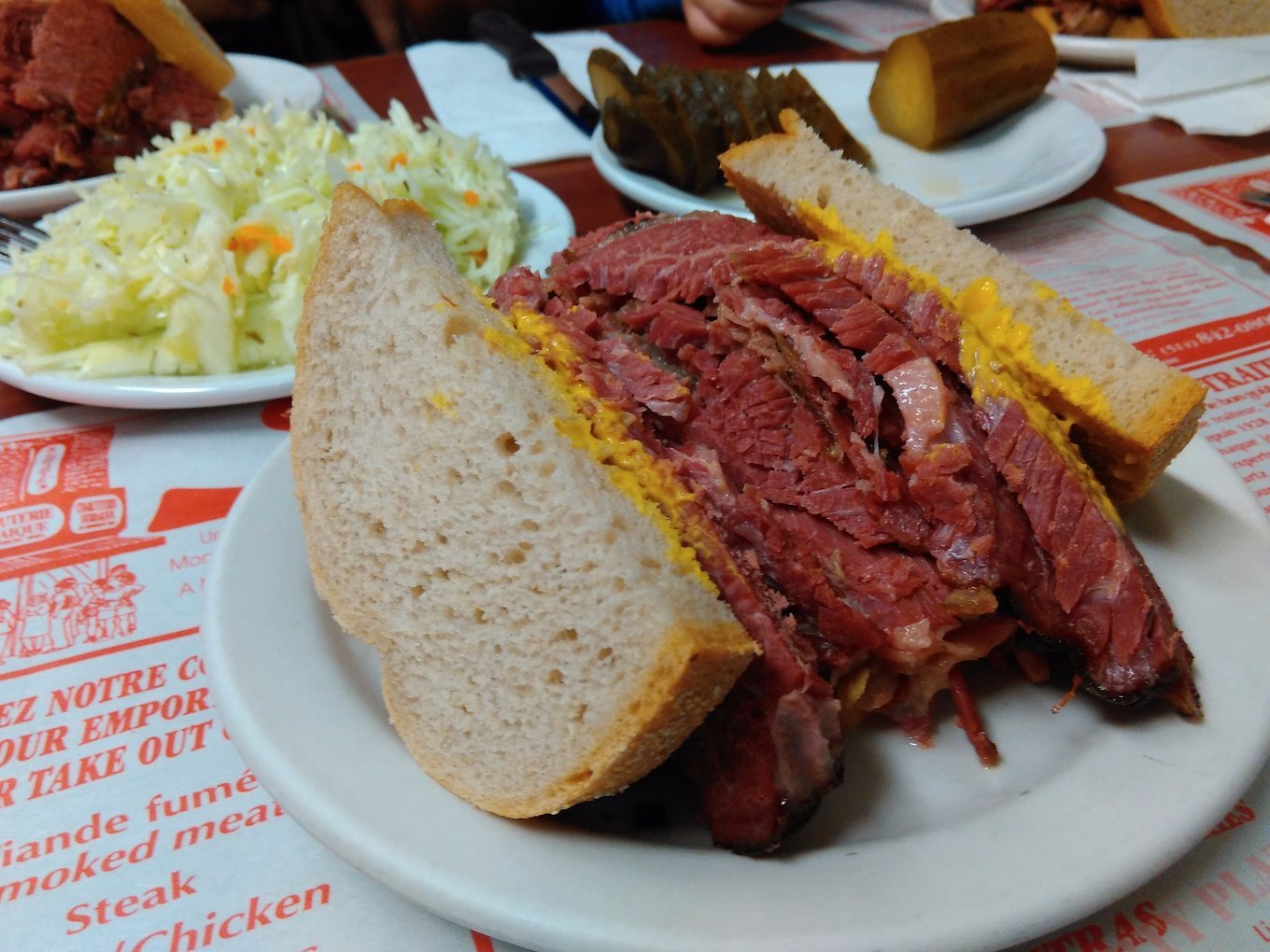 熏牛肉是东欧犹太人带到蒙特利尔的食品,把牛胸部的肉加香料腌制,然后再熏烤,就制成了相位醇厚细腻的熏牛肉。在施瓦茨(Schwartz’s)有一种用熏牛肉、黑面包、腌黄瓜、酸白菜加芥末做成的三明治远近闻名。
