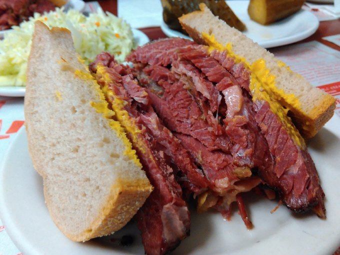 我们点了最为出名的熏肉三明治,外加酸白菜和腌黄瓜作为配菜