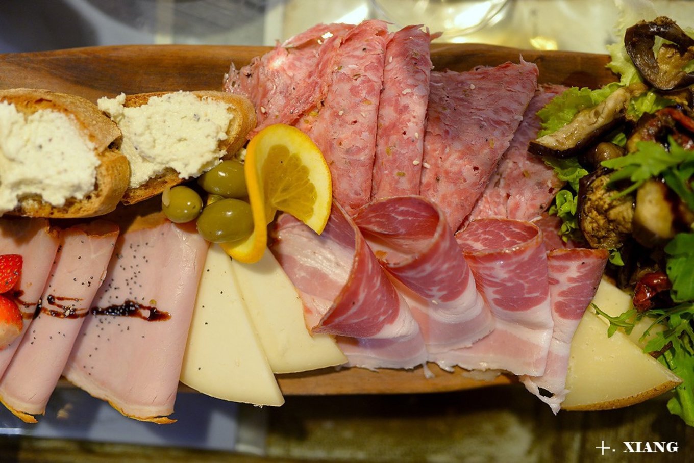 对于他们家的菜单,我表示完全看不懂,于是直接明了地示意,来一份和隔壁桌那两人的同款。食物是用木盘子盛放着,包括各种生熟火腿、奶酪等等。初尝生火腿可能会有心理芥蒂,熟火腿的口感更类似午餐肉和火腿肠。如果你吃不惯生的火腿,那么这家店可能会不太合你胃口。然而这种事情并没有发生在我身上,我对店里的食物表示非常满意。