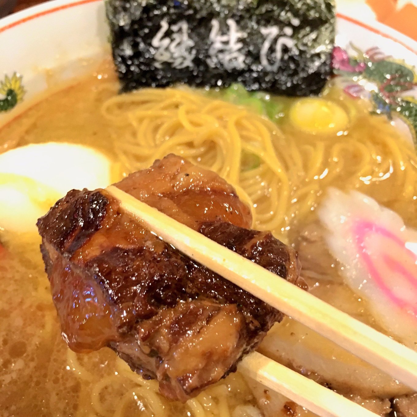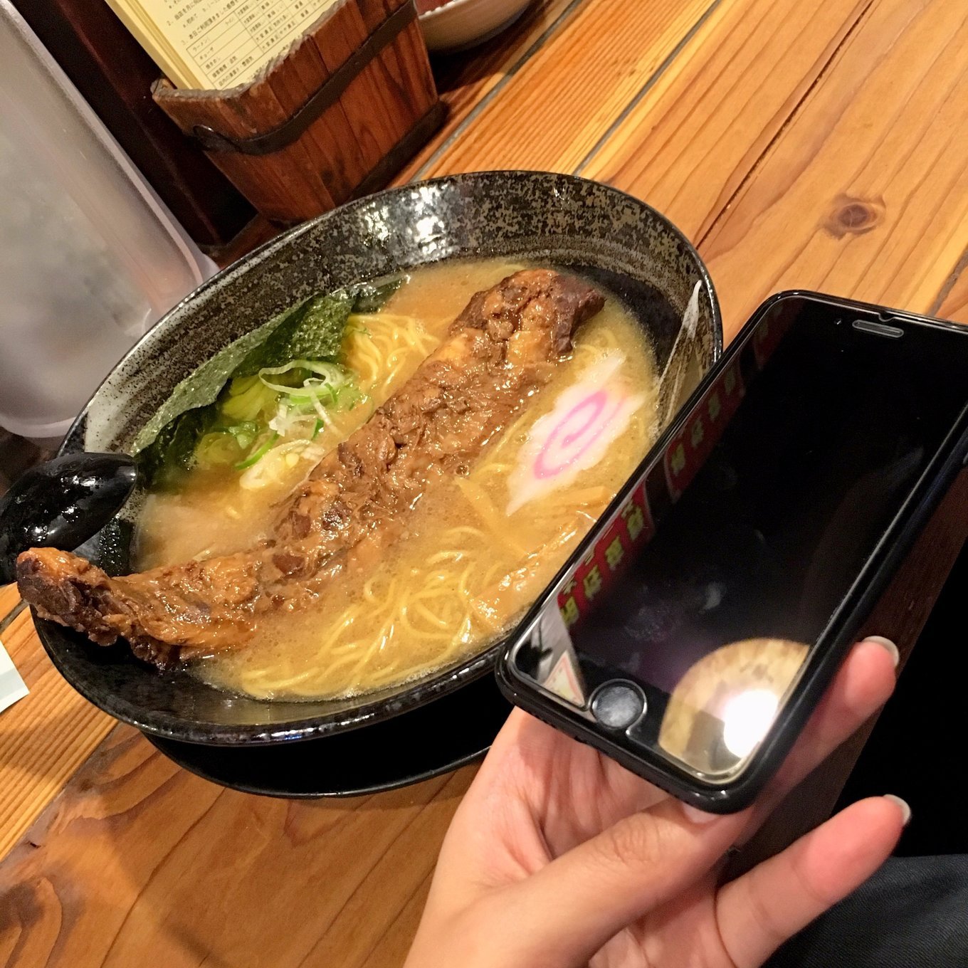 猪软骨拉面强烈推荐!!!超大一块猪软骨,被炖的极其软烂!!!其实就是猪排骨,超大一条,比手机长多了。里面的脆骨几乎入口就化,肉质相当之嫩,汤头浓香四溢,面条筋道,总之食肉者的天地,这大块肉吃着相当有幸福感,单点的这碗拉面才950日元,还赠一颗温泉蛋。
