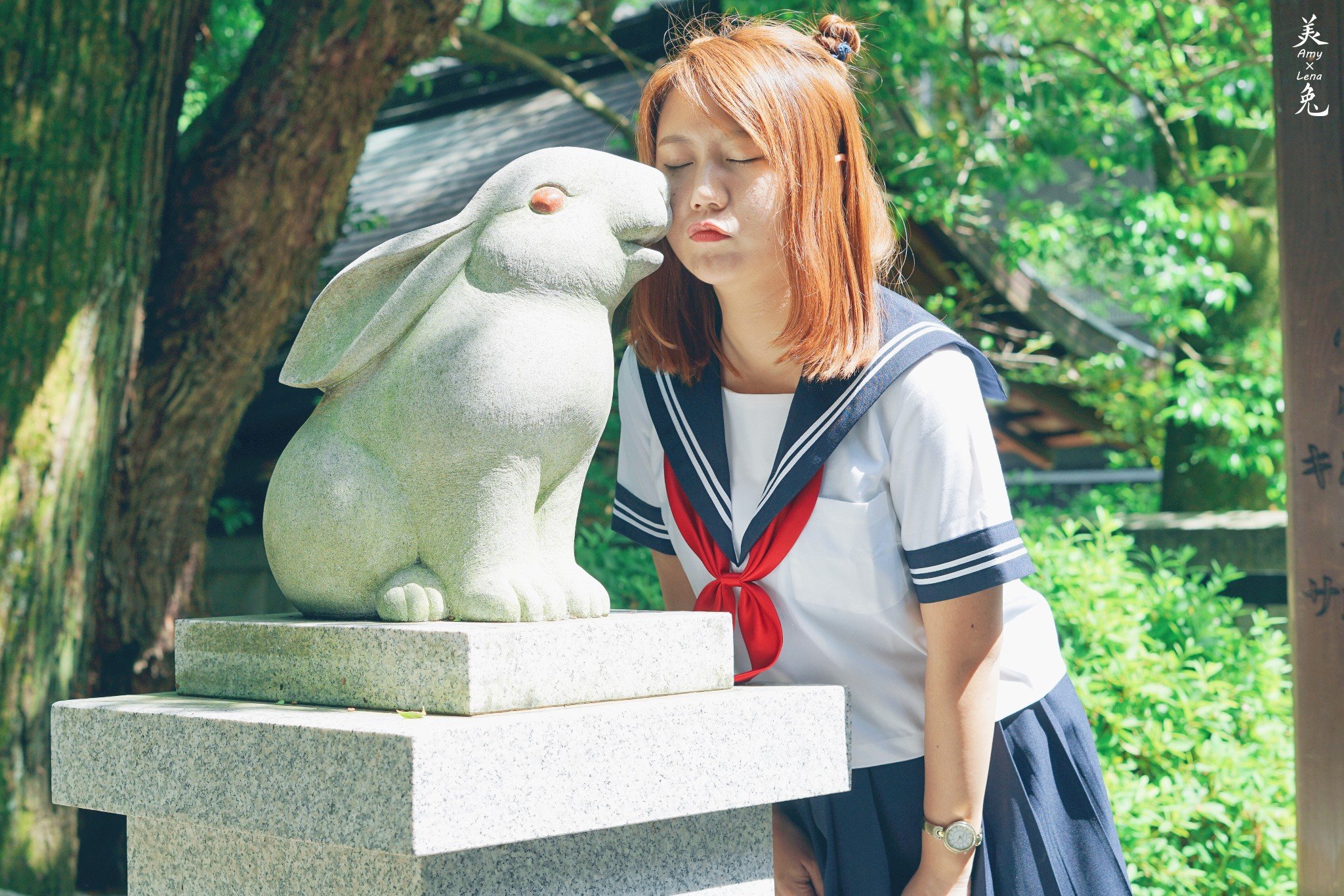 这里一切都与兔子有关,御神签是兔型的,御守也是兔型的。神社门前的,是呆萌的神兽兔,灯笼上绘制的,是安逸的祥云兔,主殿前举着左手的是招财兔,举着右手的是结缘兔,就连手水舍前,也是黑御影石做成的喷水兔。