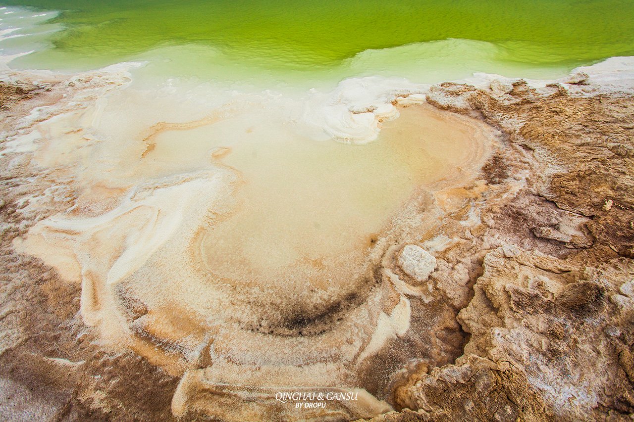 察尔汗蒙古语意为“河流密集的地方”,察尔汗盐湖海拔最低点为2200多米,由达布逊、南霍布逊、北霍布逊、涩聂4个盐湖汇聚而成。格尔木河、素棱果勒河等10多条内陆河注入。“察尔汗”是蒙古语,意为“盐泽”。盐湖周围地势平坦,荒漠无边,但风景奇特。盐湖地处戈壁瀚海,这里气候炎热干燥,日照时间长,水份蒸发量远远高于降水量。因长期风吹日晒,湖内便形成了高浓度的卤水,逐渐结晶成了盐粒,湖面板结成了厚厚的盐盖,异常坚硬。整个湖面好像是一片刚刚耕耘过的沃土,又像是鱼鳞,一层一层,一浪一浪。遗憾的是土地上无绿草,湖水中无游鱼,天空上无飞鸟,一片寂静。