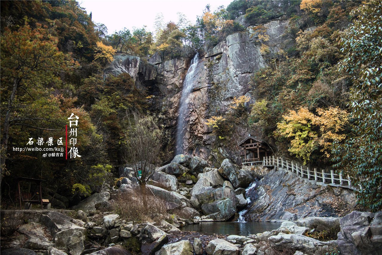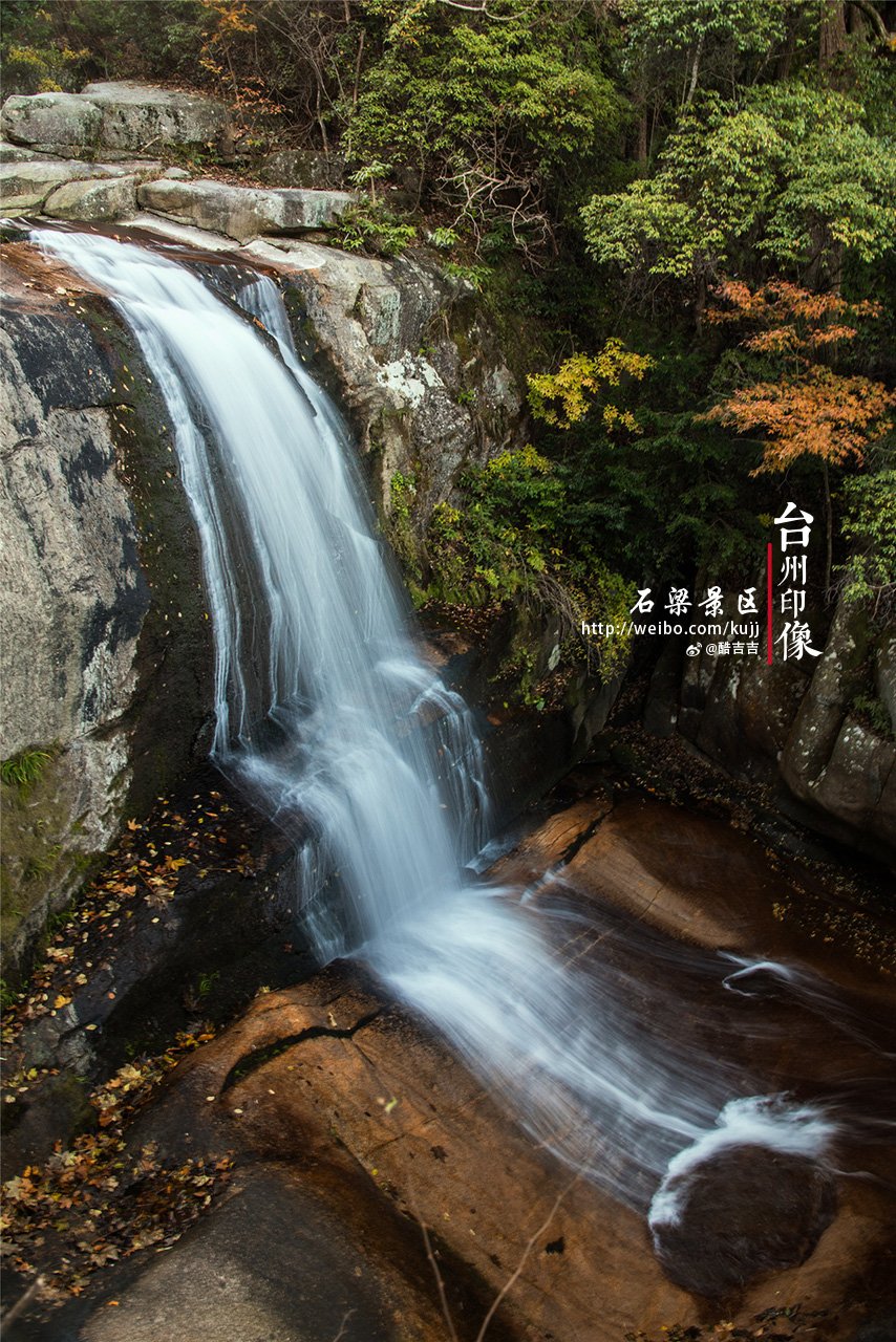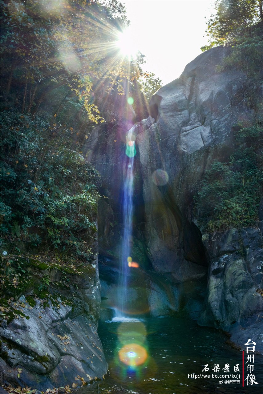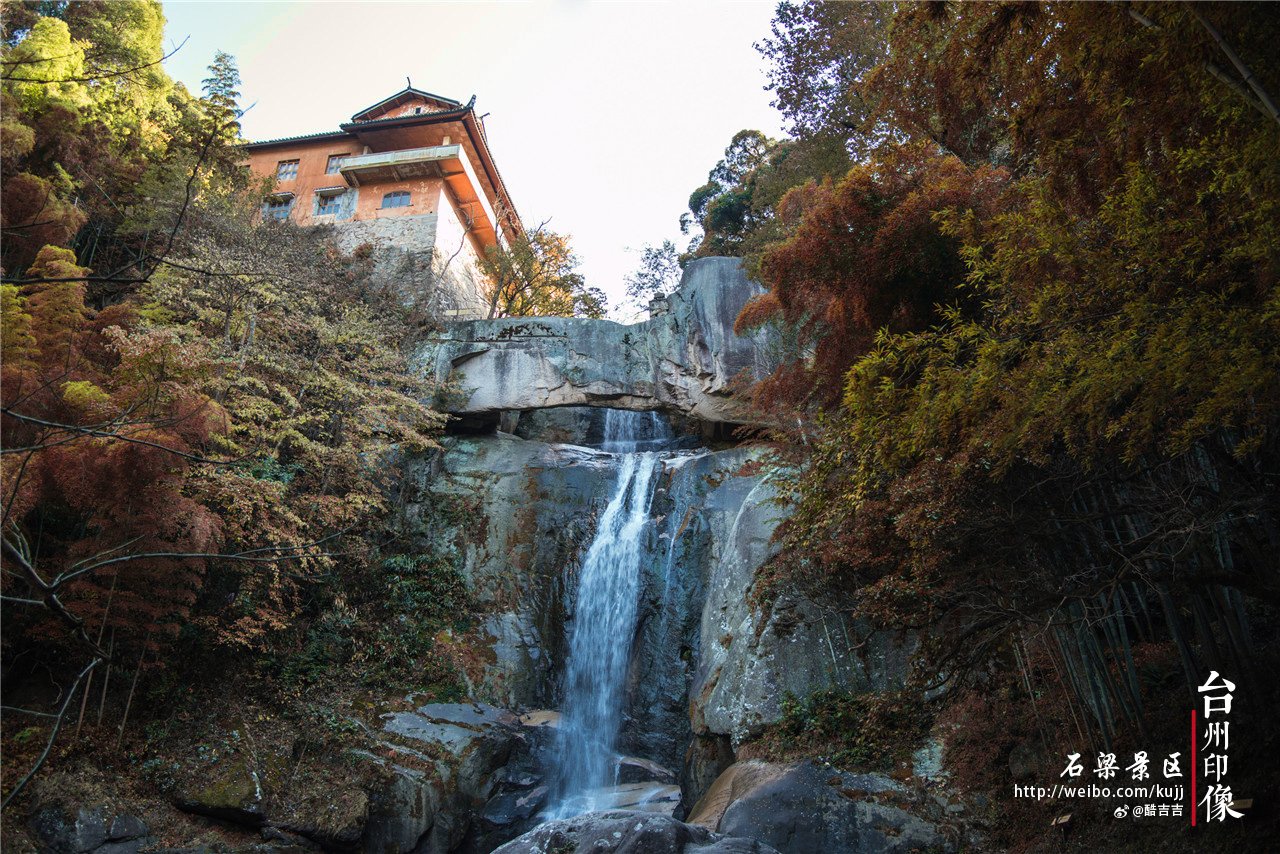 沿着石道行走大概一个小时,终于来到了传说中的石梁飞瀑,在山的两崖之间,一天然石桥横亘其上,瀑布恰好从梁洞喷涌而出,流向深潭之中。