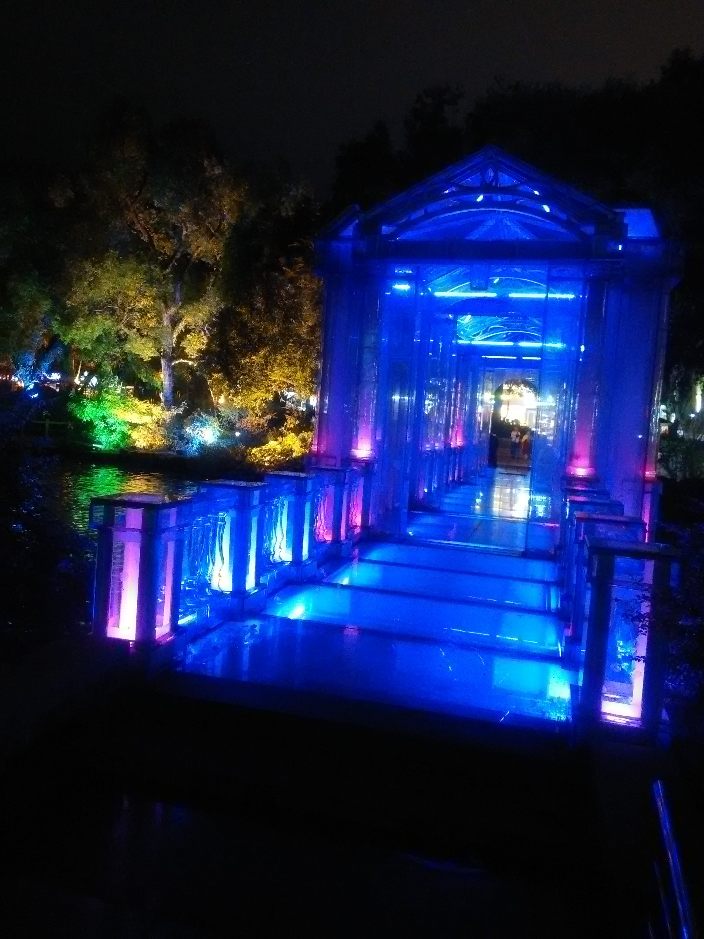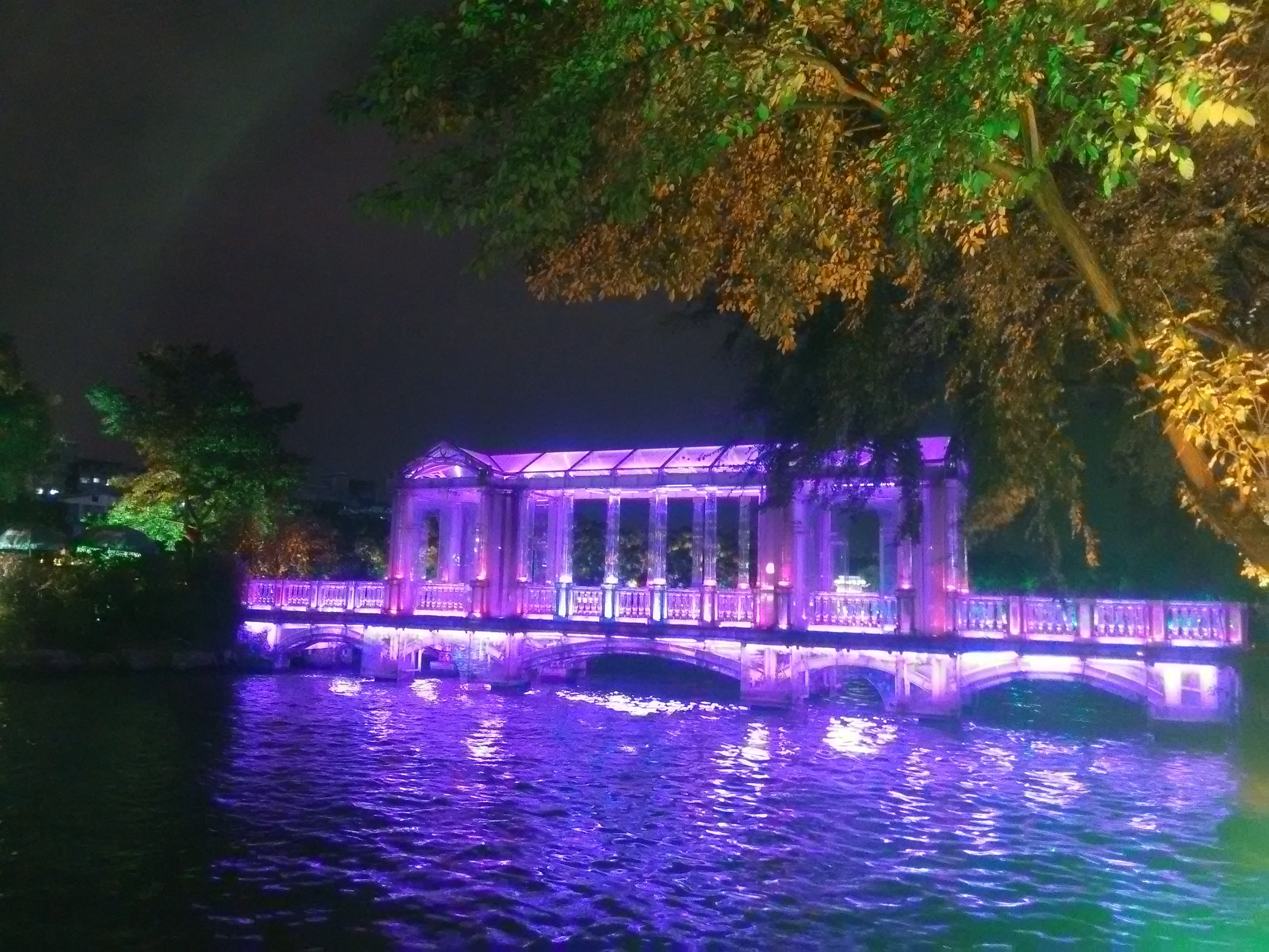 榕杉湖的夜景是看见网上推荐来的,我认为自助游完全不需要去做那个两江四湖的游船(如果有老人,还是坐船吧),还不如在湖边走一走呢。榕杉湖的夜景真的不错,有个玻璃桥,桥上的灯光会变颜色,一过了阳桥就可以拍照了,不过这里拍照的人会比较多,可以选择过了玻璃桥,还有一处可以拍照的地方。玻璃桥并不长,很小的,上桥是要收费的,10月/人,还送一张塑封的大照片,果断掏钱上去了,感觉图片社打印一张那么大的照片也不止10元,上去之后,自己可以随便拍照,个人认为不亏。之后就是沿湖的灯光景色了,真的是边走边羡慕桂林人民啊。湖上有三座桥联通两岸,可以根据自己的能力,选择不同的桥。