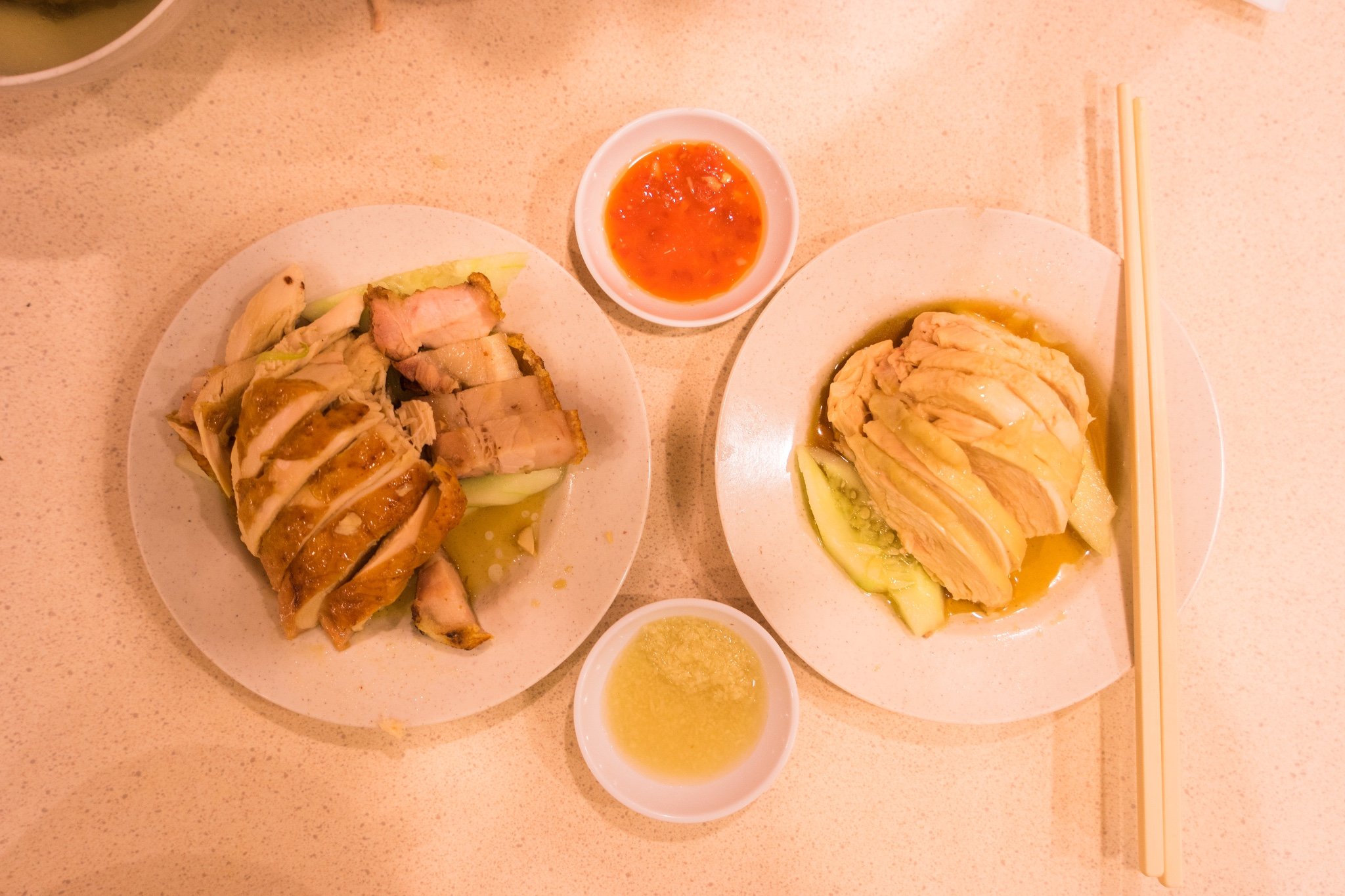 海南鸡饭和酱油鸡拼烧肉。