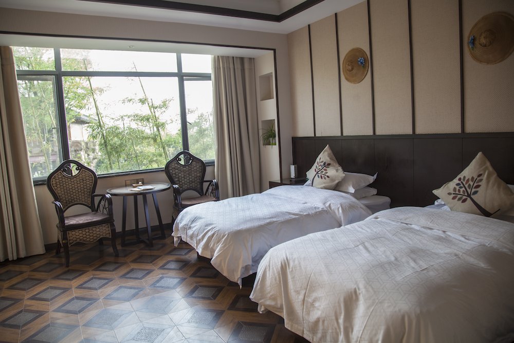 标间的房间是在一楼,进房门就看见了婆娑的竹影,房间里的大部分家具都是用竹子制成了,墙上还挂着两个竹编的斗笠,和当地的特色结合得非常好,酒店真是有心了。