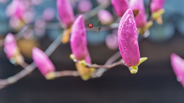 芳香不断的飘来,原来是紫玉兰,那含苞欲放的花骨朵好像一个个害羞的小姑娘,真叫人喜爱。