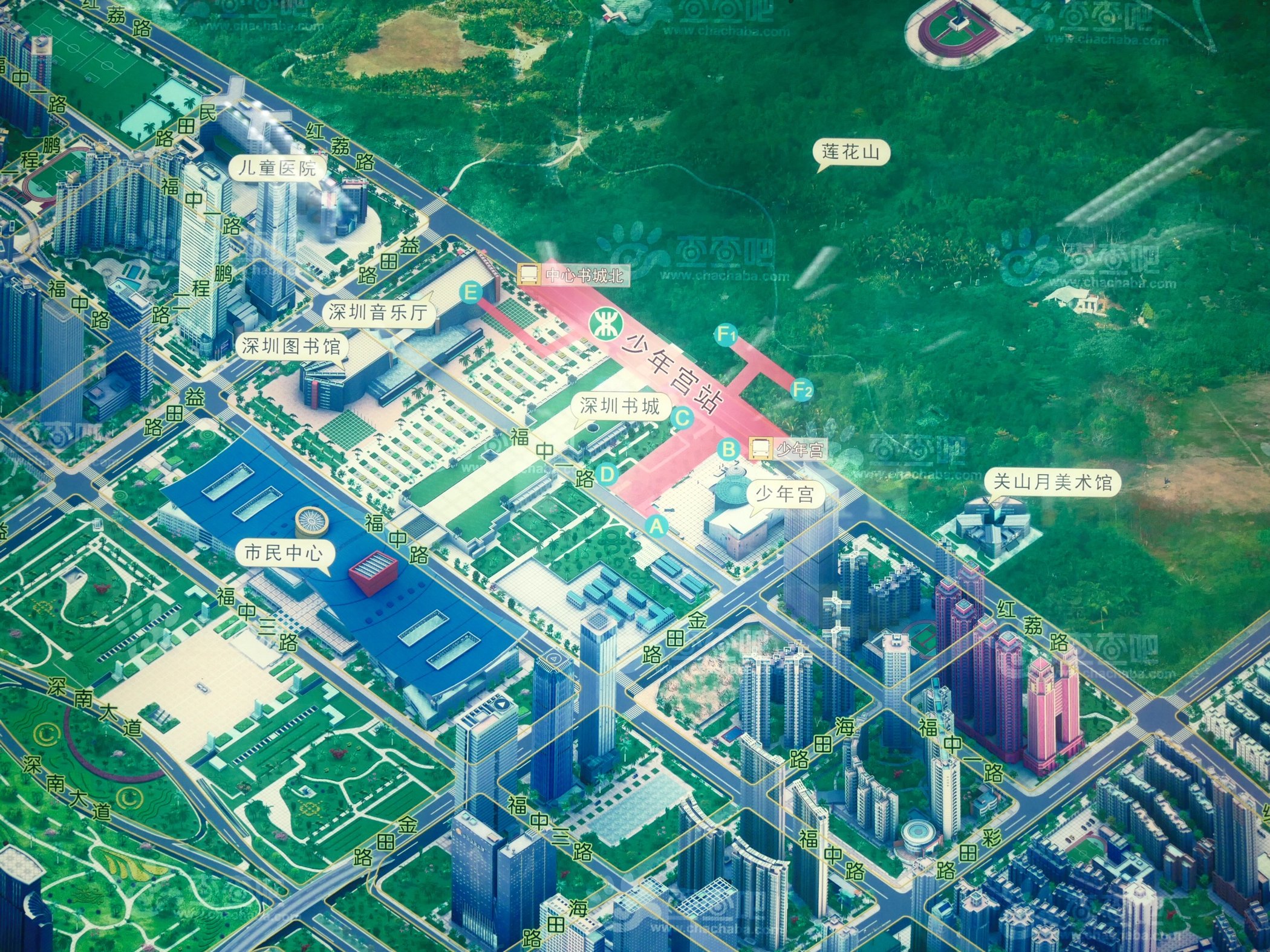 这次逛的主要是福田区这一片建筑群,图上是这一带的规划轴测图,从深圳音乐厅开始,我们按照环线依次观赏了了深圳图书馆—市民中心—当代艺术馆—少年宫—莲花山。
