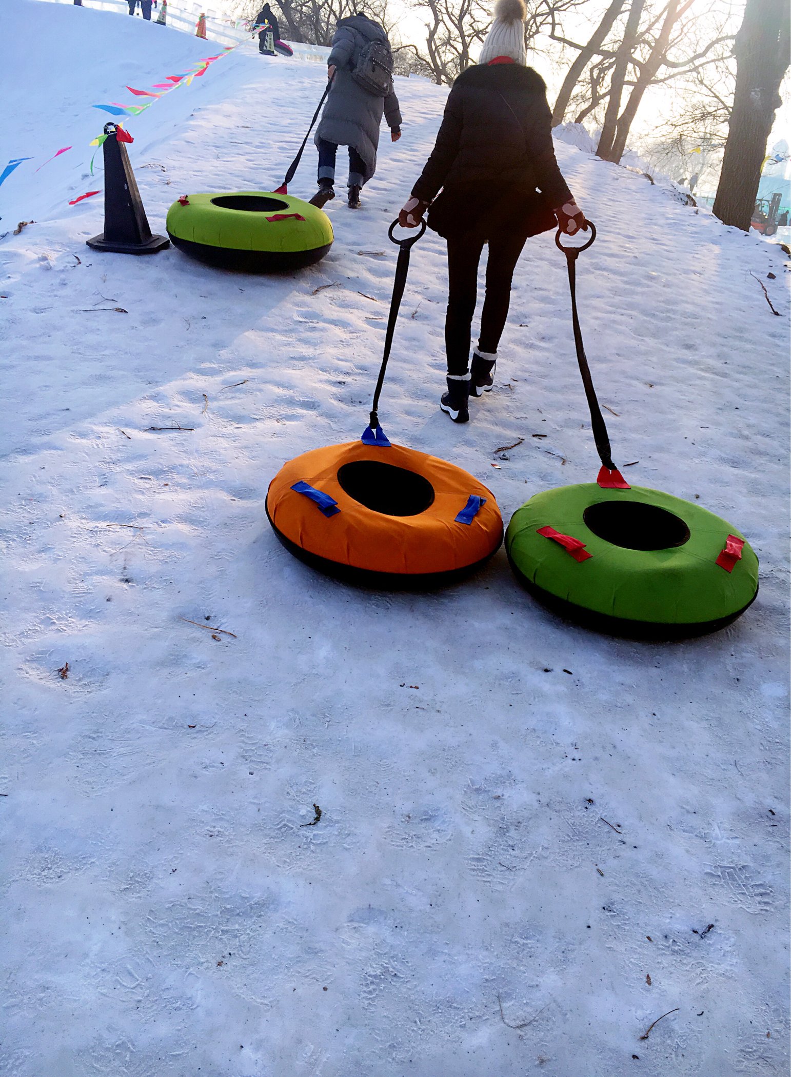 我家妹妹那个没用的,她拖着雪圈上坡是三步一滑的那种,所以就变成了我拖着两个,旁边那个就是六六