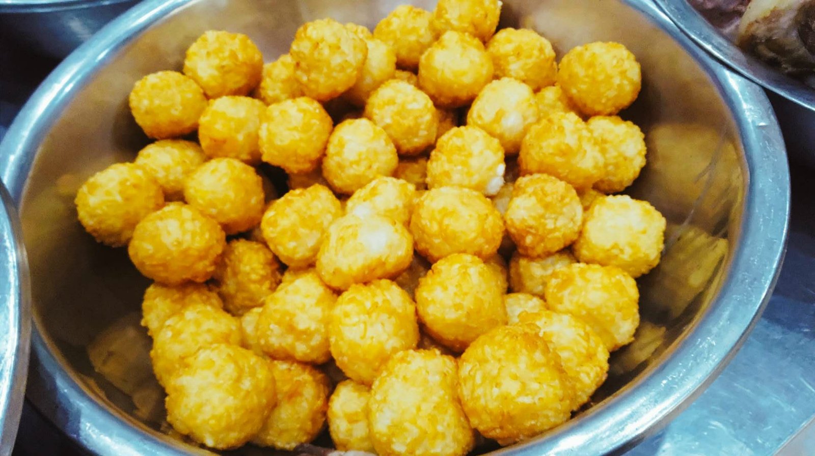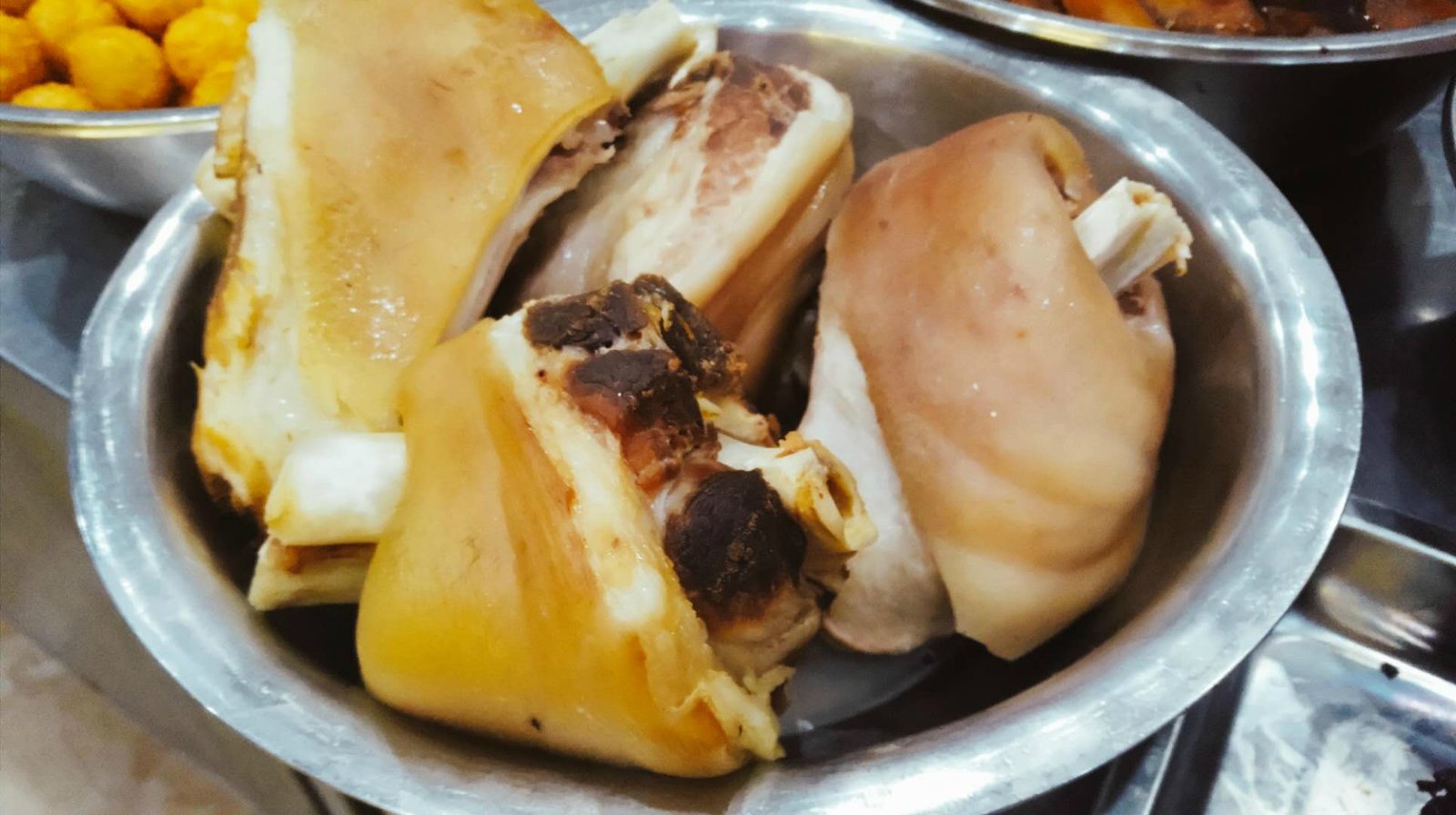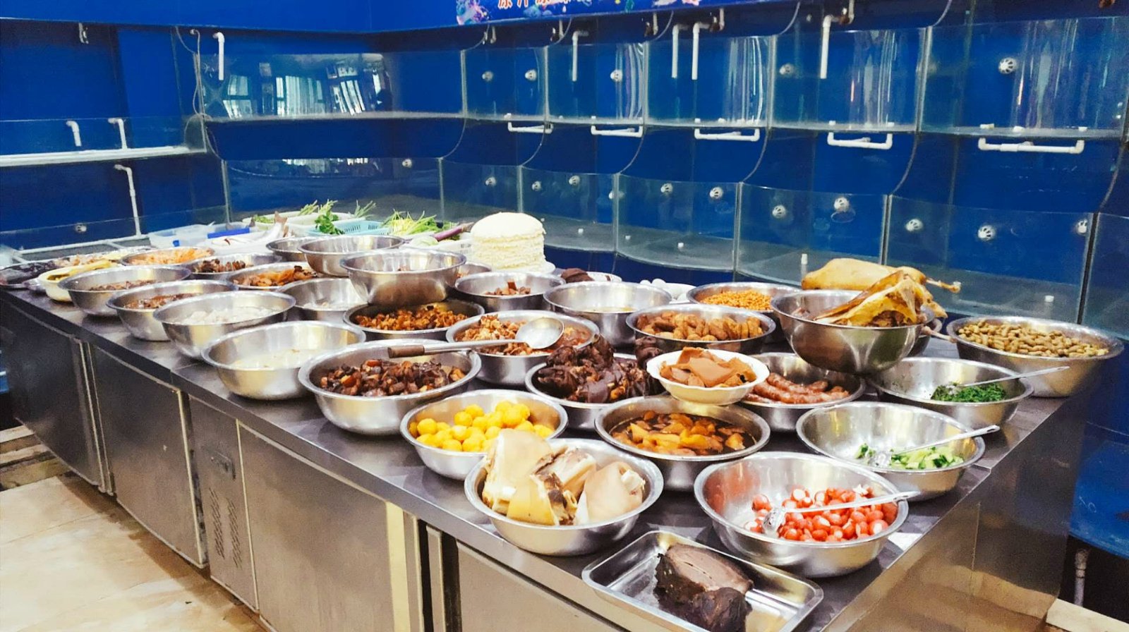 有点像农村办喜事,会烧一大桌子菜备着,用来配菜的。每个盆里是一种食材,有荤有素。