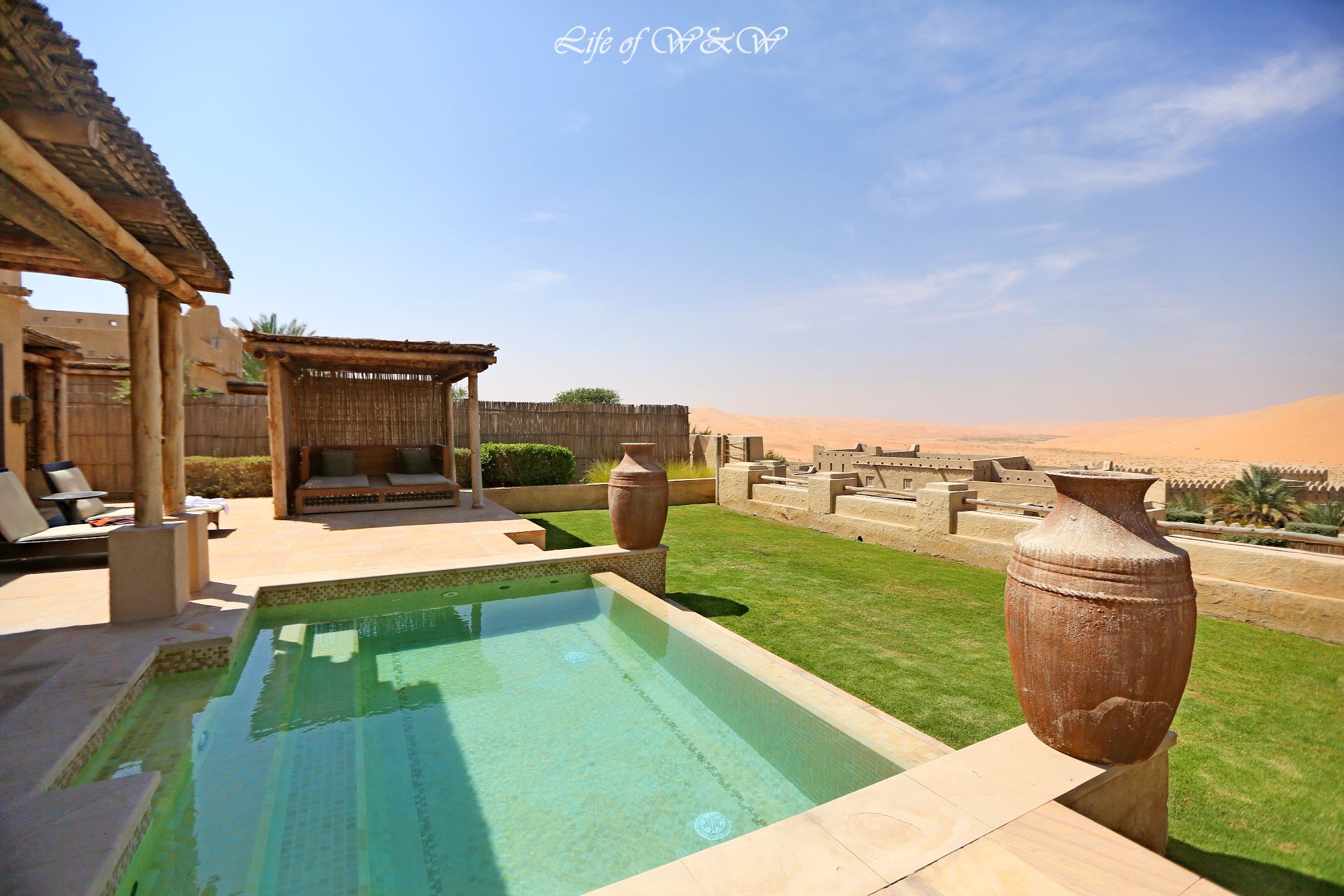 放一下Al Maha和悦榕庄的别墅泳池,图片可以看出酒店附近的沙漠杂草还是比较多。而且在峰友的游记中还偶尔会看到沙漠中的电线杆,有点煞风景