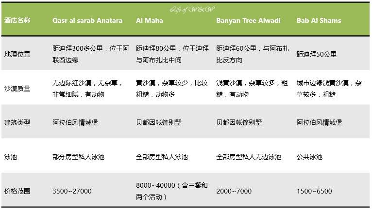 阿联酋的沙漠酒店总共有四家,之前也有一些热门游记做过比较。我就参考各种反馈和自身感受,简单直接罗列下他们的区别。价格范围根据官网及以往各游记提供,具体价位请根据日期和房型自行查询。