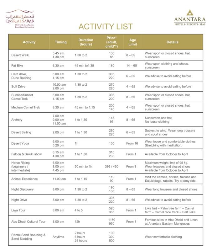 最后附一张酒店的各种沙漠活动价格(不含15%的各种税)。酒店提供的骑骆驼和冲沙这些虽然比迪拜出发的那种贵很多,但是绝对值得。
