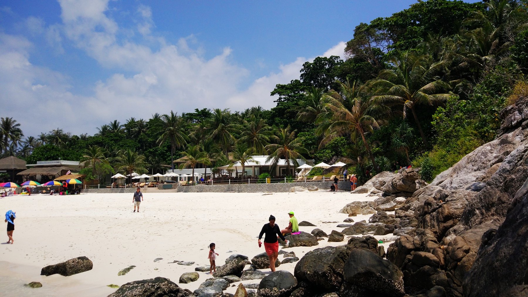 然而将近两个小时的大皇帝岛自由活动有点难受,虽然这里水清沙幼、景色绝美,非常适合潜水或者沙滩漫步,但是正午太阳暴晒根本就不想在太阳底下活动,只想哪儿凉快哪儿呆着。岸上但凡有点阴凉的地方都摆着收费的桌椅,一个太阳伞的位置200泰铢,岛上所有的设施都要收费,洗手间一次20泰铢,冲淡水一次200泰铢。有经验的老司机能被这难倒?取出浴巾和救生衣铺在礁石上休息,睡个午觉。