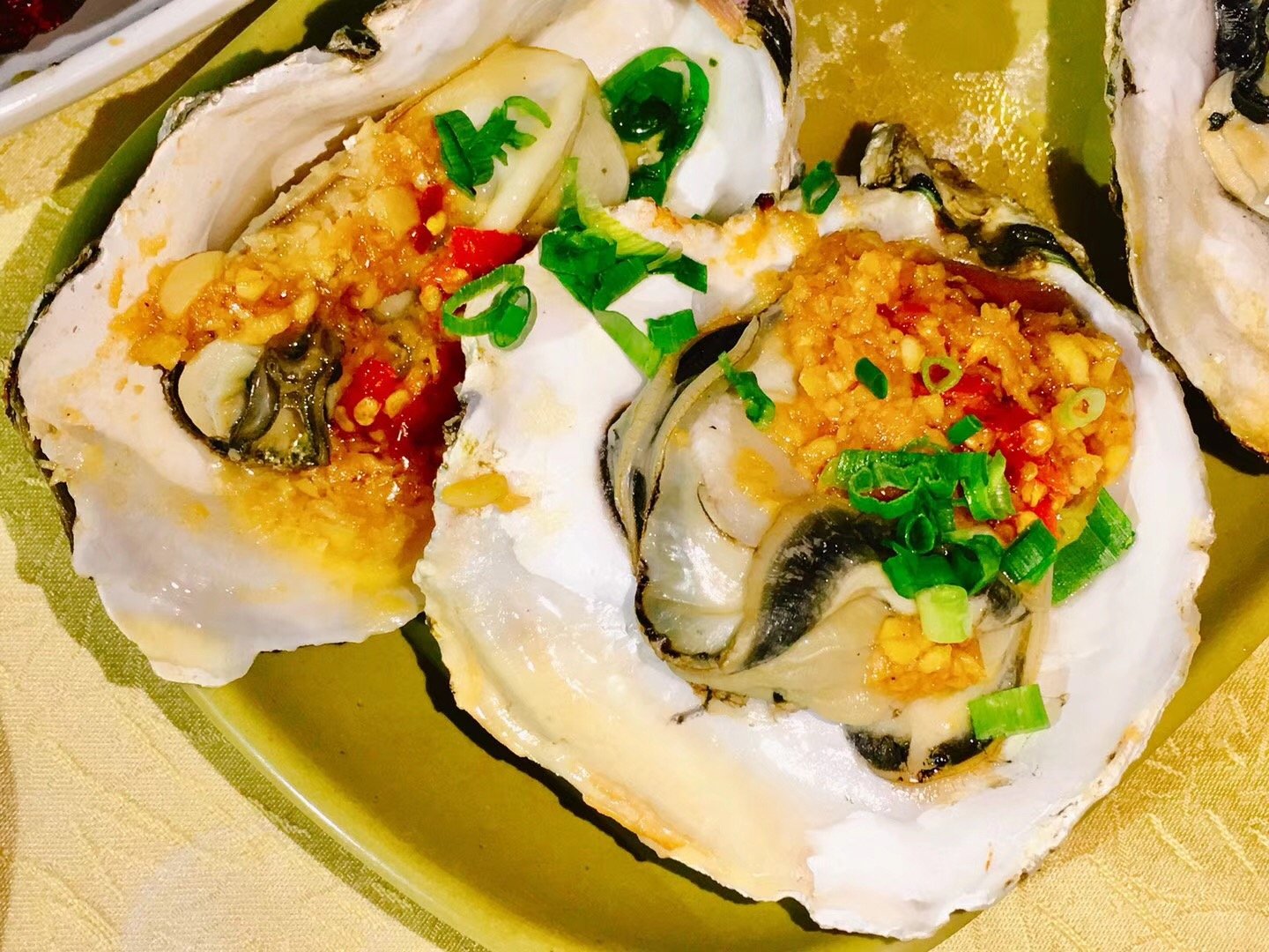 生蚝他们家有各种吃法,可以堪称蚝门盛宴,但是最基本的吃法还是生吃和炭火烤,炭火烤的依旧是我们的最爱,毕竟中国人还是吃熟的吃惯了。上面洒满了蒜蓉和葱。味道咸鲜入味。