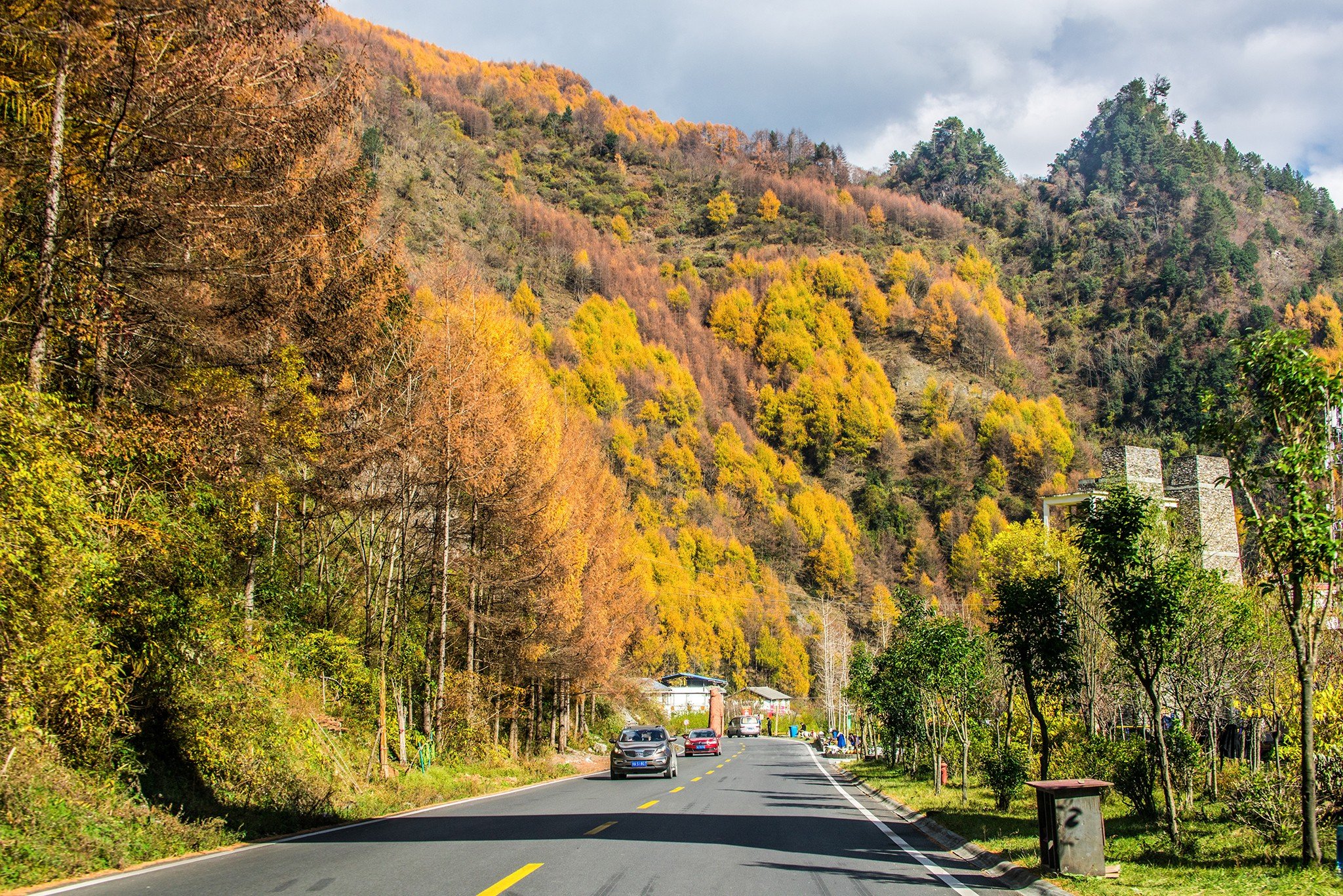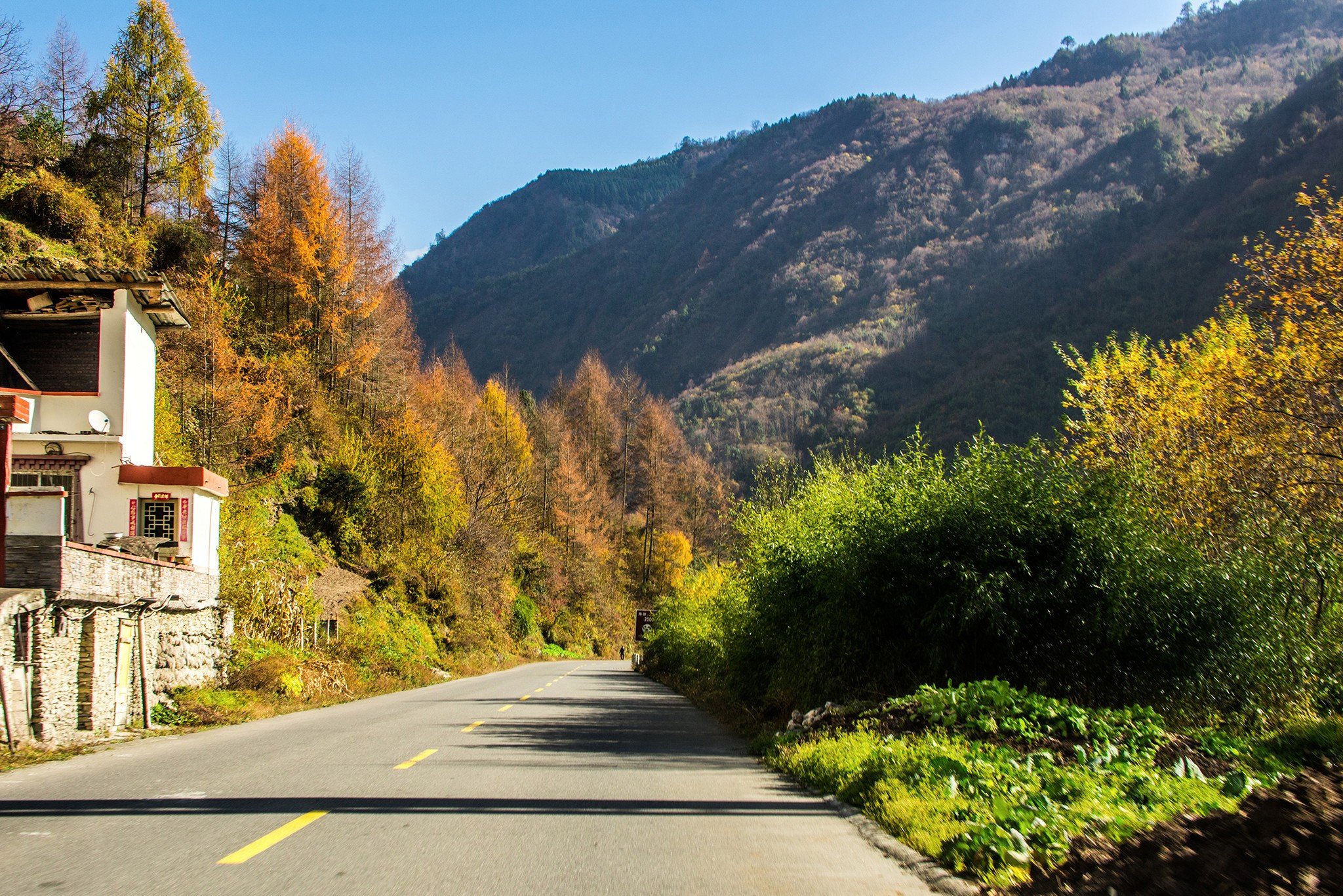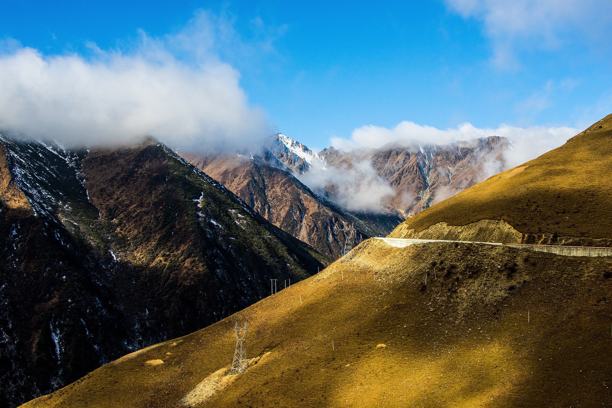过了巴郎山隧道后,能看见雪点,朝阳洒在黄色草甸上,别具特色。