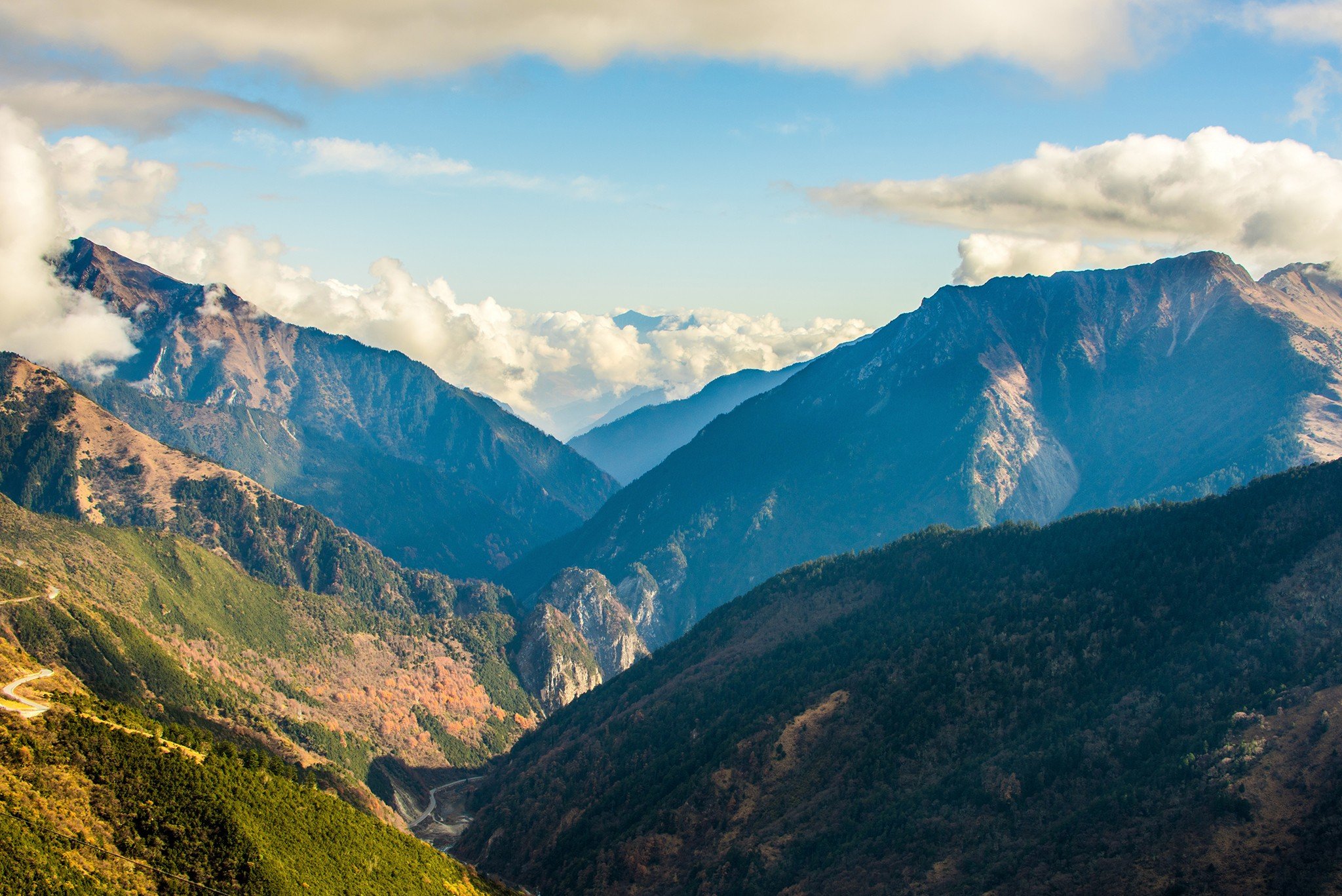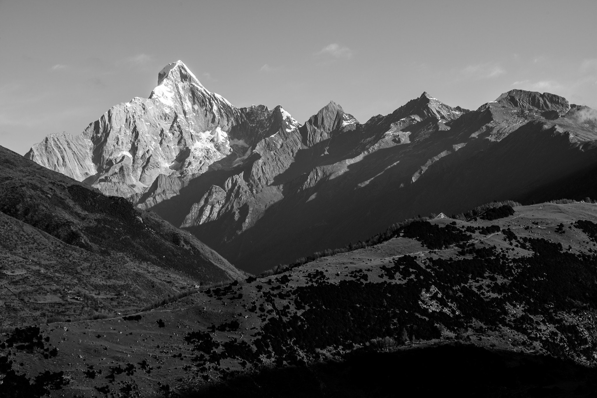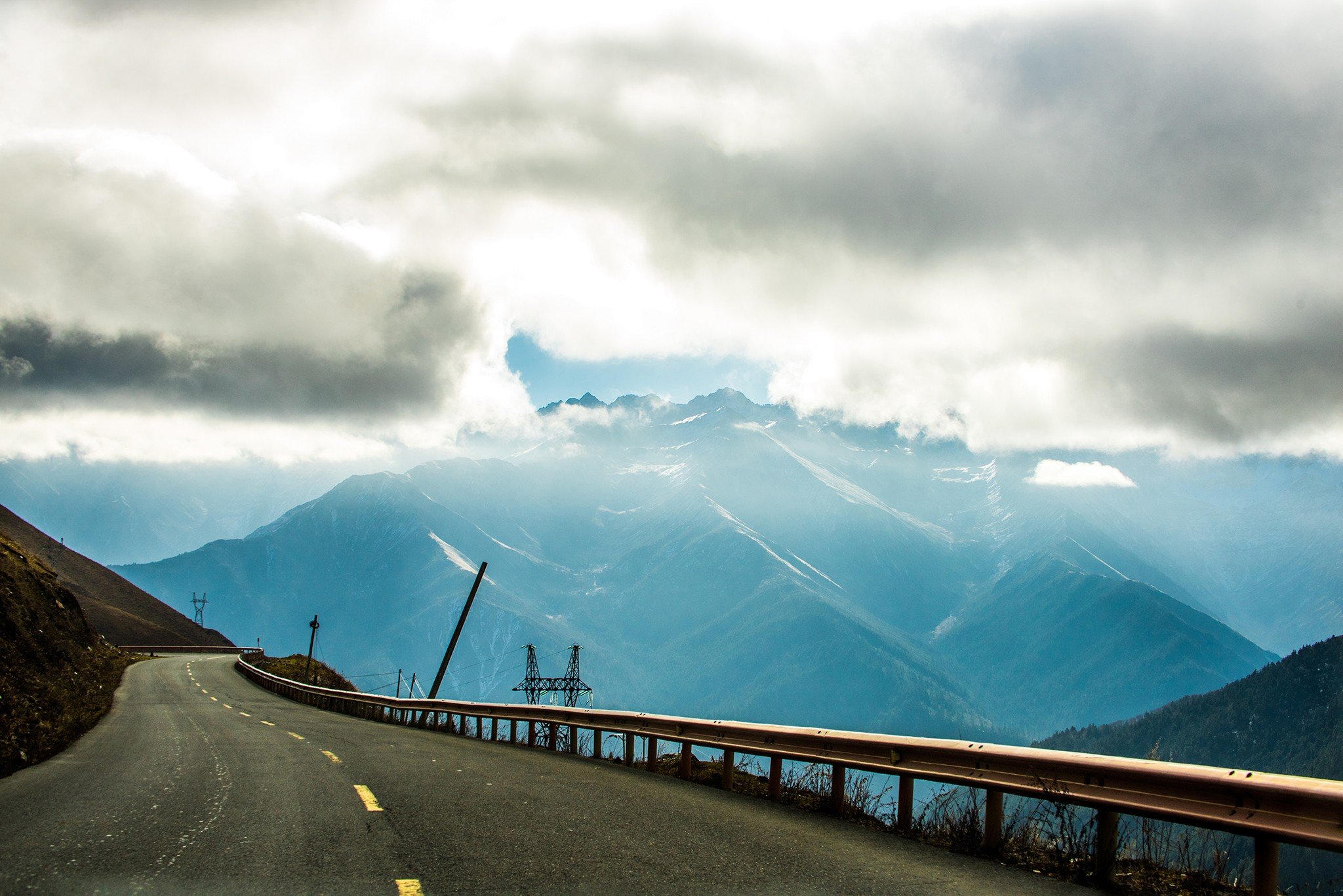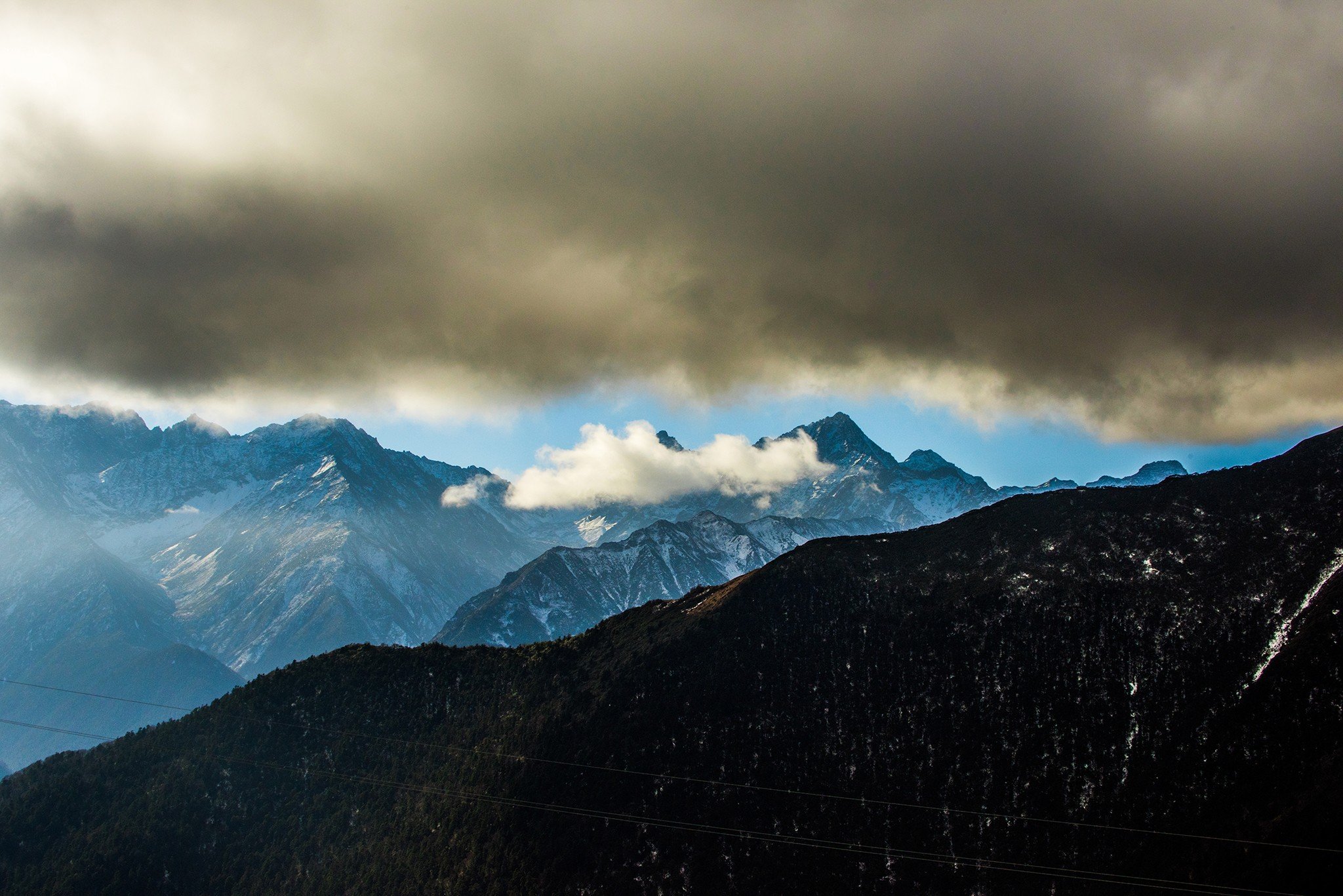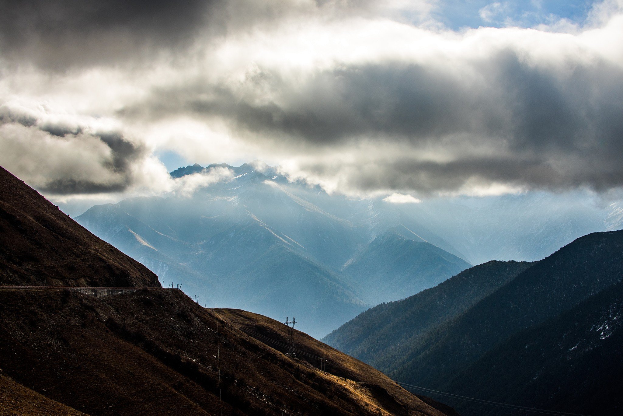 迎着阳光,转过弯,看见黑云压在对面山头上,阳光也不见了,温度也低了不少,这就是高原天气,变幻莫测。