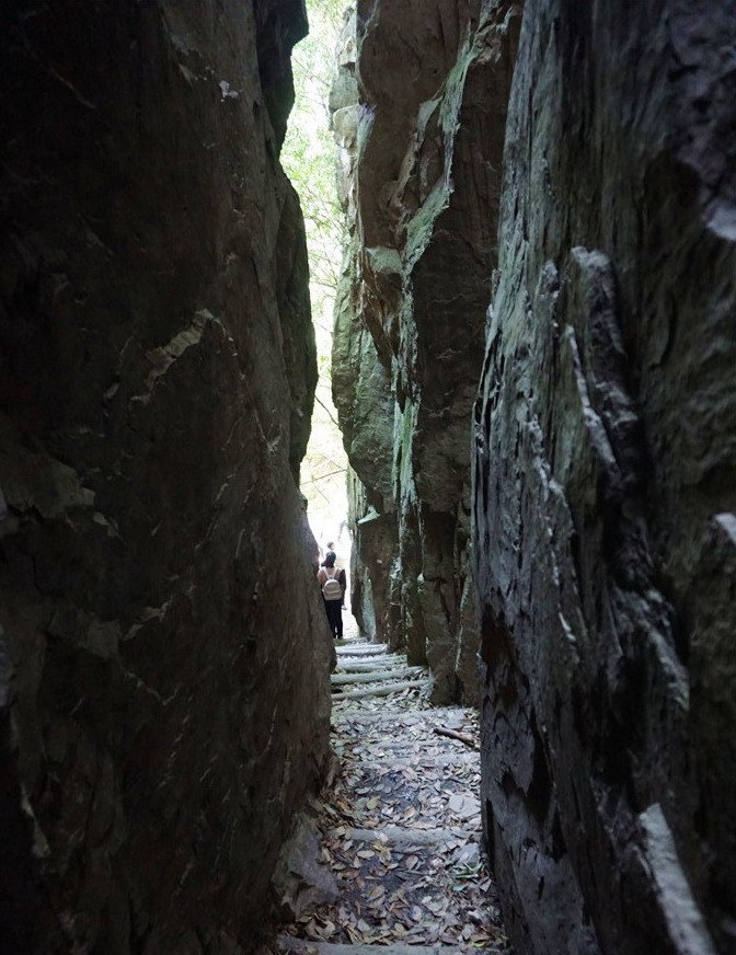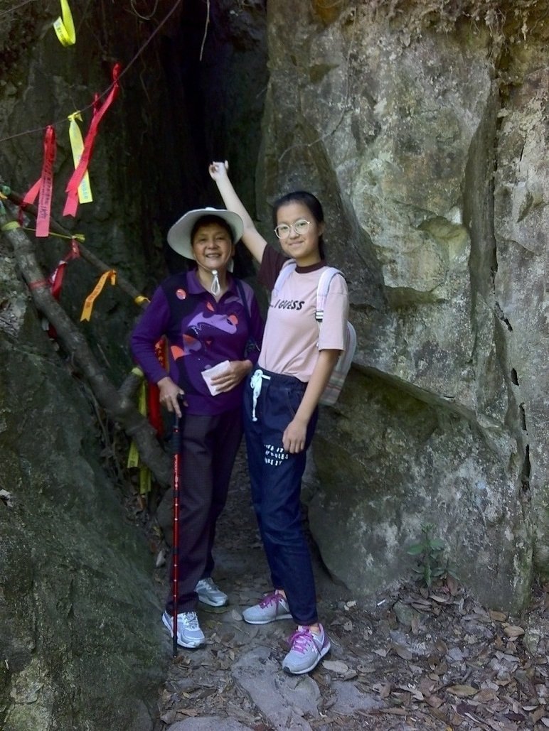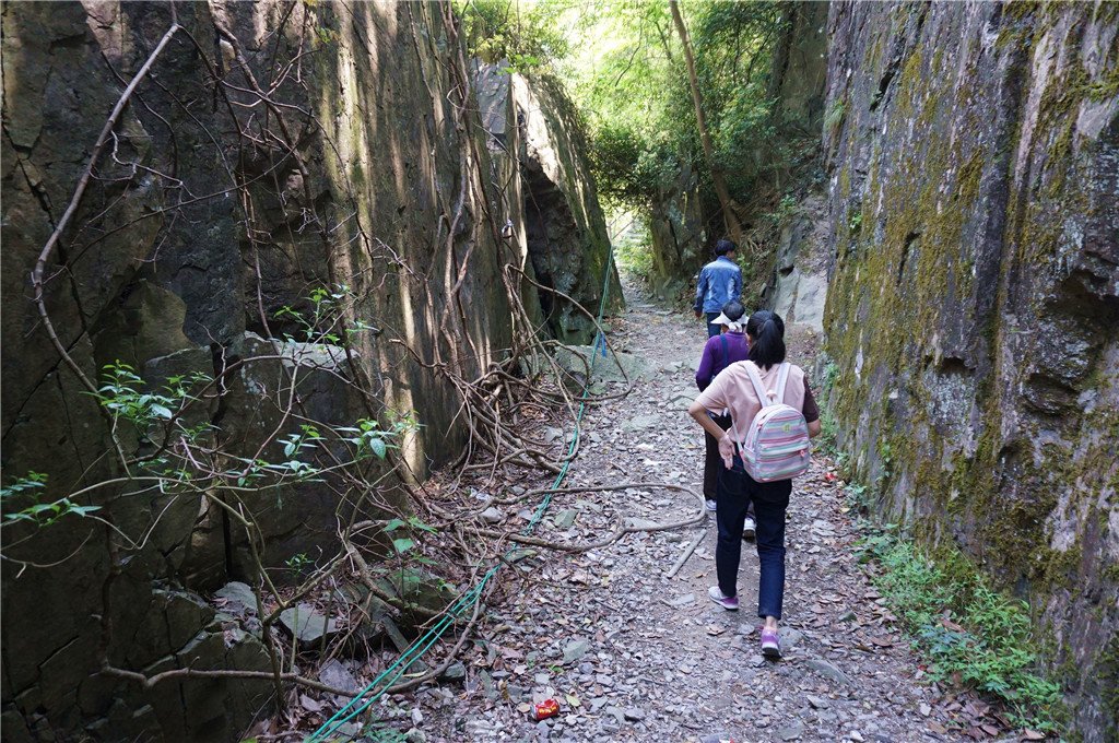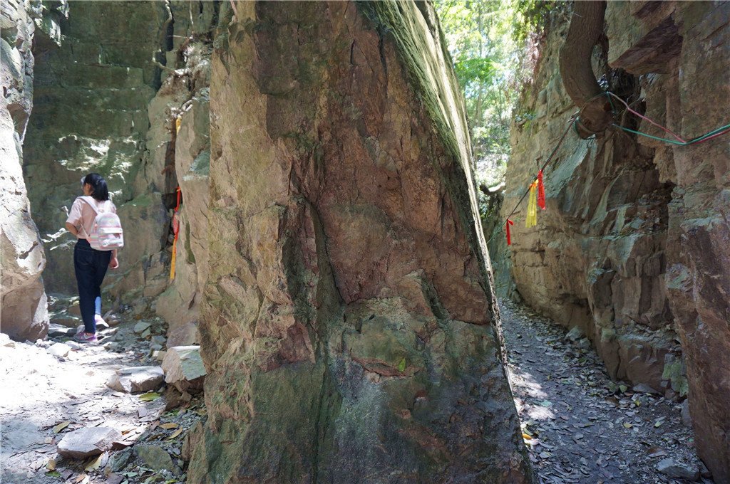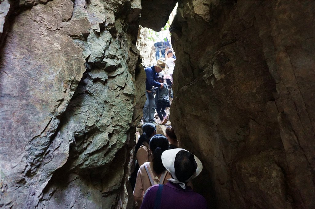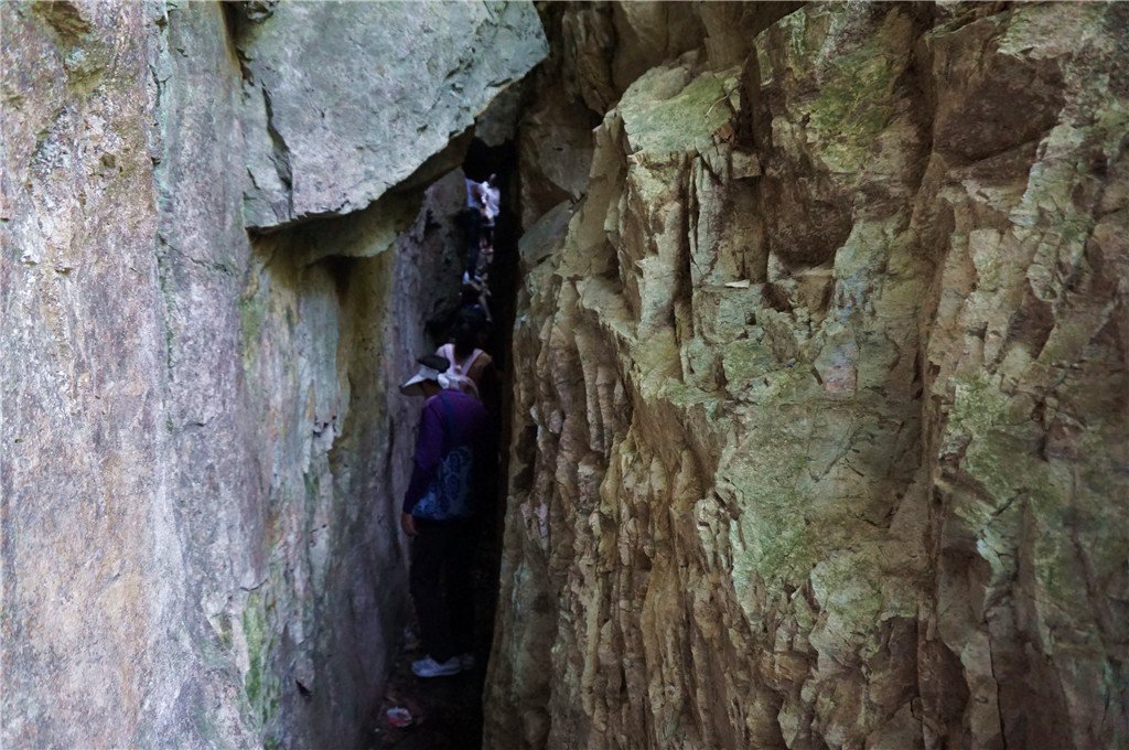 一线天尽头没有台阶,是约一米高的石头,必须脚踩旁边岩壁,手撑石头方能上去,体弱者会比较困难。好在有好汉协助后面的人爬上。我是自己爬上去的,又协助女儿和老妈爬上来。其实可以从旁边的正常路走过,它只不过是让人体验一下刺激度而已。