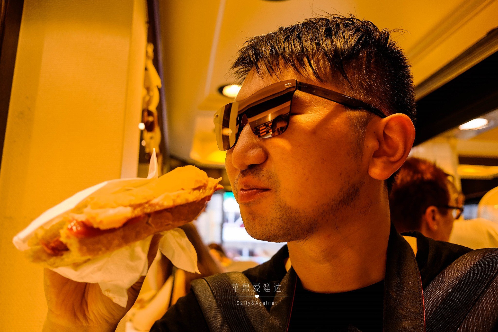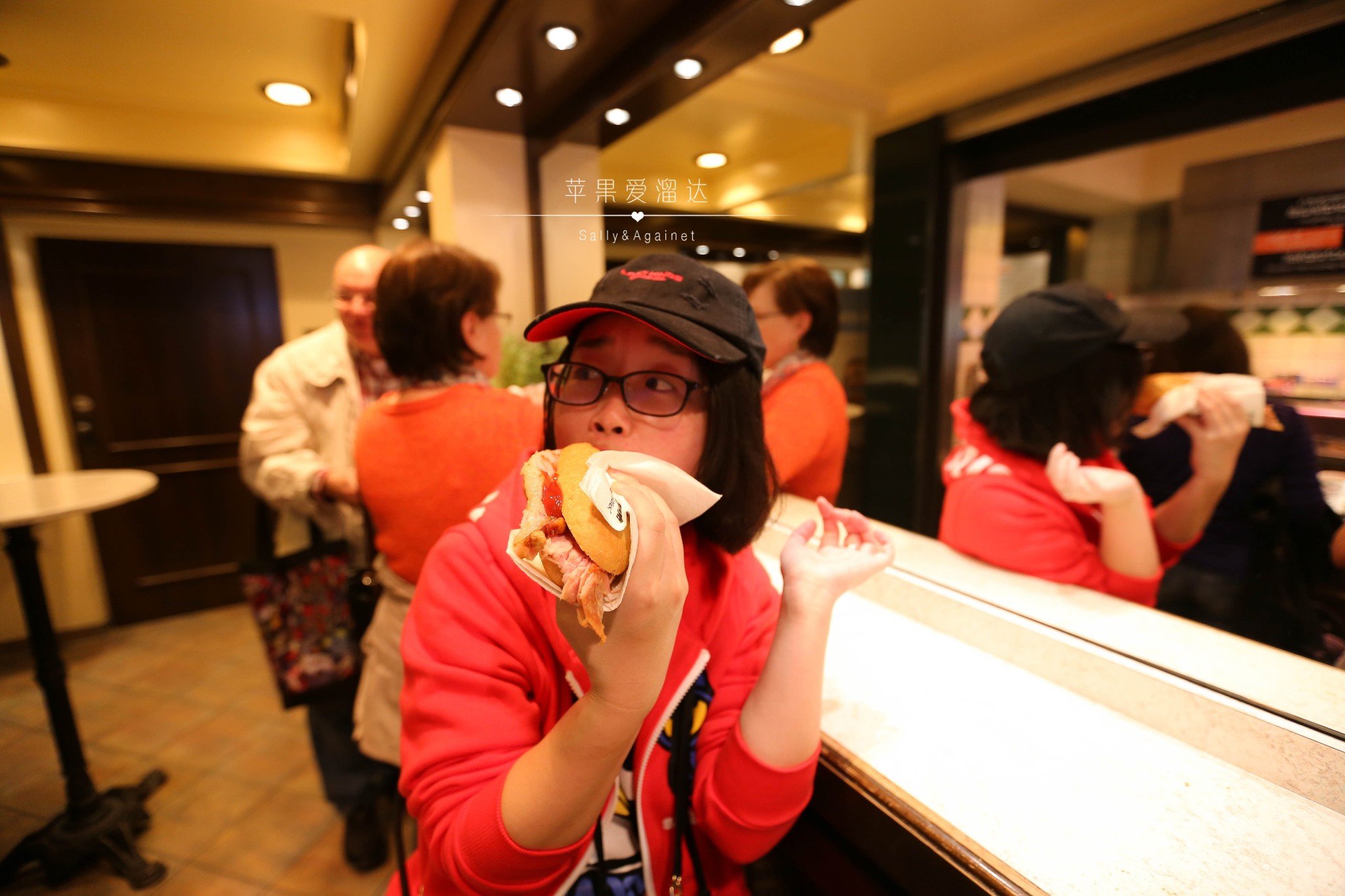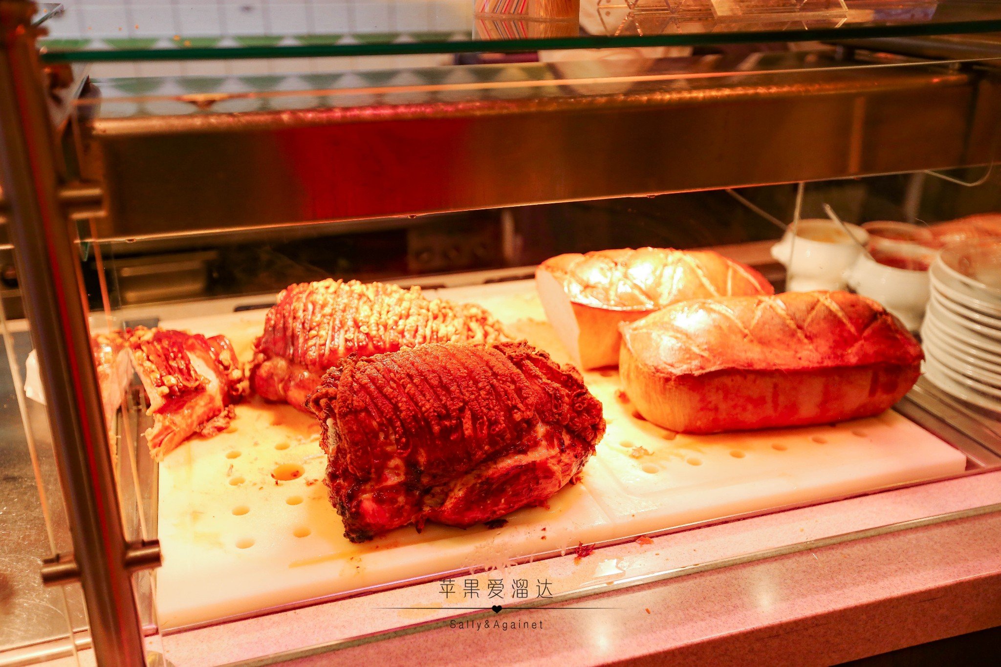 看到路边这家好多人排队我们就不由自主的挤进来了,刚一看以为是吃面包热狗呢,不由大失所望,结果仔细一看,这可是肉啊!上面烤的金黄酥脆的猪皮,那么爆满足量的猪肘子还有旁边烤的油香四溢的精肉,你可以选一种切上一块,然后包裹在面包里做成三明治吃。