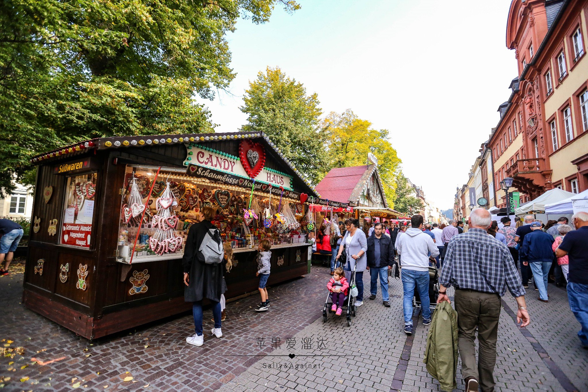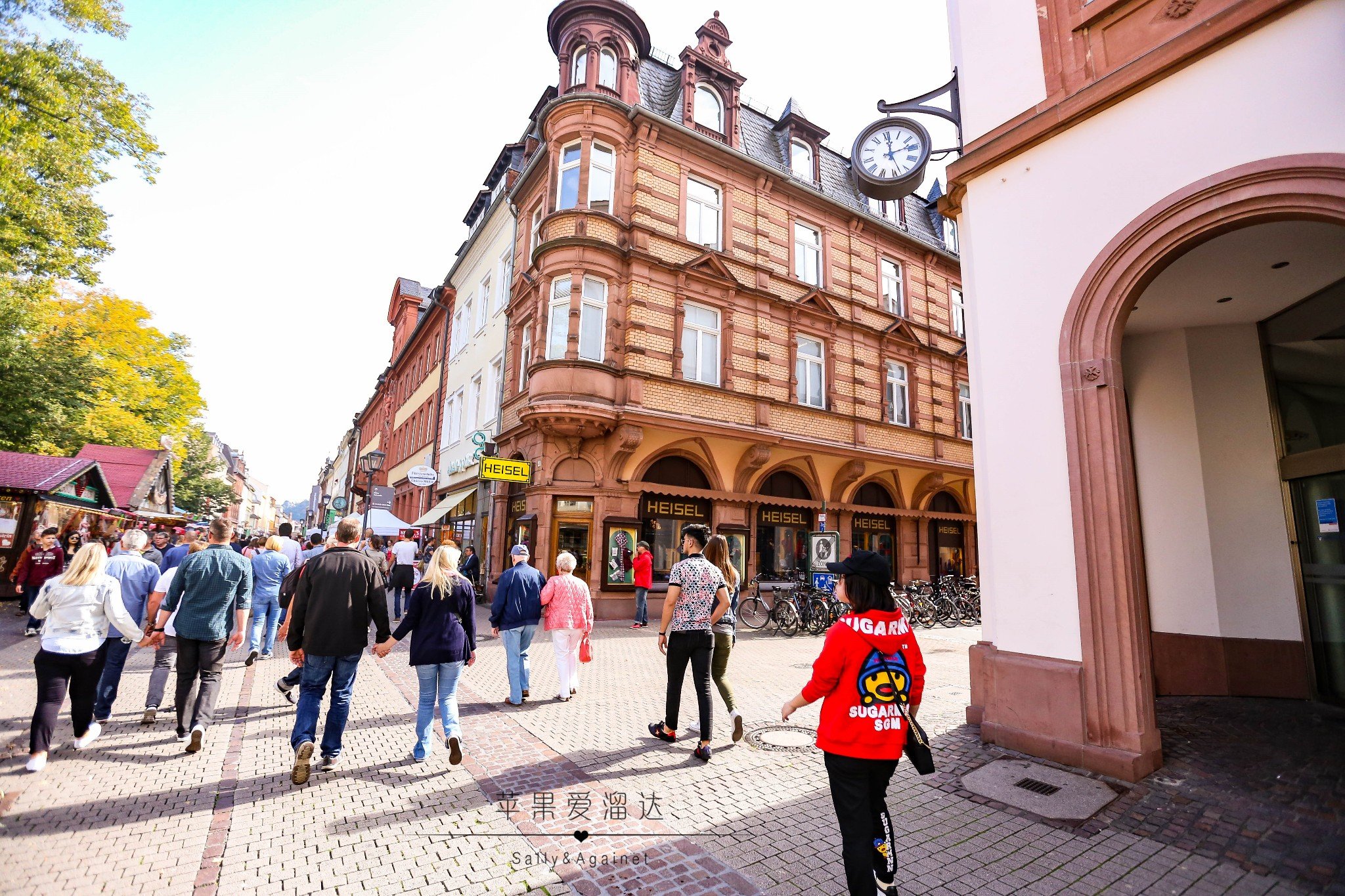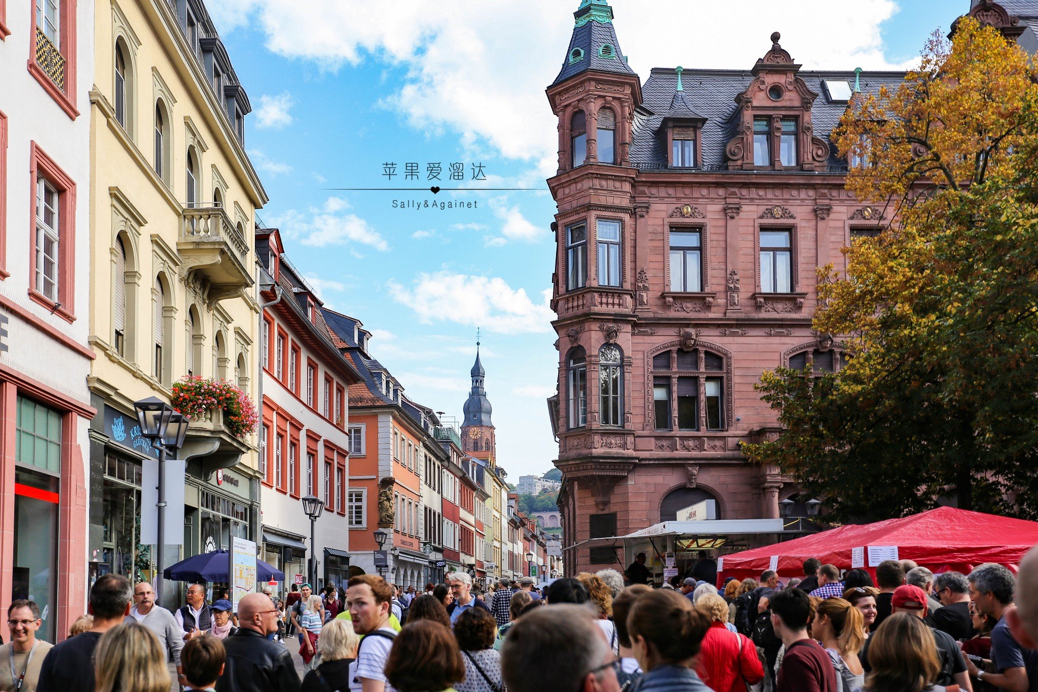 过了一条马路就是海德堡老城的主街了,一到主街我们一脸懵逼,说好的静静流淌的中世纪呢,马路上人头攒动,街边各类小贩各自吆喝着,还有从各个巷子里传出来的各种刺激耳膜的音乐。后来路边卖香肠的小姐姐才和我介绍,海德堡一年中360天是安静的,只有5天的节日才能让整个海德堡燃起来,而秋节,正式海德堡最燃的一天,哪怕火烧海德堡的焰火节也无法媲美,那好吧,就让我们来体验最不一样的海德堡。