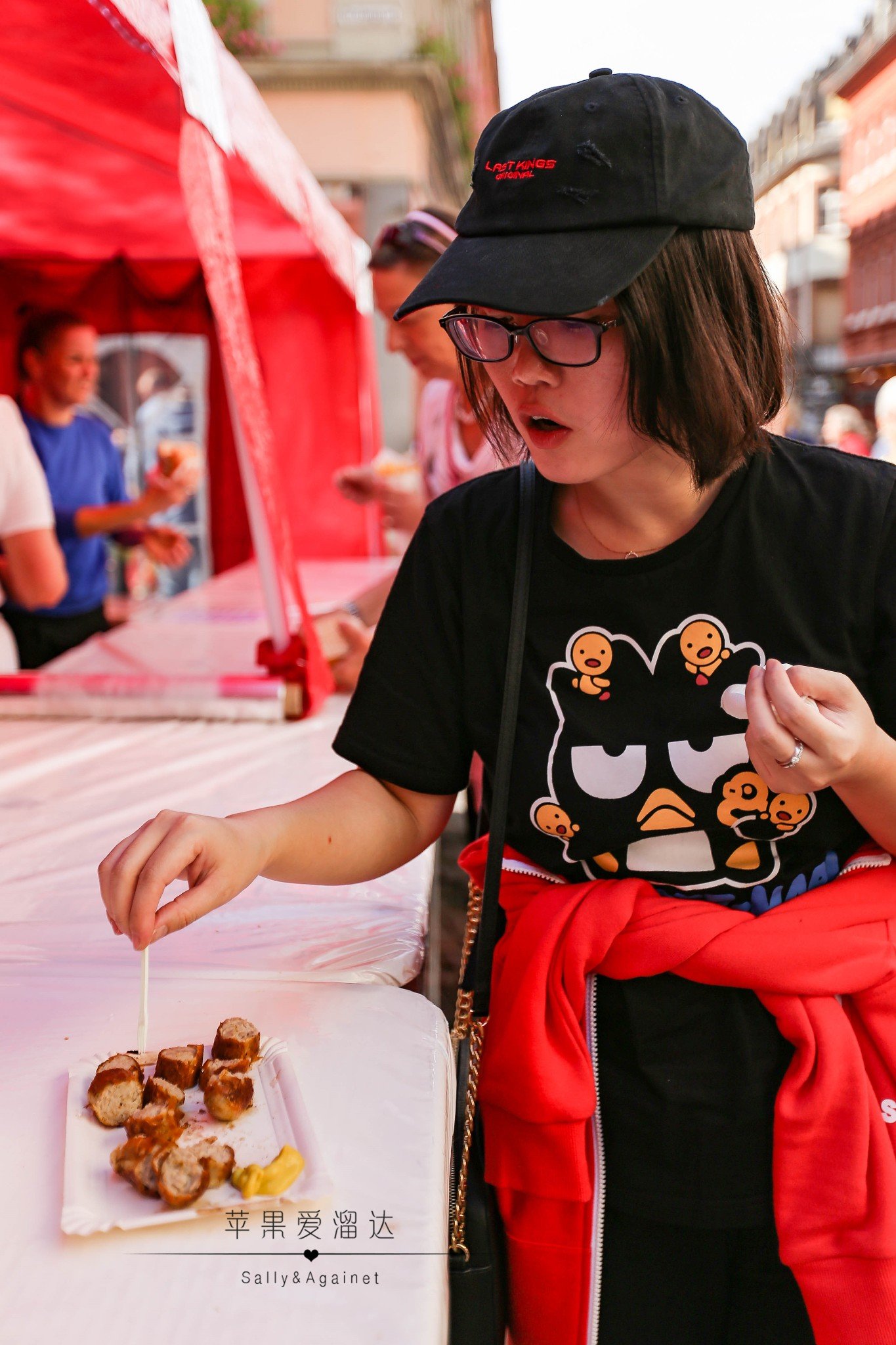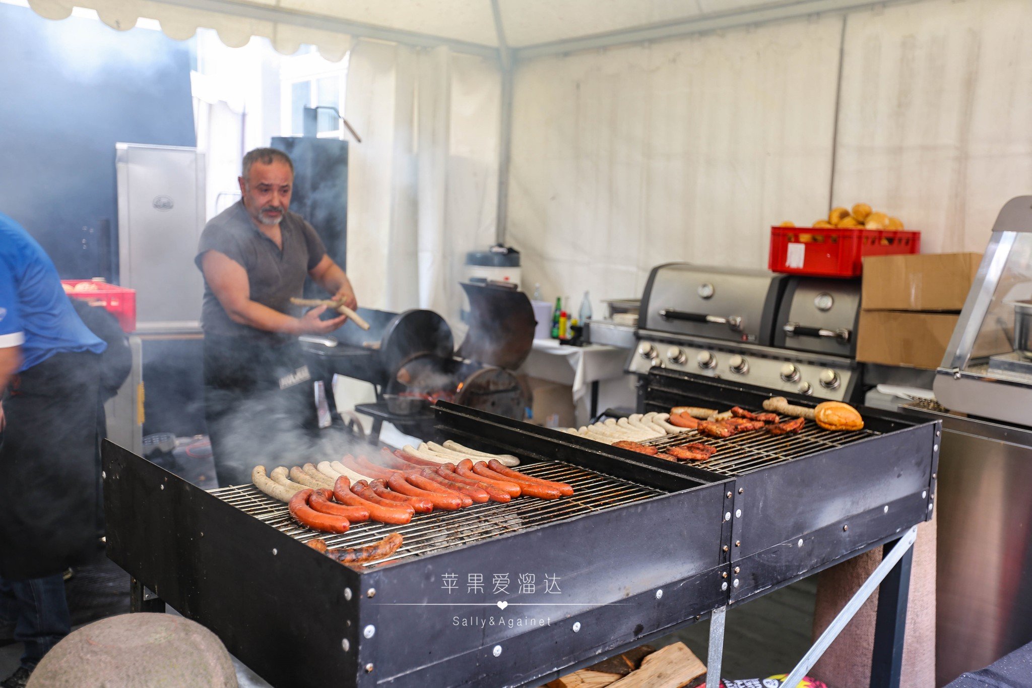 路过好几家香肠摊,每家都排队,我们实在仍不住那香肠诱人的香味了,不管了,排队就排队吧,没想到虽然队伍挺长,但速度还是很快的,不到十分钟就排到了。