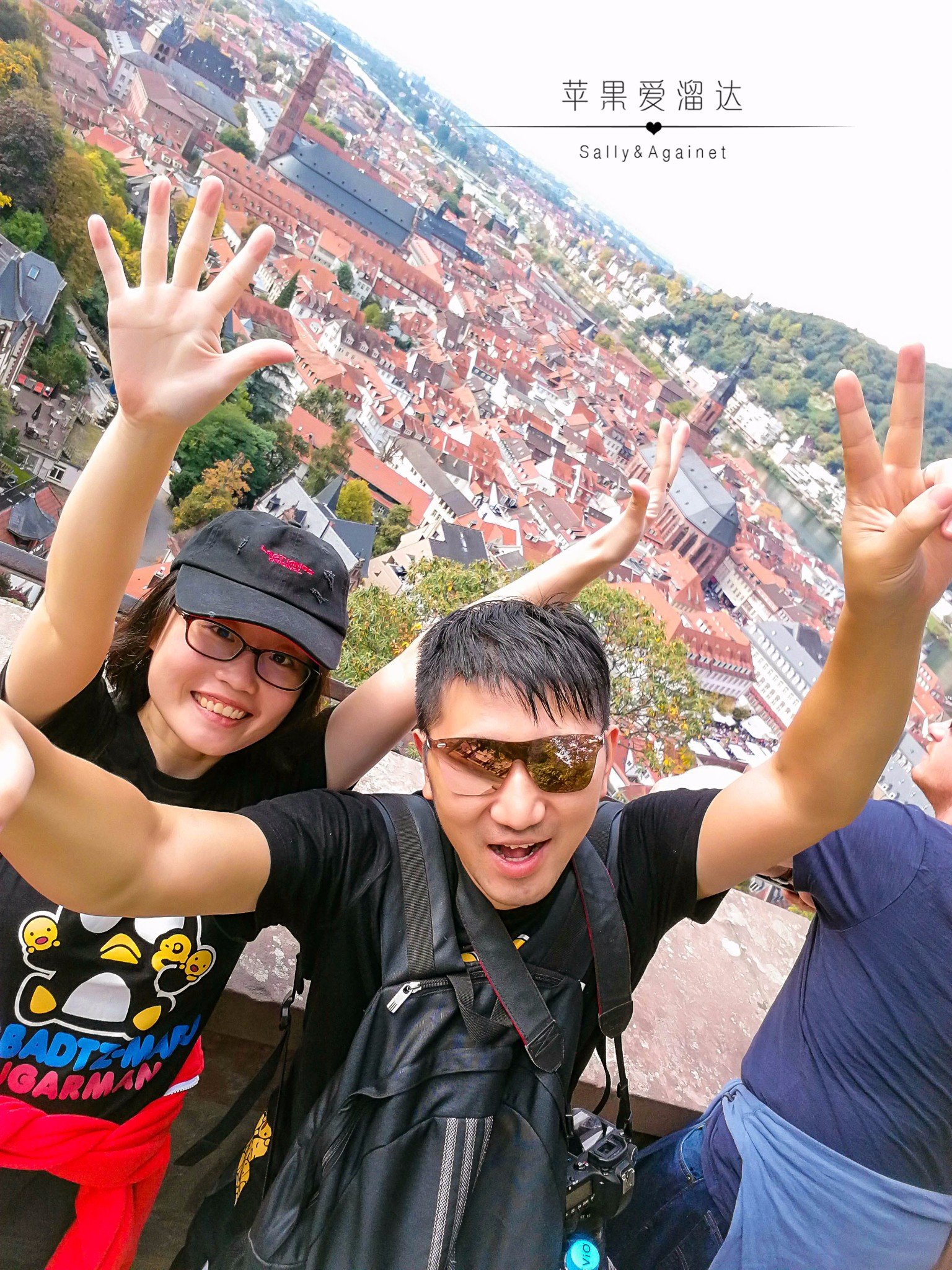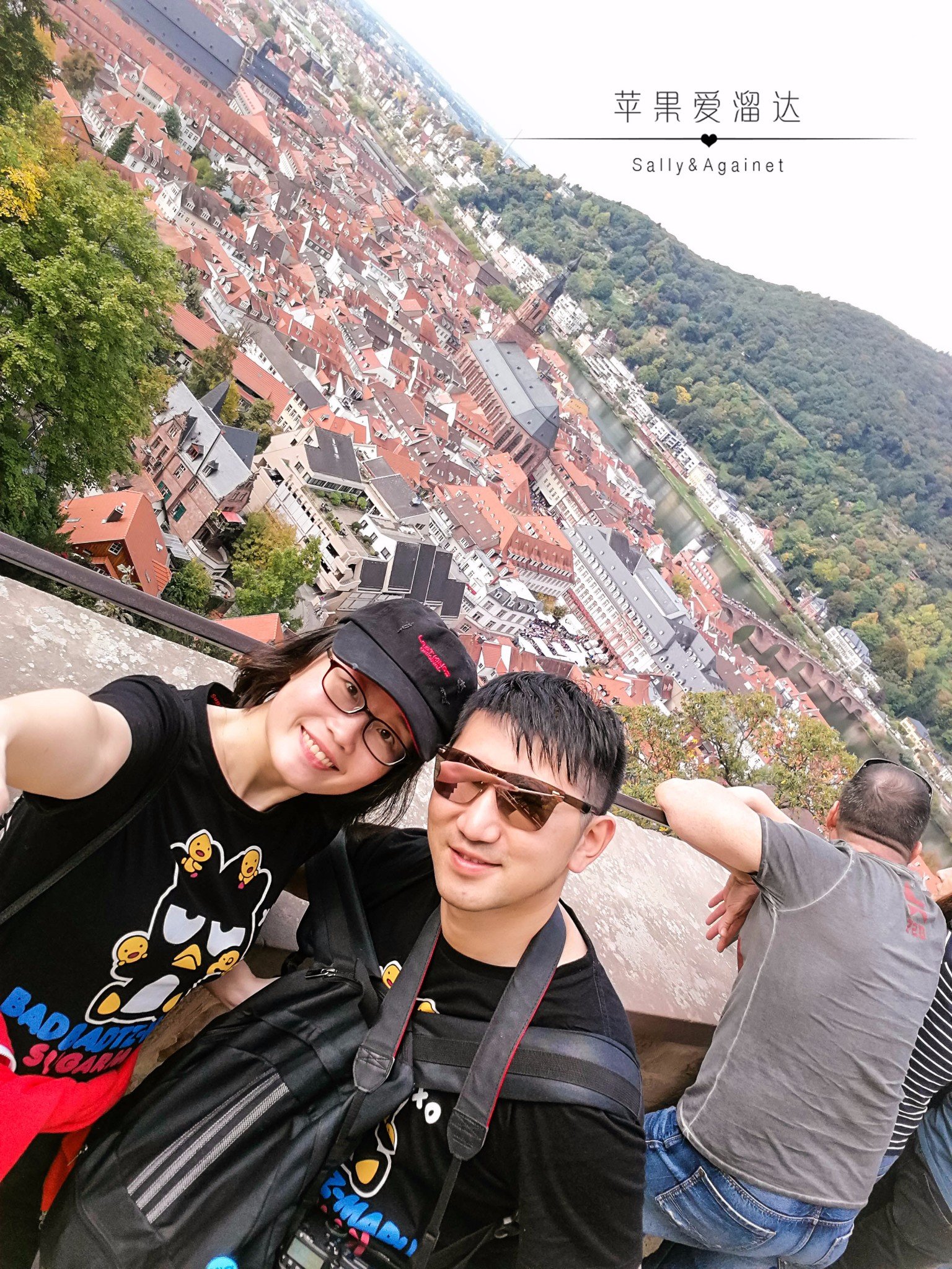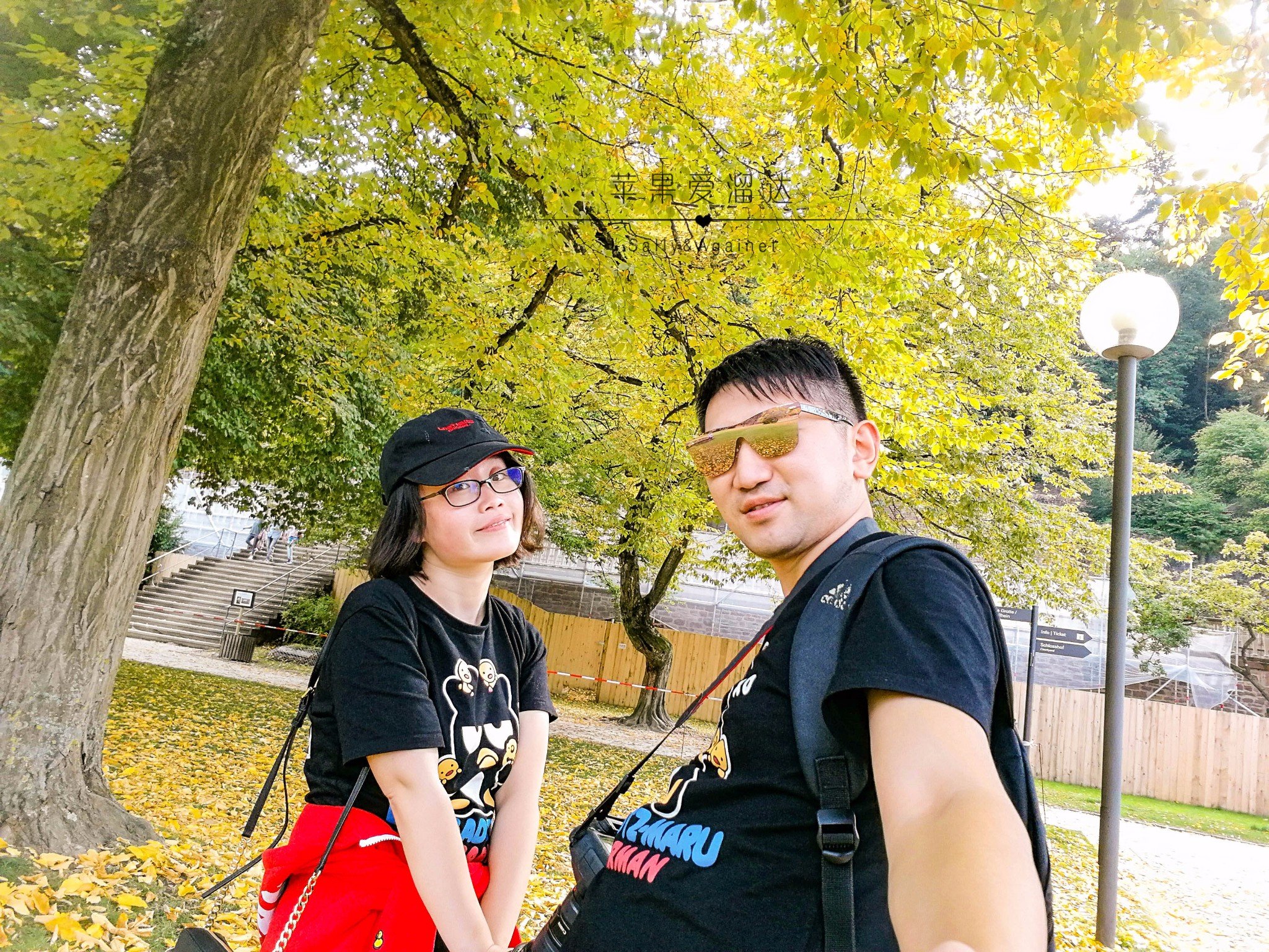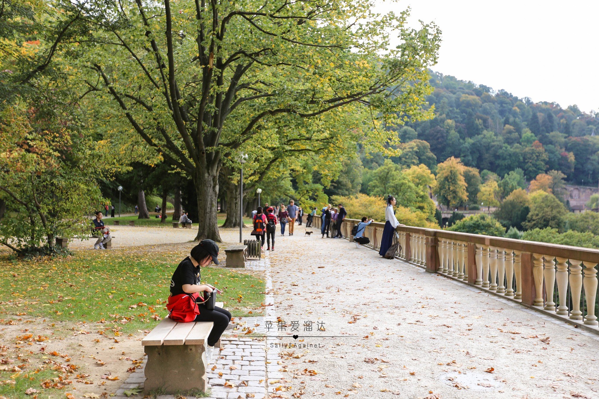 走到花园的一个角落,大家都扶着栏杆眺望着古城,我们找了个椅子小坐,突然看见有些华人穿着宋服,从身前飘然而过,问起,原来是孔子学院的,德国的歌德学院和我们的孔子学院相仿,所以在南德,可以看到很多孔子学院的学生穿着古风的长袍飘然而过,但他们也被这海德堡的秋色所吸引,久久不愿离去。