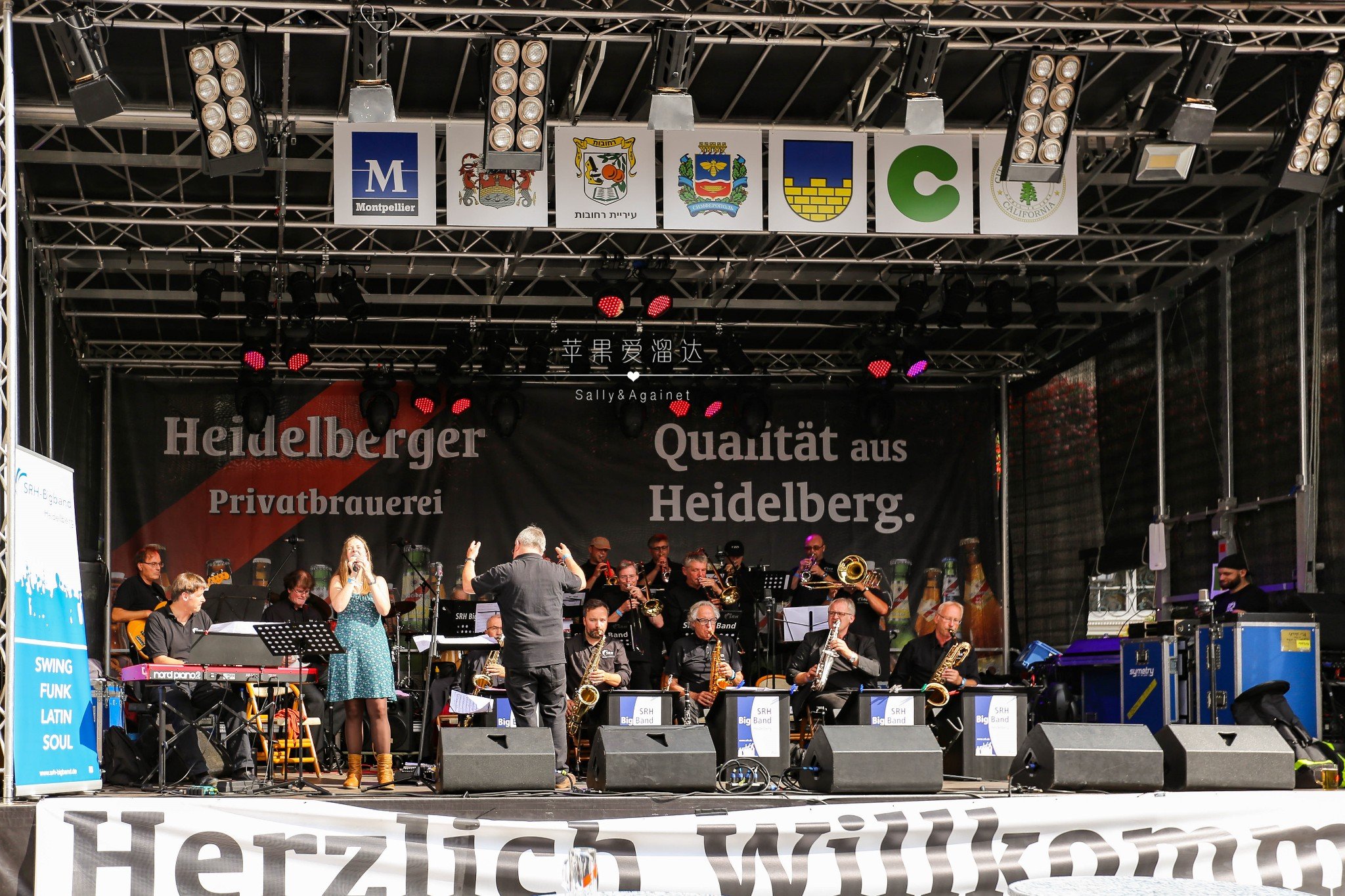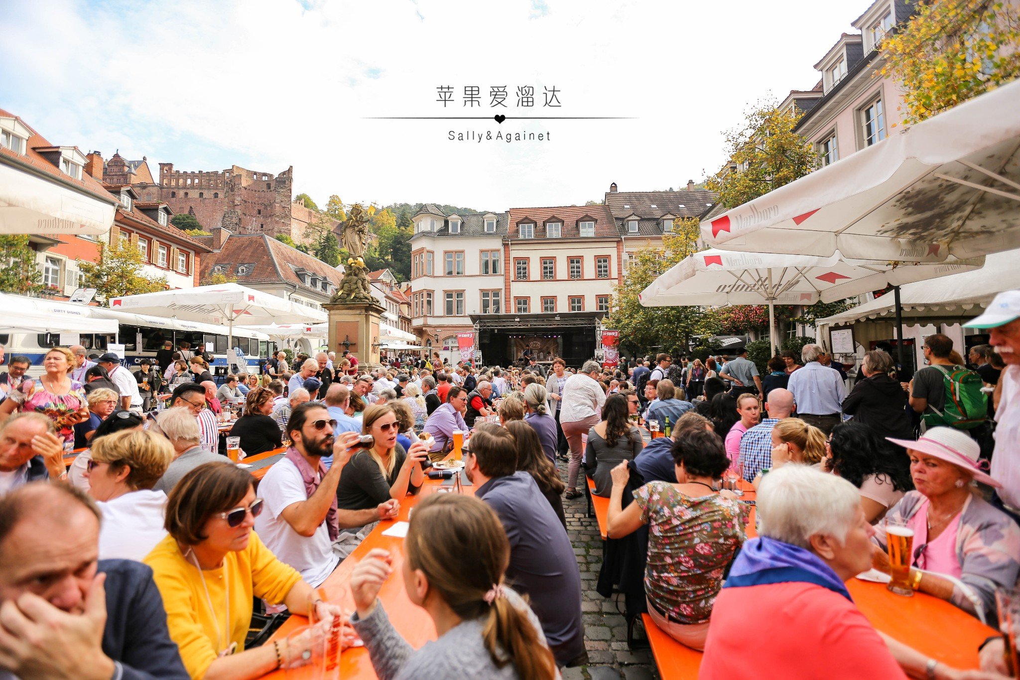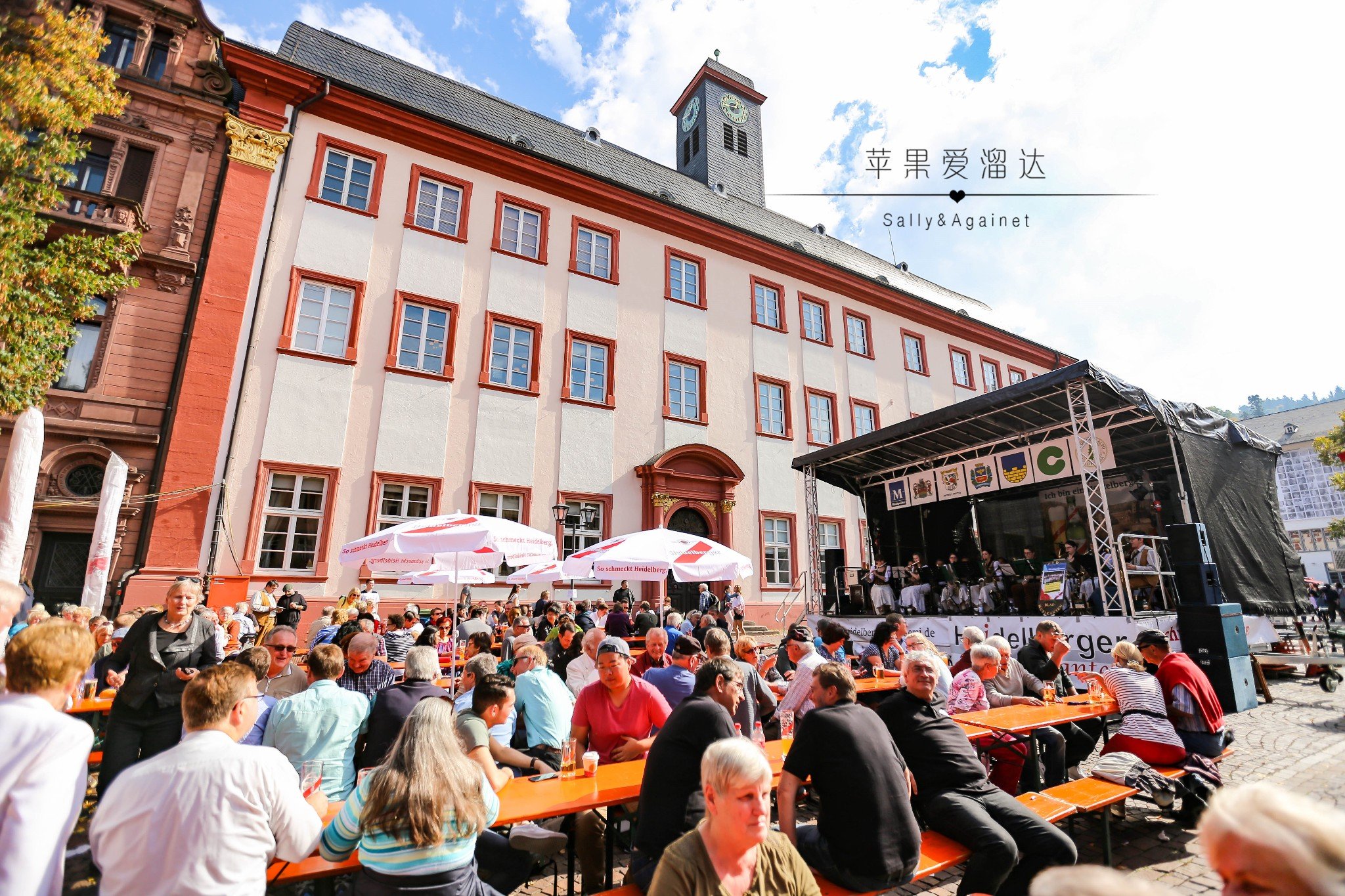 海德堡古城里有很多广场,广场都不大,但每个广场都搭了个台子,整个秋节期间都有各个乐队表演,每个舞台的乐队风格不同,这家是充满民族风的交响乐团,这里坐的人们年级也都大一些,大家在阳光下喝着啤酒,吃着肉,听着乐队,多么美好的下午。