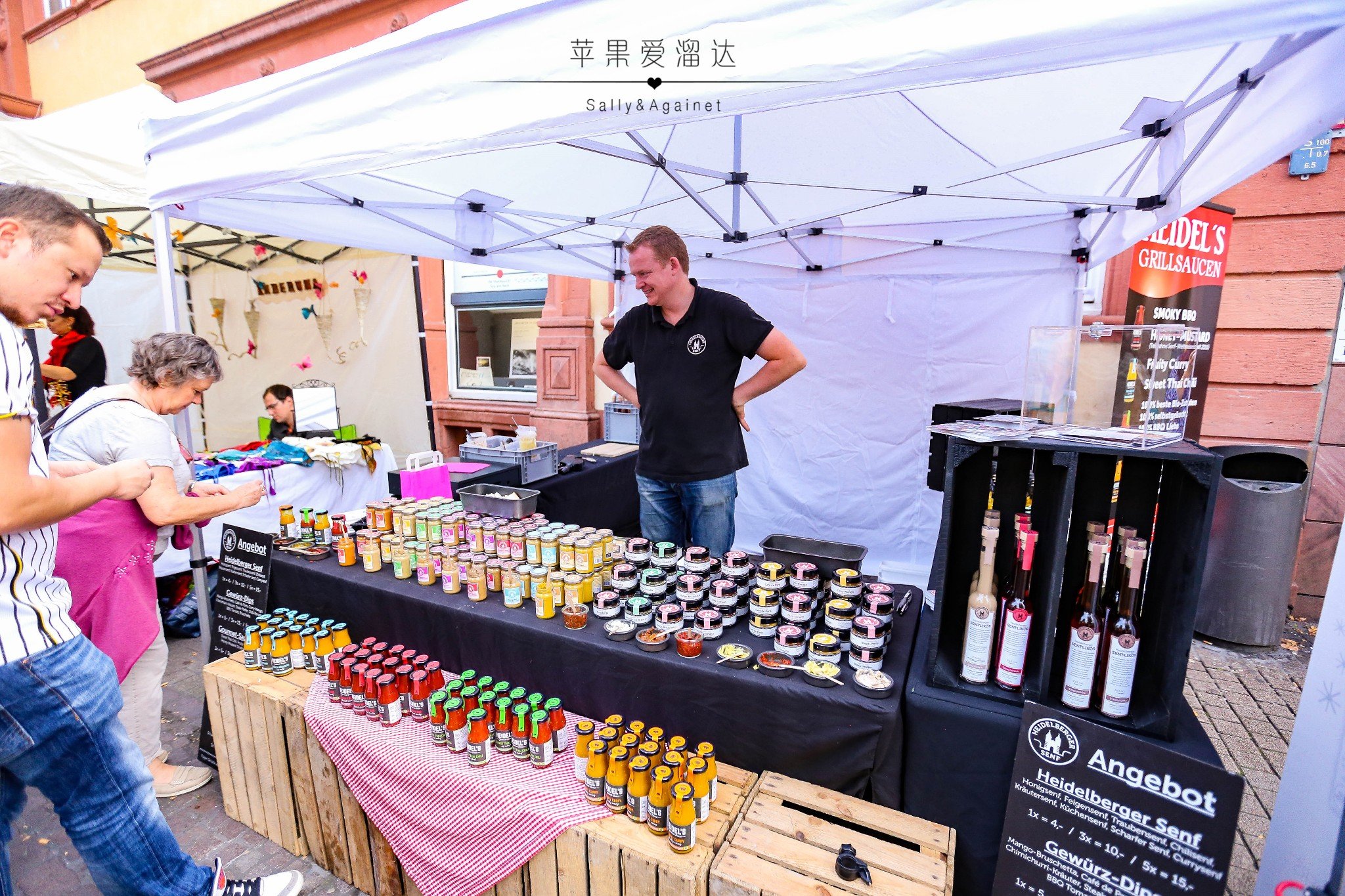 这家老板卖自己家做的果酱,还有自家酒庄的新酒,因为海德堡离著名的葡萄酒产区莱茵河谷非常近,莱茵河谷有很多小酒庄,那些酒庄的小老板们秋节也会把每年的新酒都拿来给大家品尝一下,可惜这家不提供试喝,他们家的果酱坐的非常诱人而且包装精致,路过的人都不由自主的买两罐回家尝一尝,相比那种工厂产出的果酱,这种纯手工的果酱果香浓郁的多了。