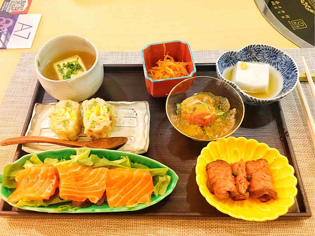 #去哪儿聪明旅行家# 今天非常开心能获得@去哪儿聪明旅行家@上海美食-咕嘟妈咪提供的腔调料理免费试吃活动的机会。横丁京锅屋位于浦东八佰伴附近,9号线商城路2号口出来就是,餐厅在商场2楼,整个2楼都是日式美食街,(出电梯就送了一个棉花糖,哈哈),装修也比较日式。电梯出来,过小桥,对面就是京锅屋,由于提前预定,位置也安排比较安静的地方,今天的餐品大致是八寸,日式清汤锅,泡饭,日式甜点。对于不爱吃刺身的人来说日料这个搭配还是可以尝试的。 #八寸,七八个前菜,印象比较好的是牛肉,芝麻豆腐和蟹肉蛋卷。牛肉比较新鲜,熟度正好,配青花椒调味,比较清爽。芝麻豆腐口感绵密。蟹肉蛋卷外层蛋卷很薄,很脆,关键还是热的。 #清汤锅,牛肉+蔬菜的简单搭配,和国内的火锅相比,这个锅子就略显“小气”了,不过简单清淡也是清汤锅的特色。服务员会根据个人口味帮你调好一碗汤,牛肉烫5-6秒就可以吃了,很嫩。吃完后的汤底+泡饭+菌类+芹菜叶,就当主食吃吧,味道还是不错的。 #甜品也是日式的,口感类似台湾麻薯,比麻薯更加软烂。 试吃活动结束后,身着和服的服务员小姐姐会帮你按电梯,90°鞠躬谢谢光临,呵呵。 最后非常感谢@去哪儿聪明旅行家,@上海美食-咕嘟妈咪!