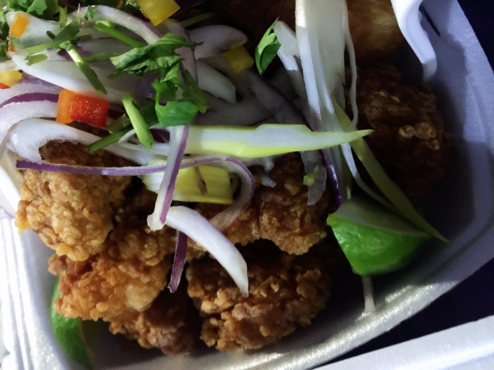 夜色,洗净,出门,吃!回到小超市那,和当地人一样, 冰镇啤酒走起,摊车上点了两份鱼,一份炸的,一份凉拌的;味道居然有种东南亚的风味,应该是柠檬的缘故吧!