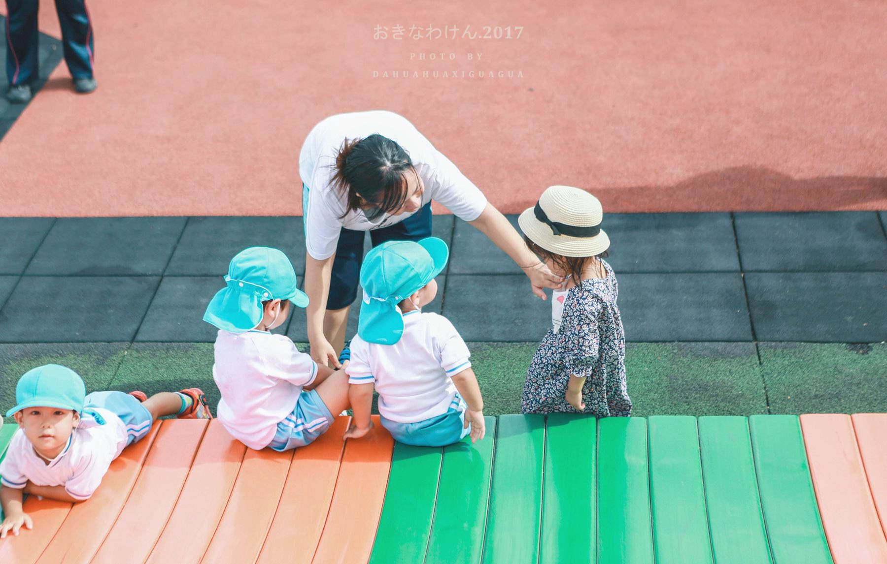 正好有一群日本保育园的小朋友来公园玩,一大群孩子,年纪都是2岁上下,就由三个老师带着。都很可爱活泼,关键还都很守纪律。豆豆坐在宽滑梯上,看着旁边有几个小朋友,就一拍手,喊“预备。。。滑”:
