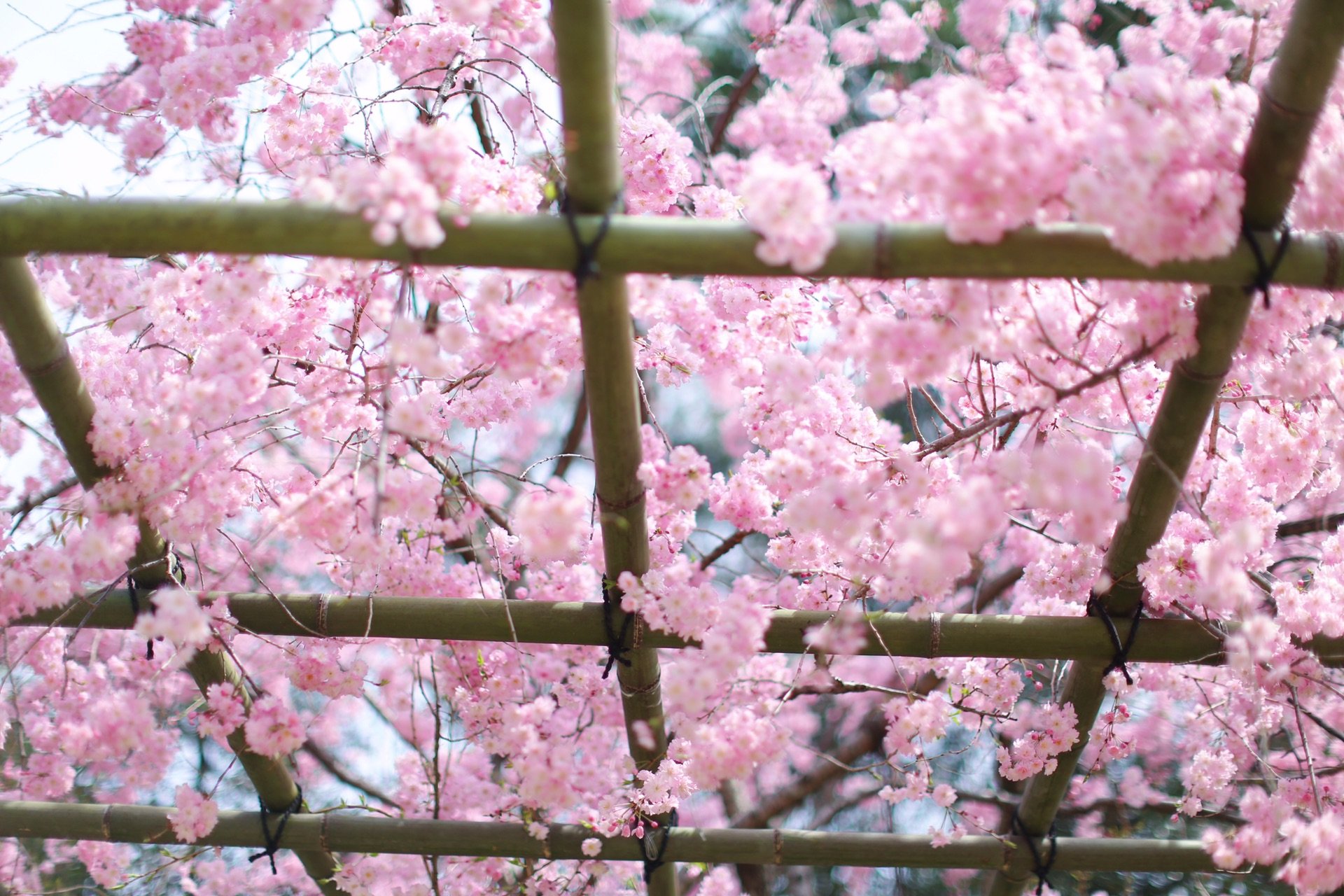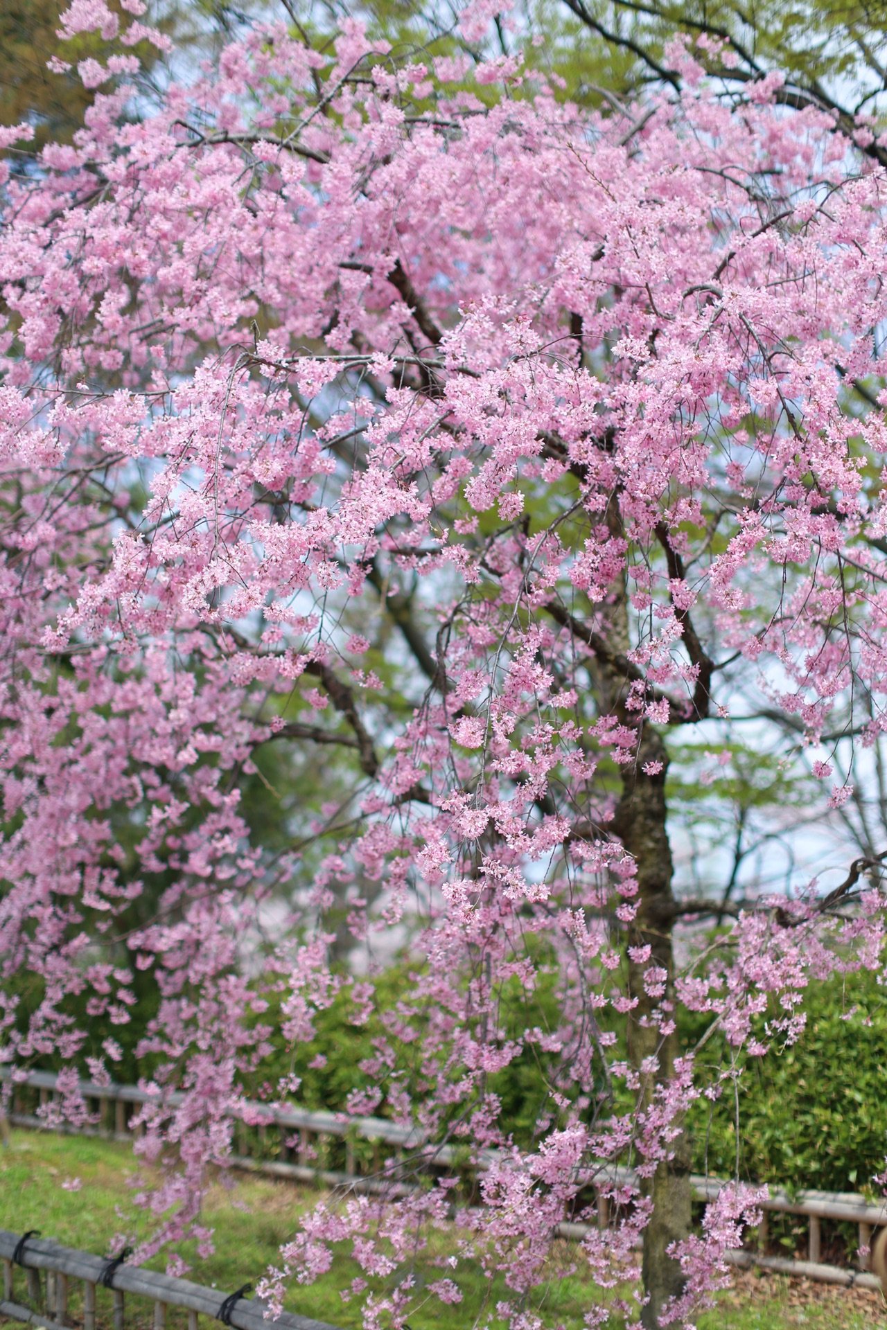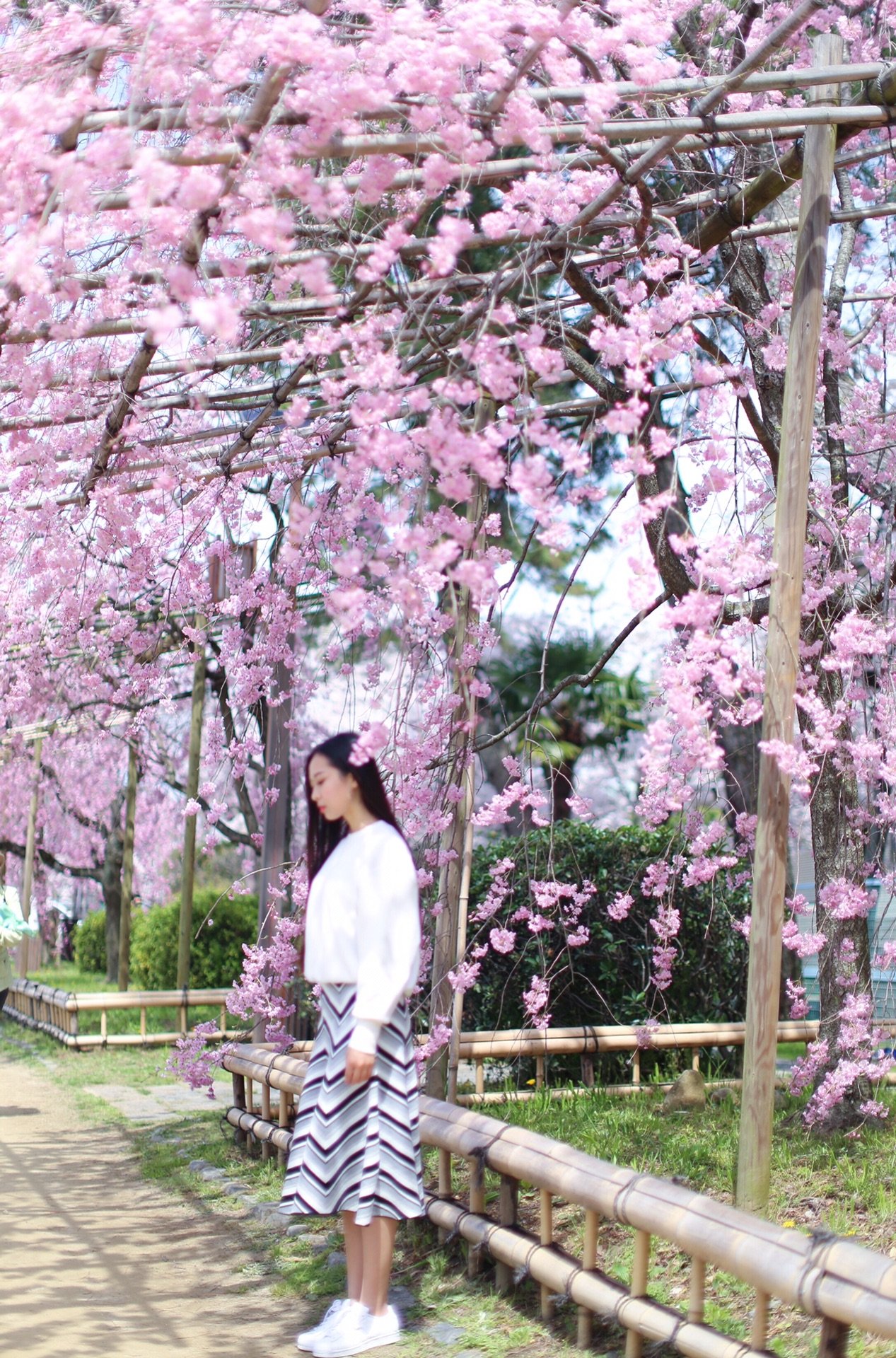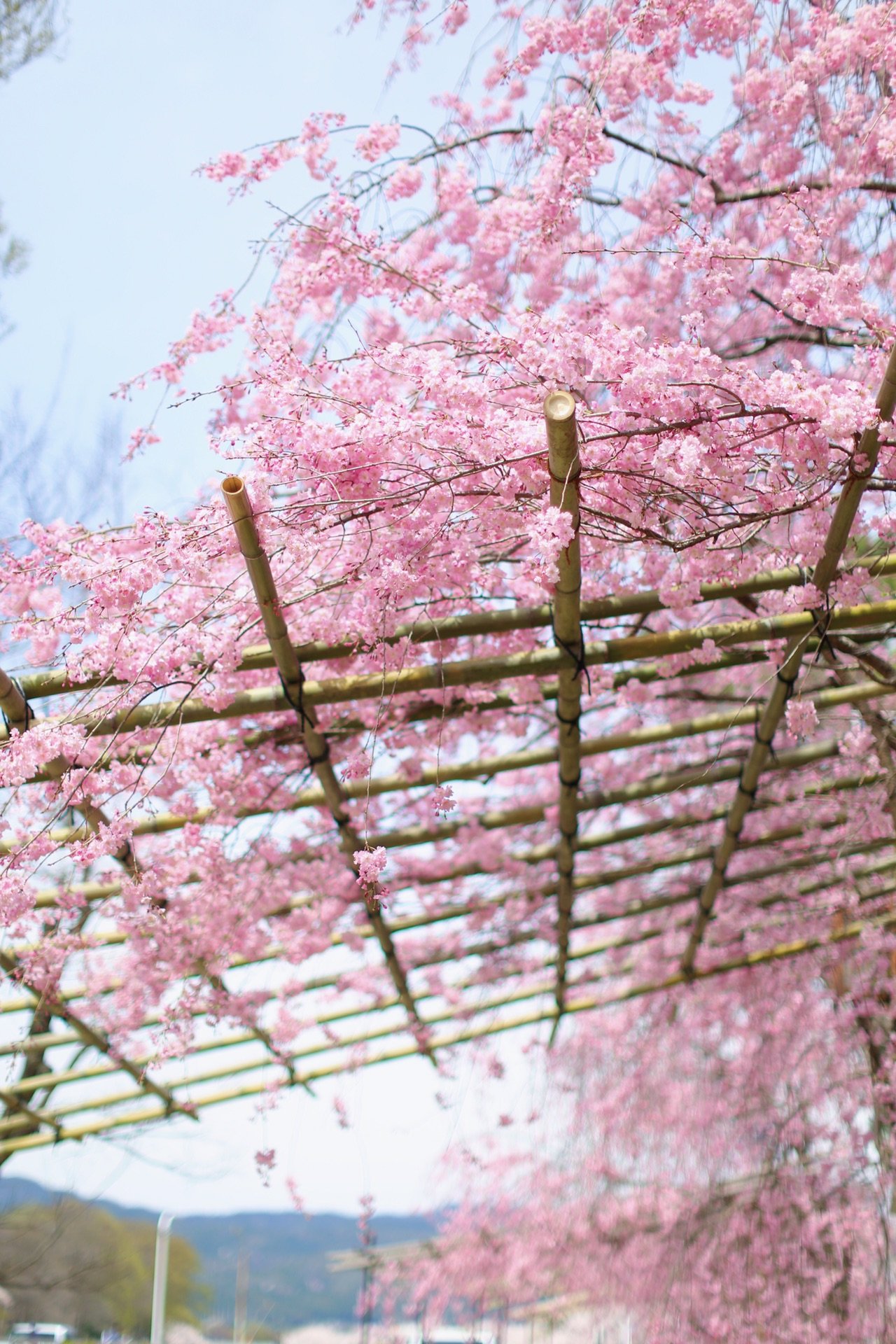 贺茂川沿道上的一处便是半木之道 这里由竹子搭出来的整排竹架 一株株樱花垂挂在架子上 形成了一条樱花隧道 这里的樱花开的相对较晚 垂枝樱品种的关系吧