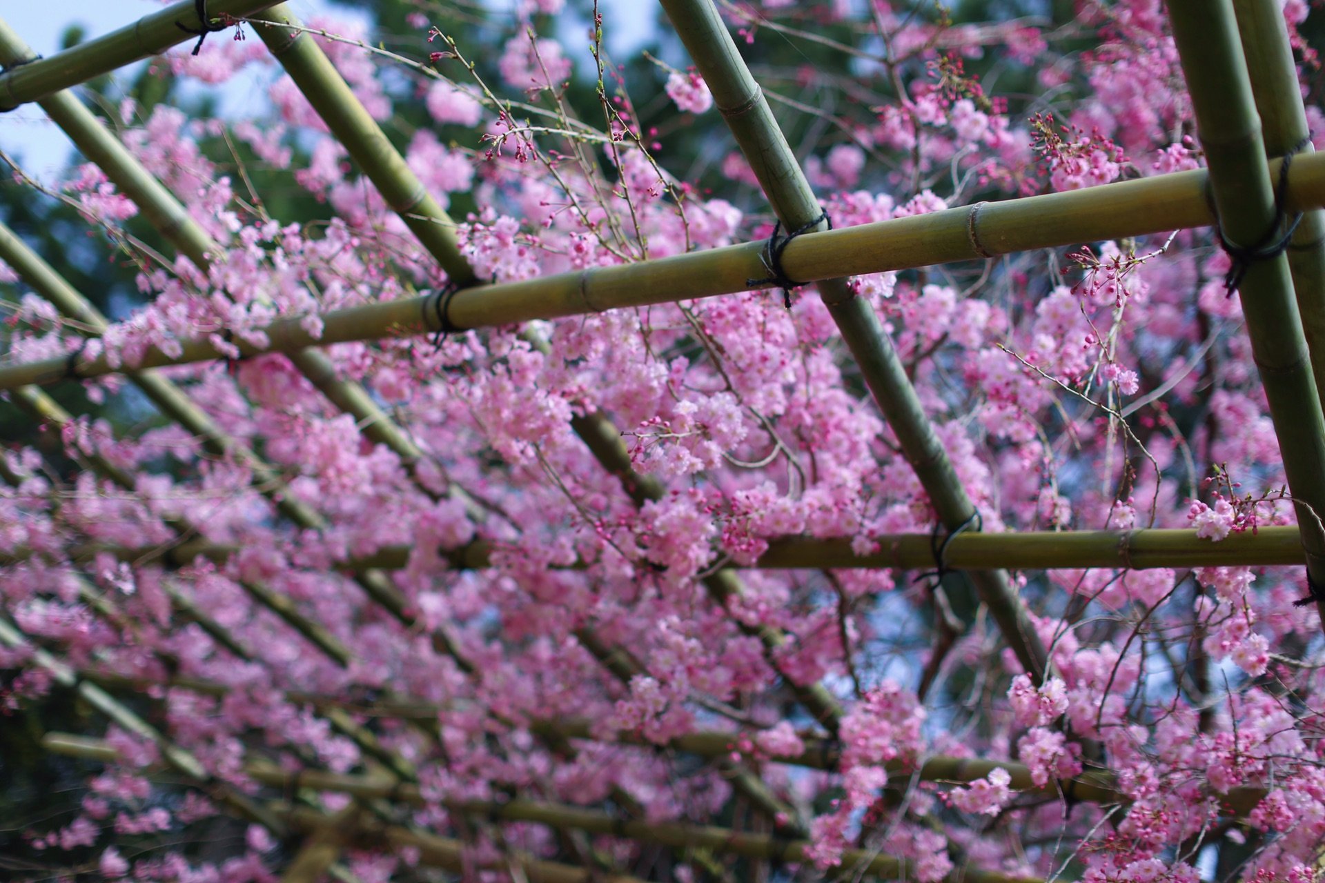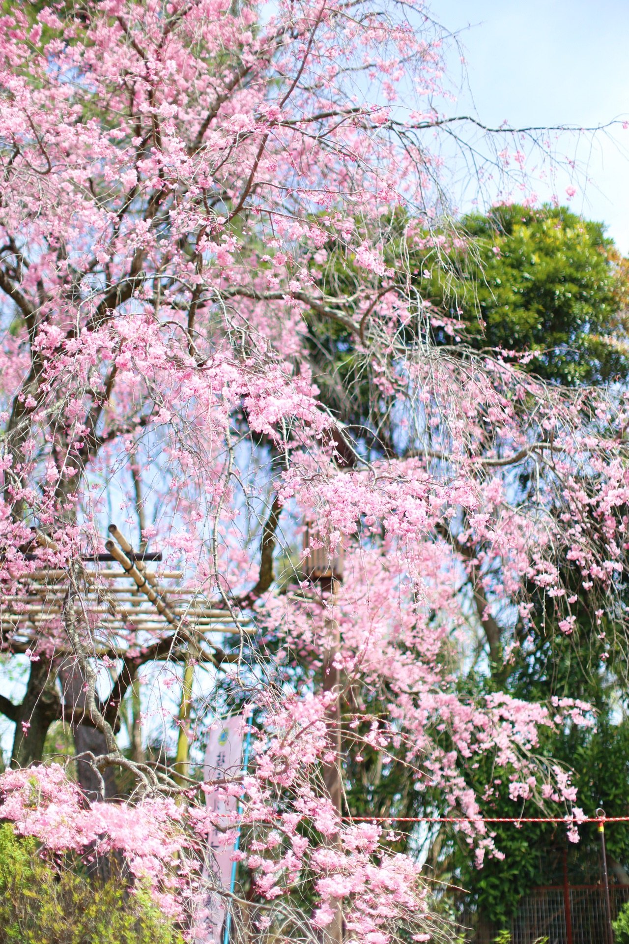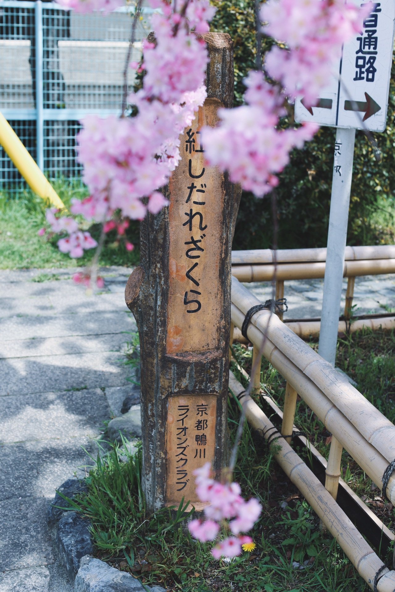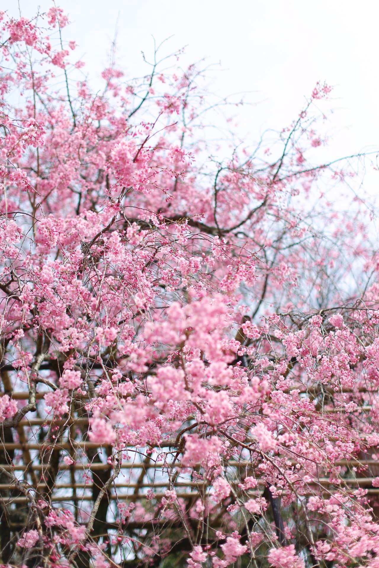 贺茂川沿道上的一处便是半木之道 这里由竹子搭出来的整排竹架 一株株樱花垂挂在架子上 形成了一条樱花隧道 这里的樱花开的相对较晚 垂枝樱品种的关系吧