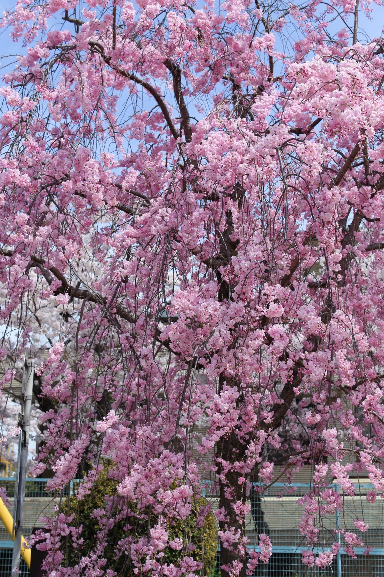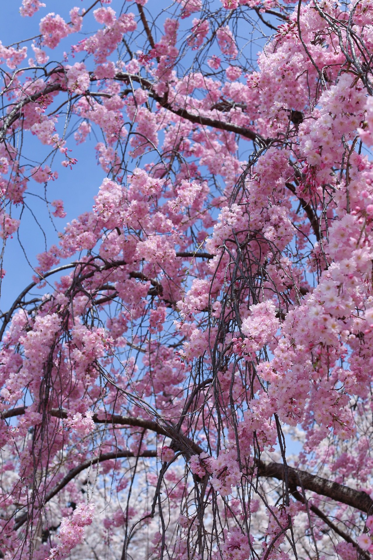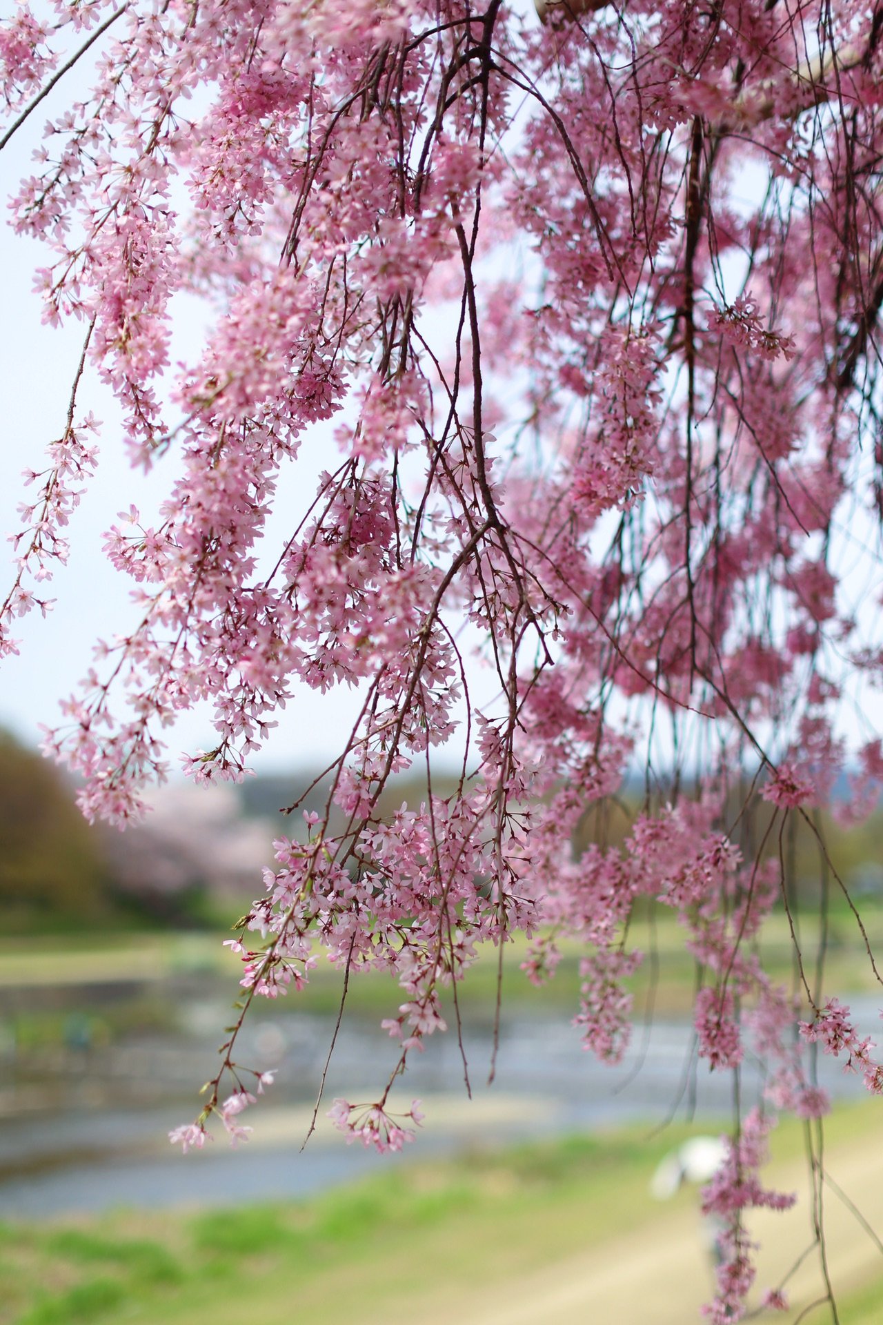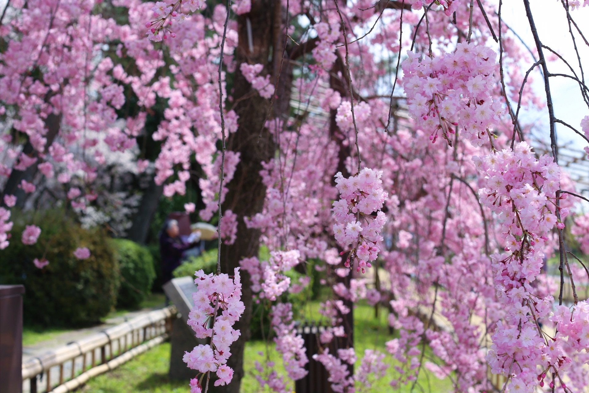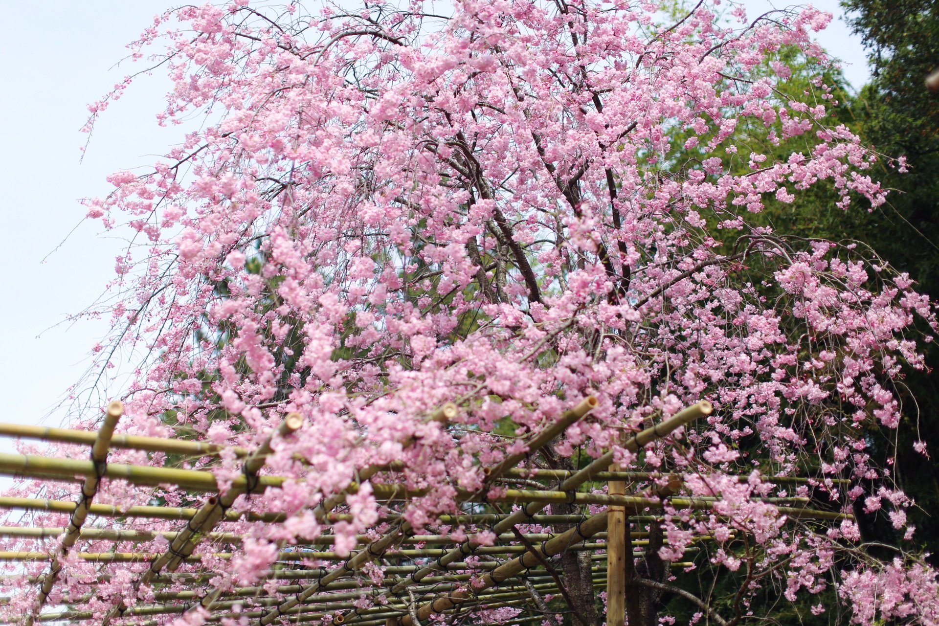 贺茂川沿道上的一处便是半木之道 这里由竹子搭出来的整排竹架 一株株樱花垂挂在架子上 形成了一条樱花隧道 这里的樱花开的相对较晚 垂枝樱品种的关系吧