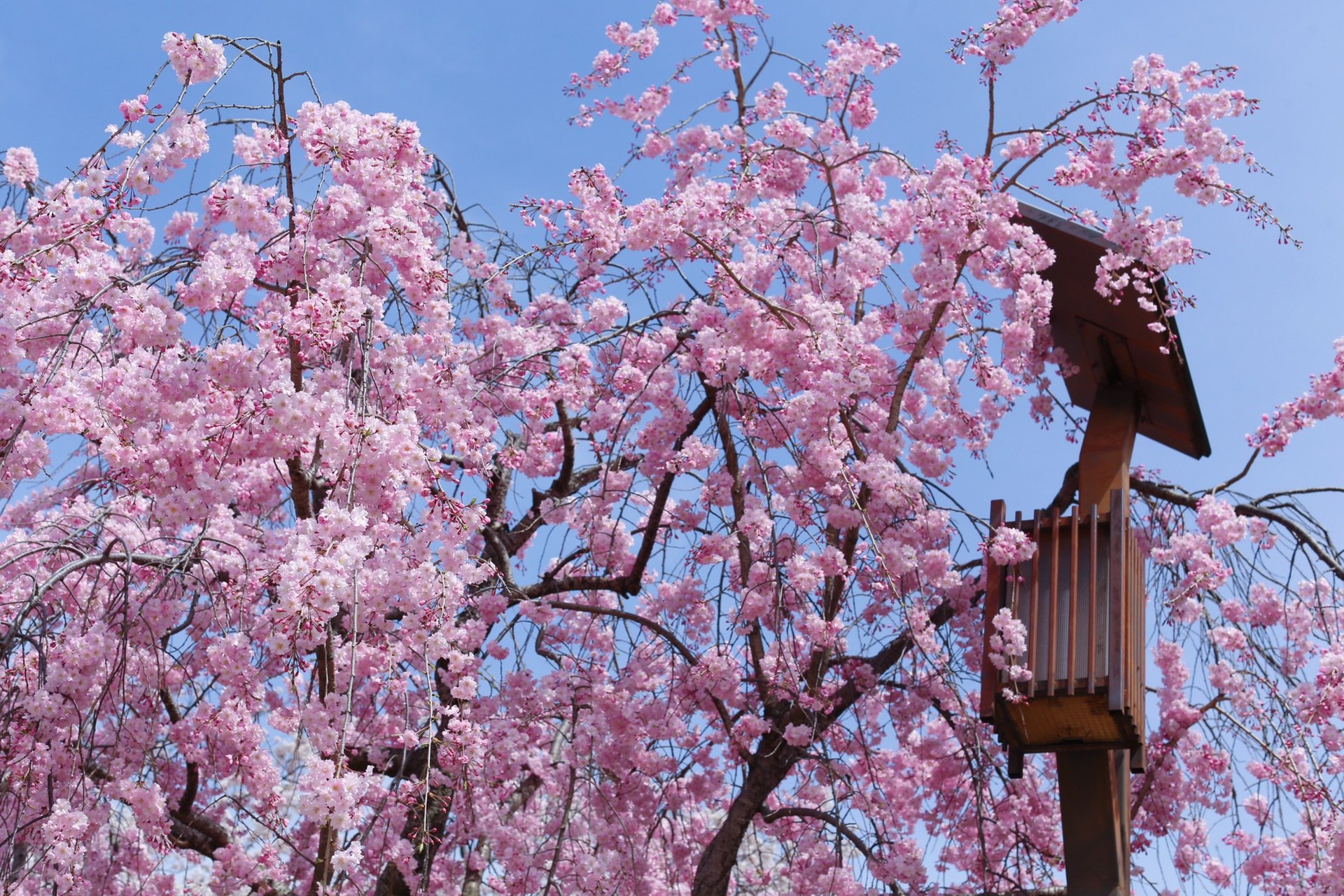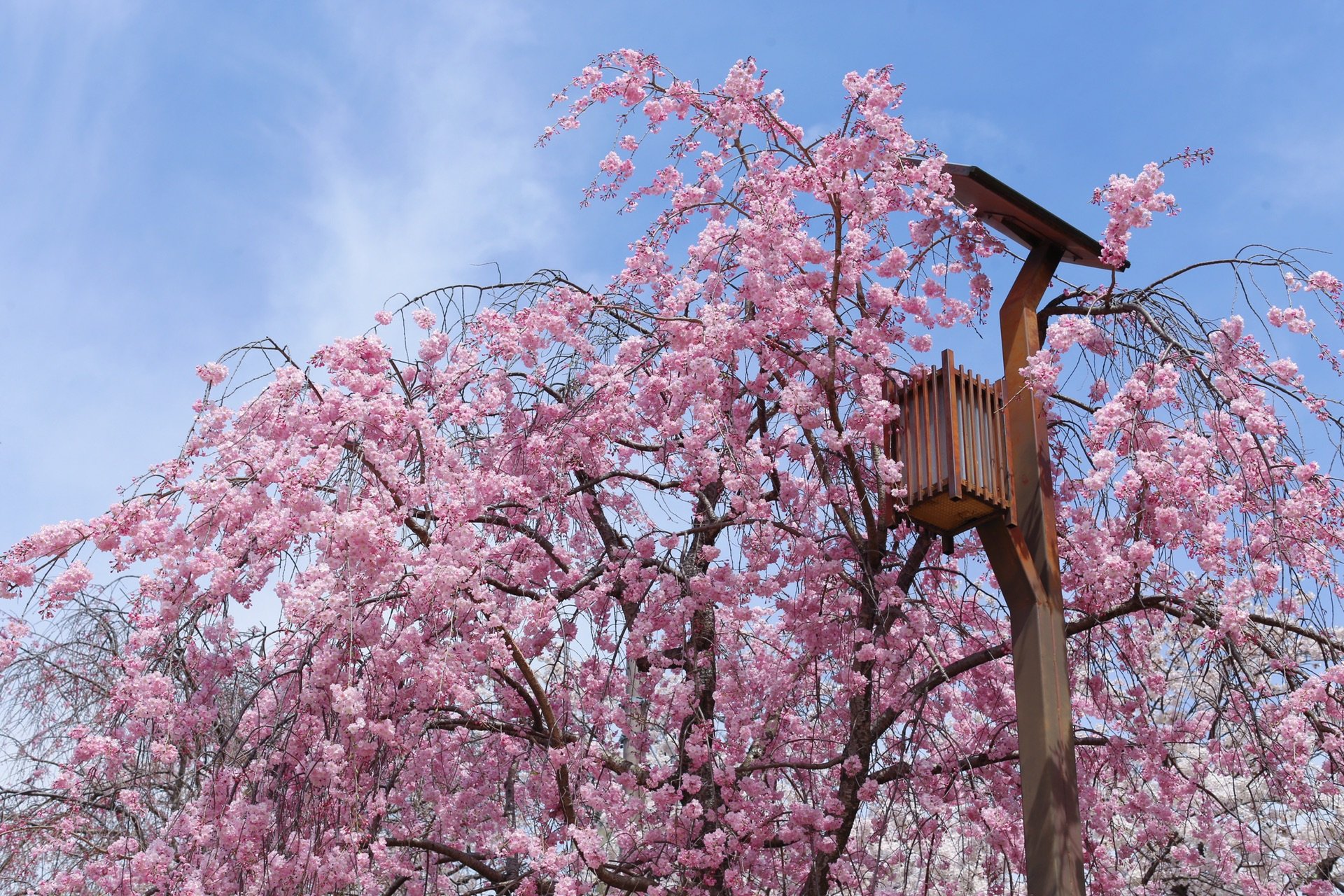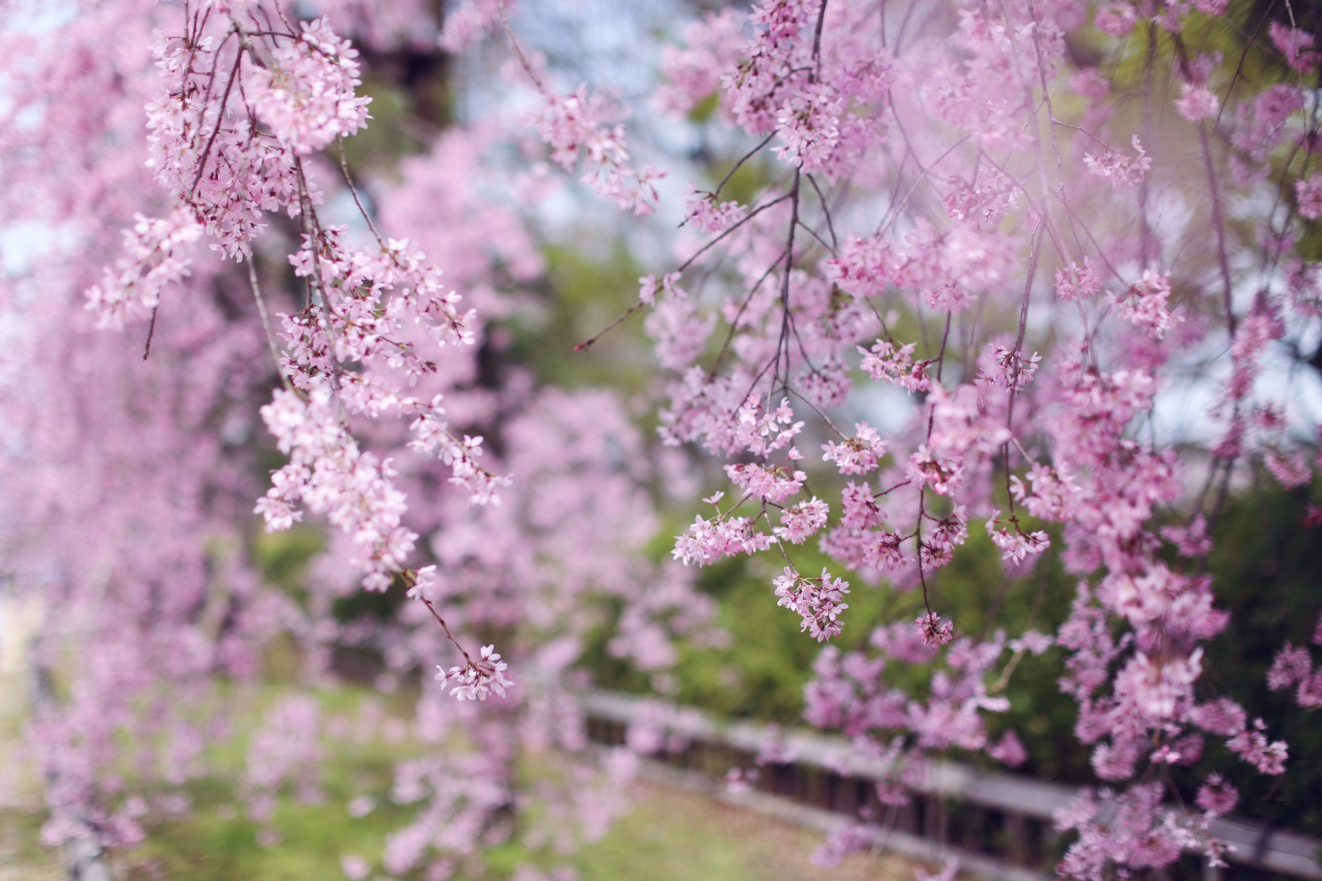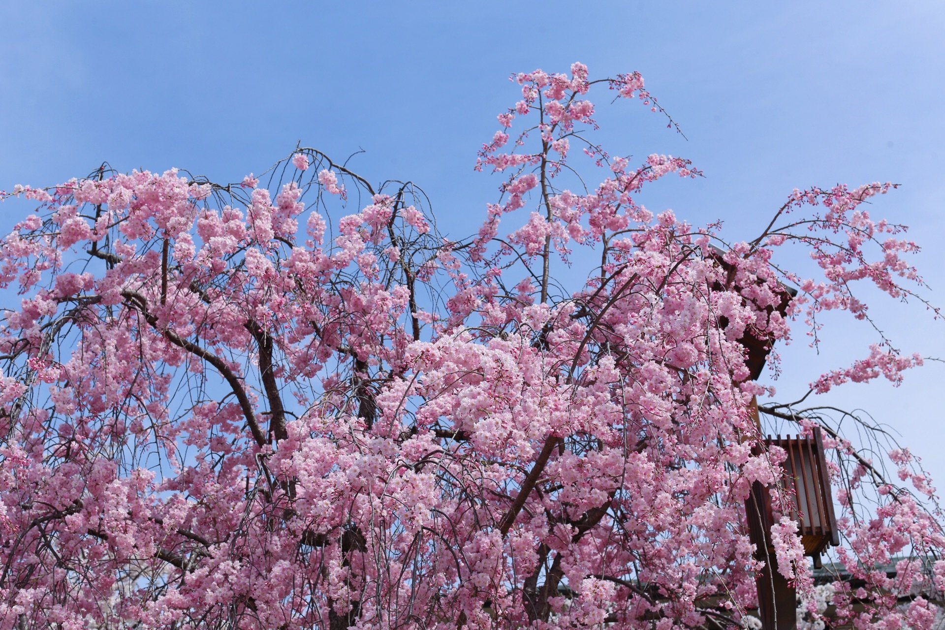 贺茂川沿道上的一处便是半木之道 这里由竹子搭出来的整排竹架 一株株樱花垂挂在架子上 形成了一条樱花隧道 这里的樱花开的相对较晚 垂枝樱品种的关系吧