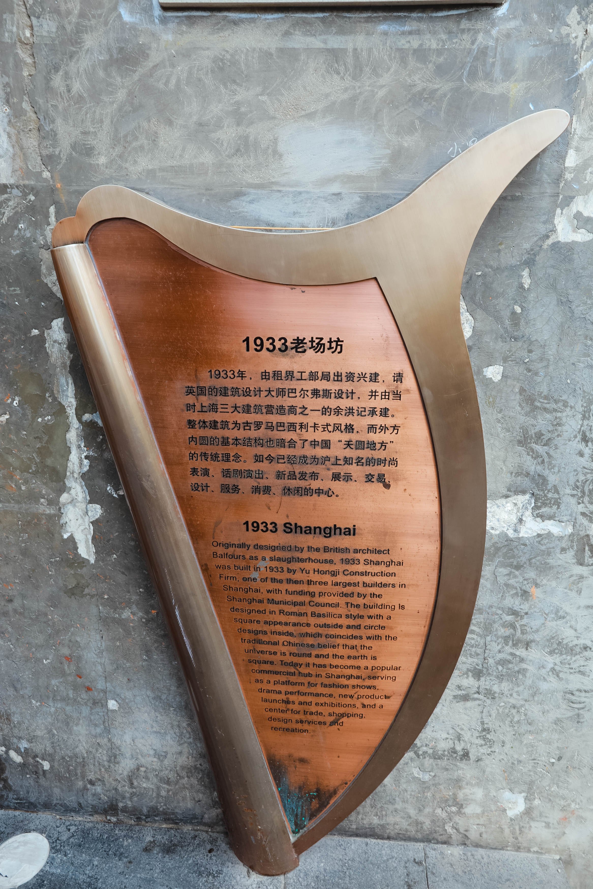 1933老场坊的建筑融汇了东西方特色,整体建筑可见古罗马巴西利卡式风格,而外方内圆的基本结构也暗合了中国风水学风水学说中 “天圆地方”的传统理念。光影和空间的无穷变幻呈现出一个独一无二的建筑奇葩。